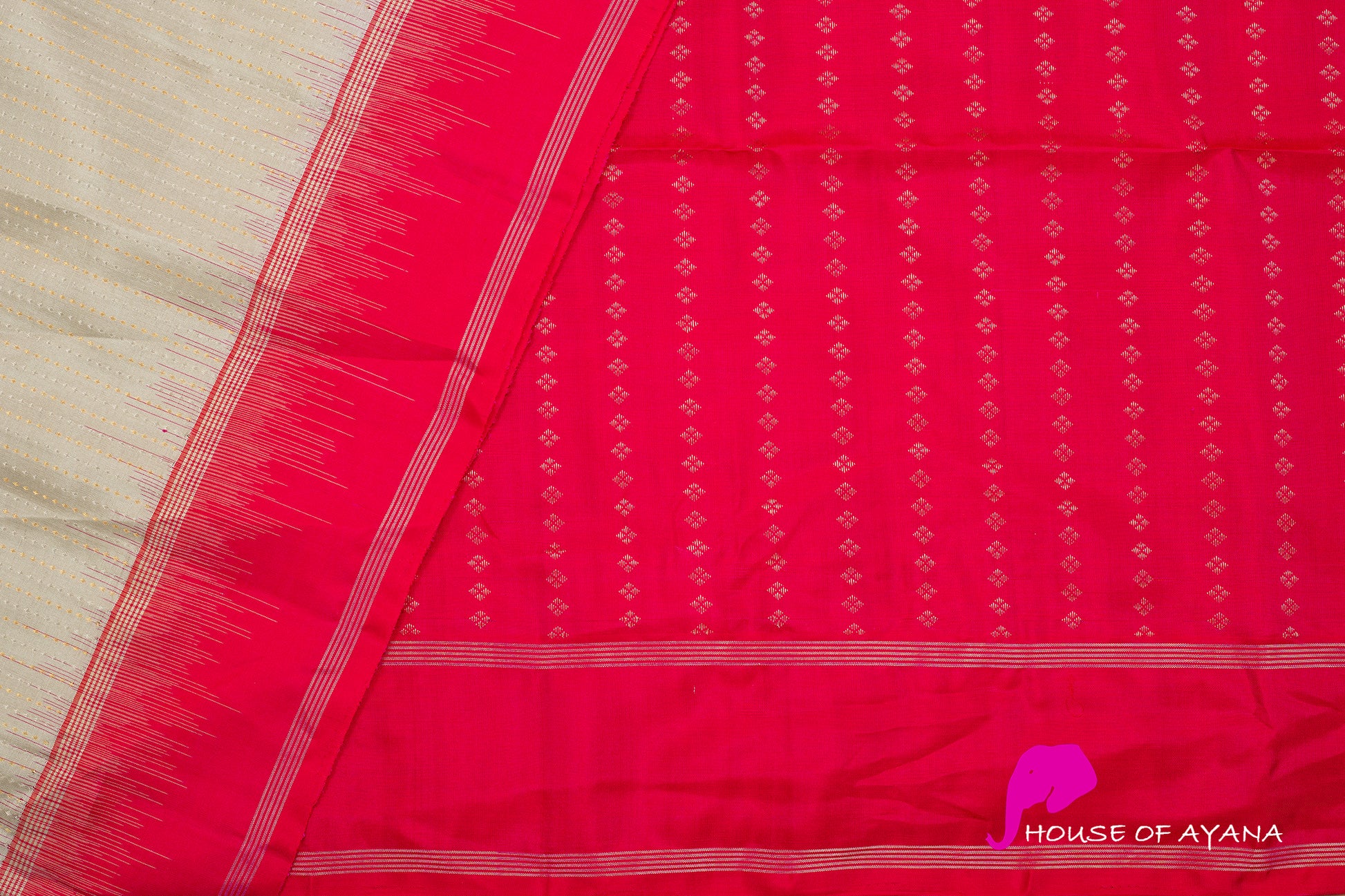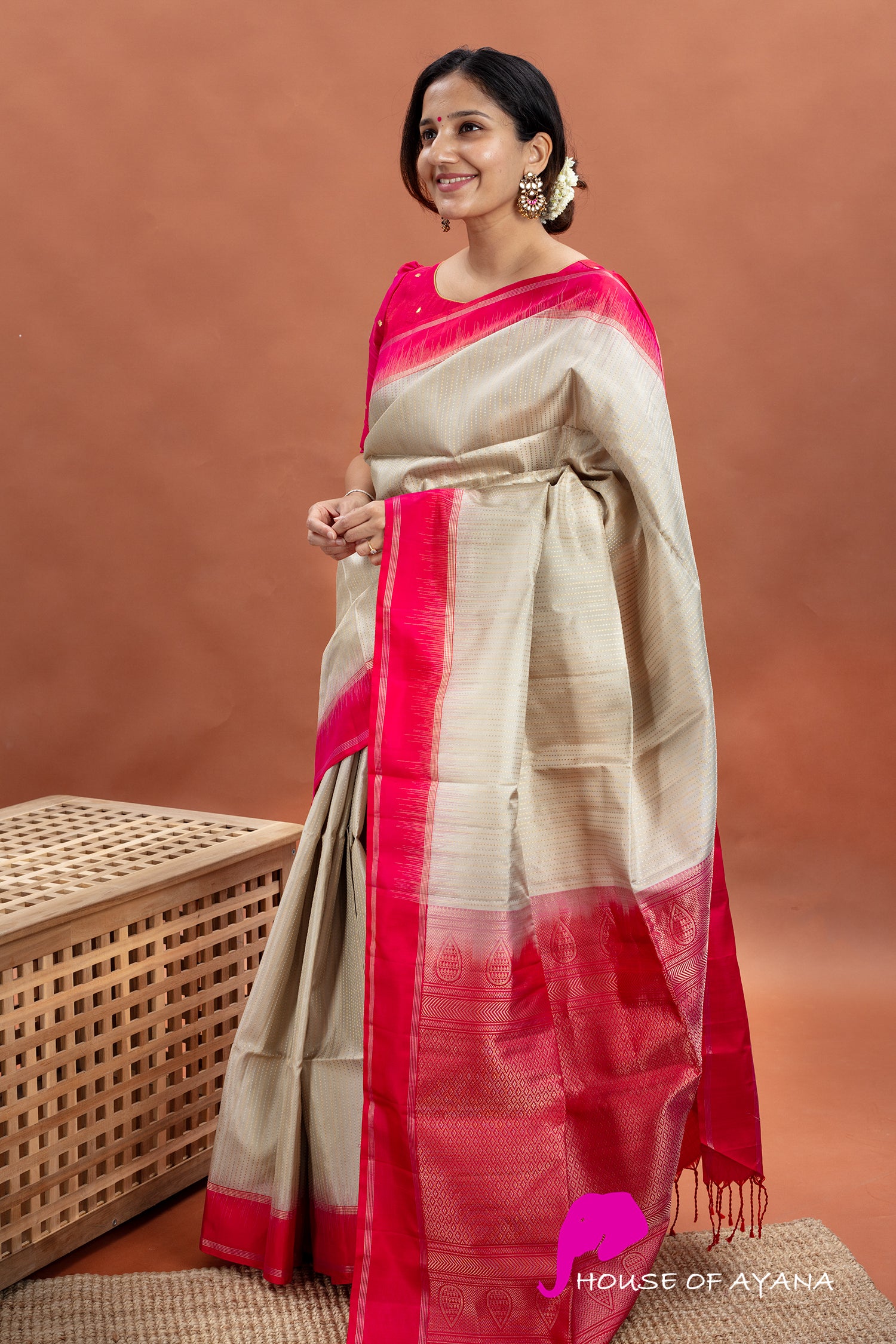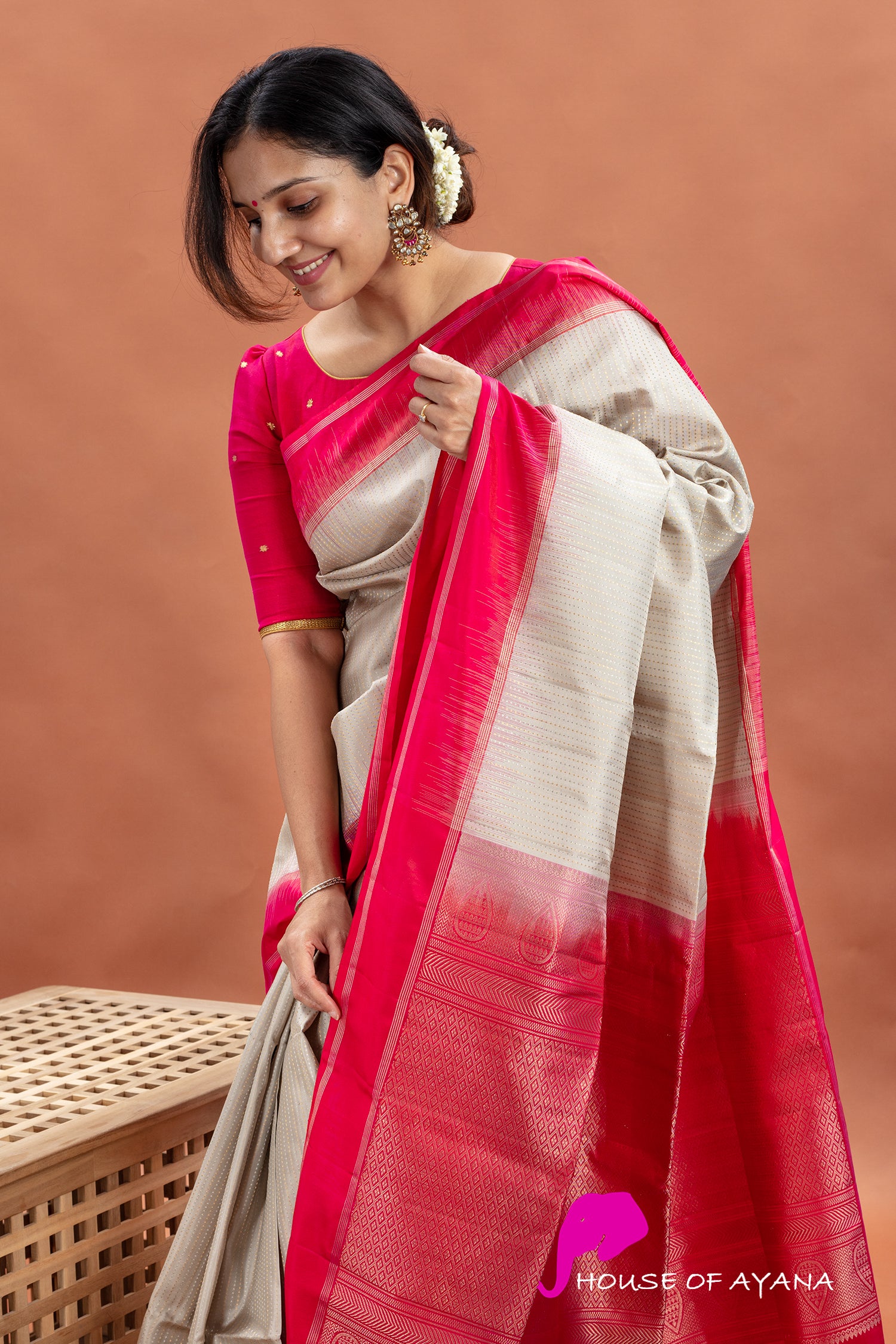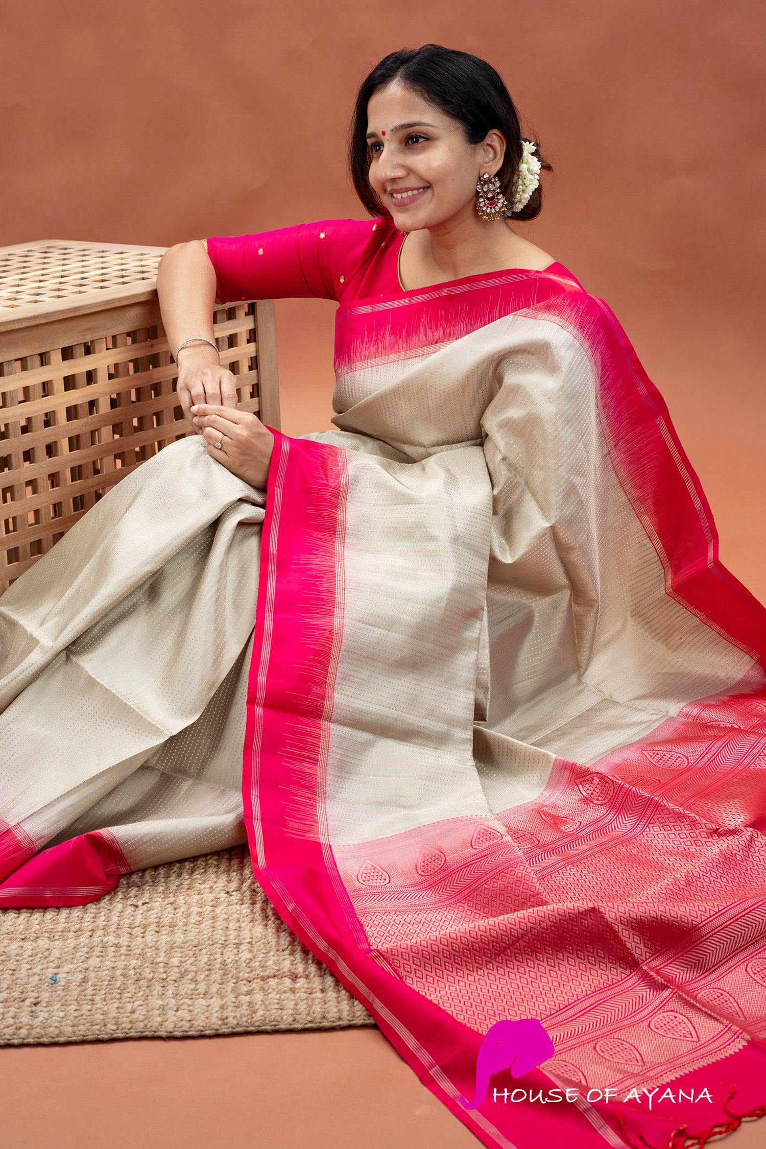 - Kanjivaram lightweight silk saree, handwoven with contrast zari borders and grand pallu