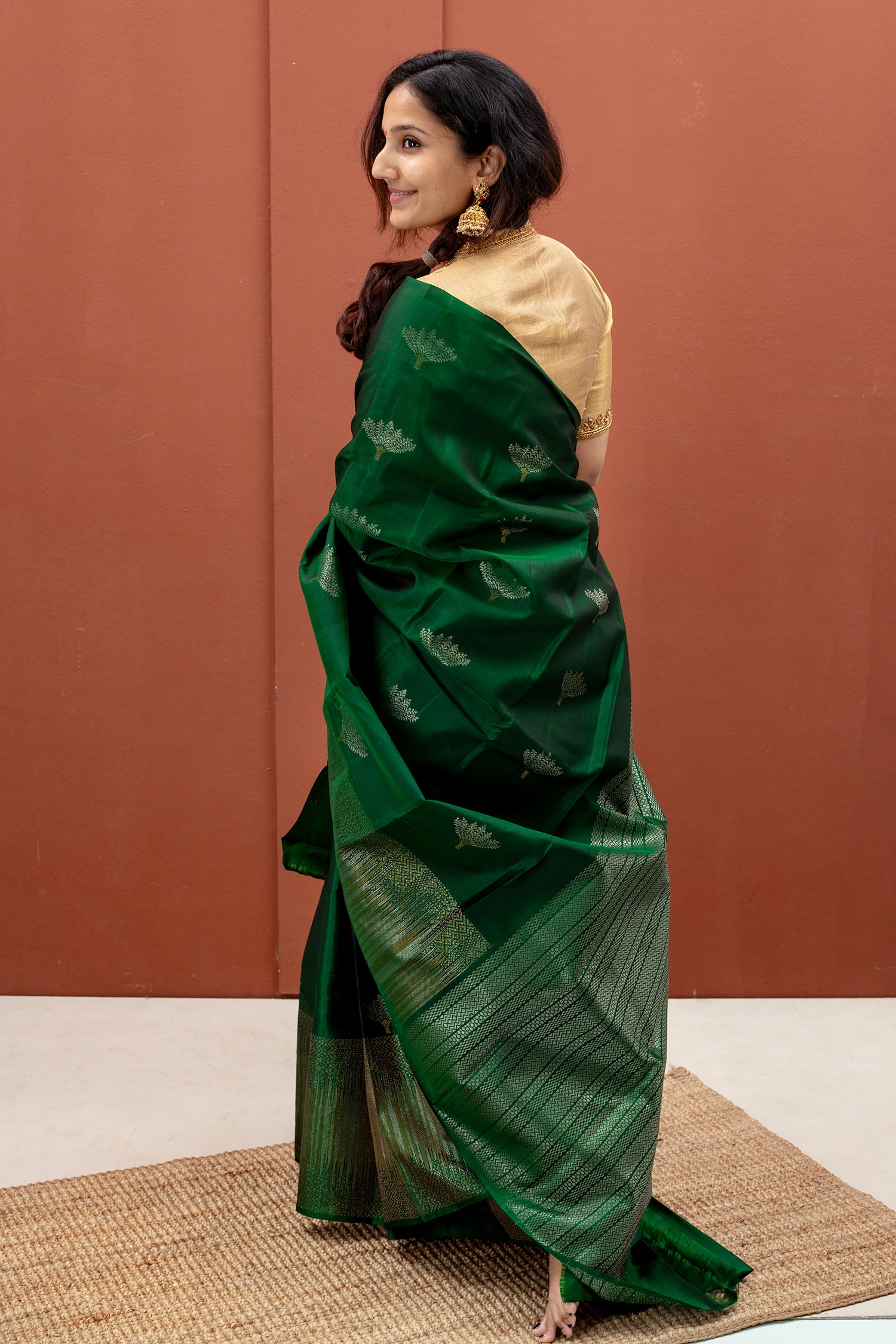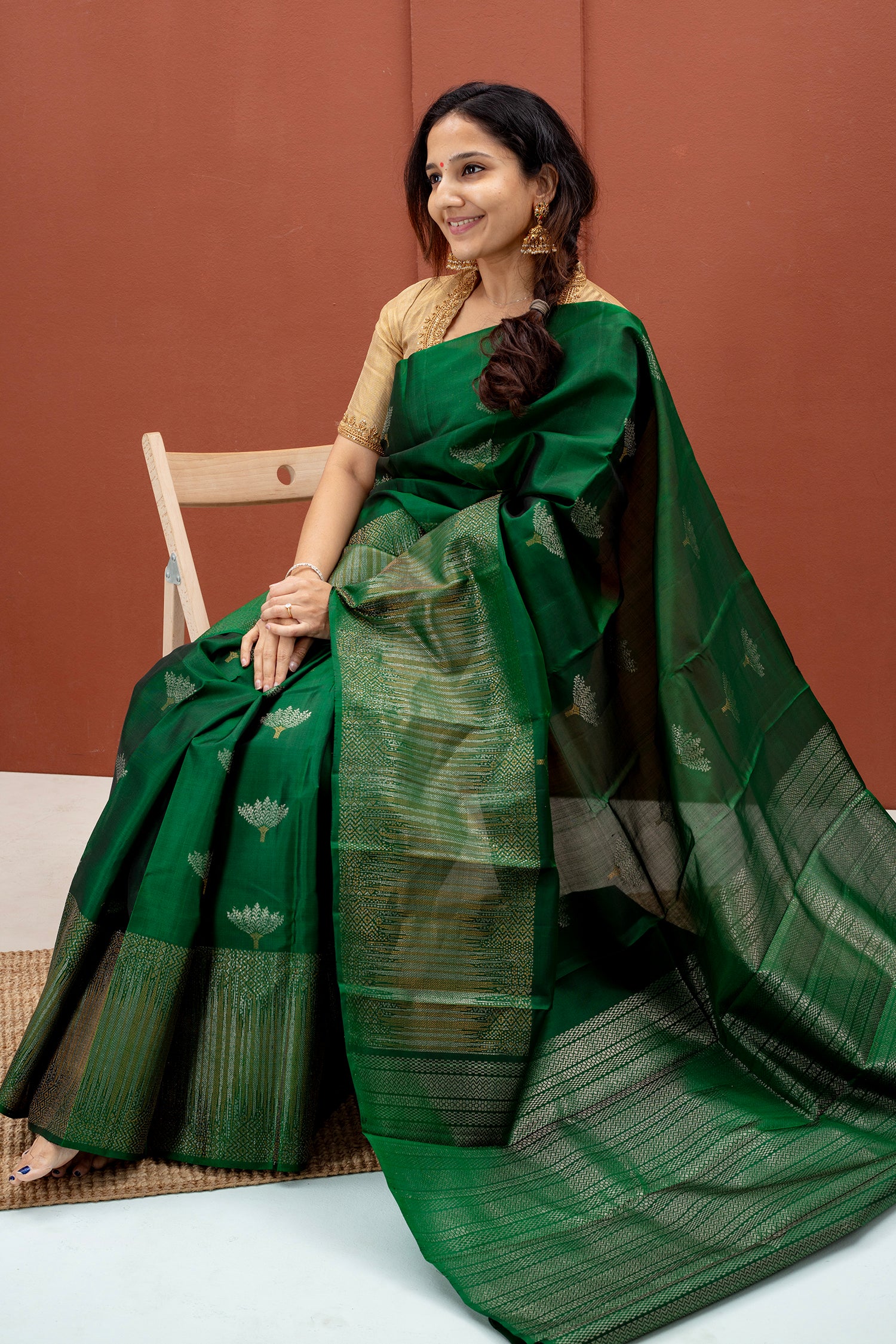 - Kanjivaram lightweight silk saree, handwoven with zari borders and pallu