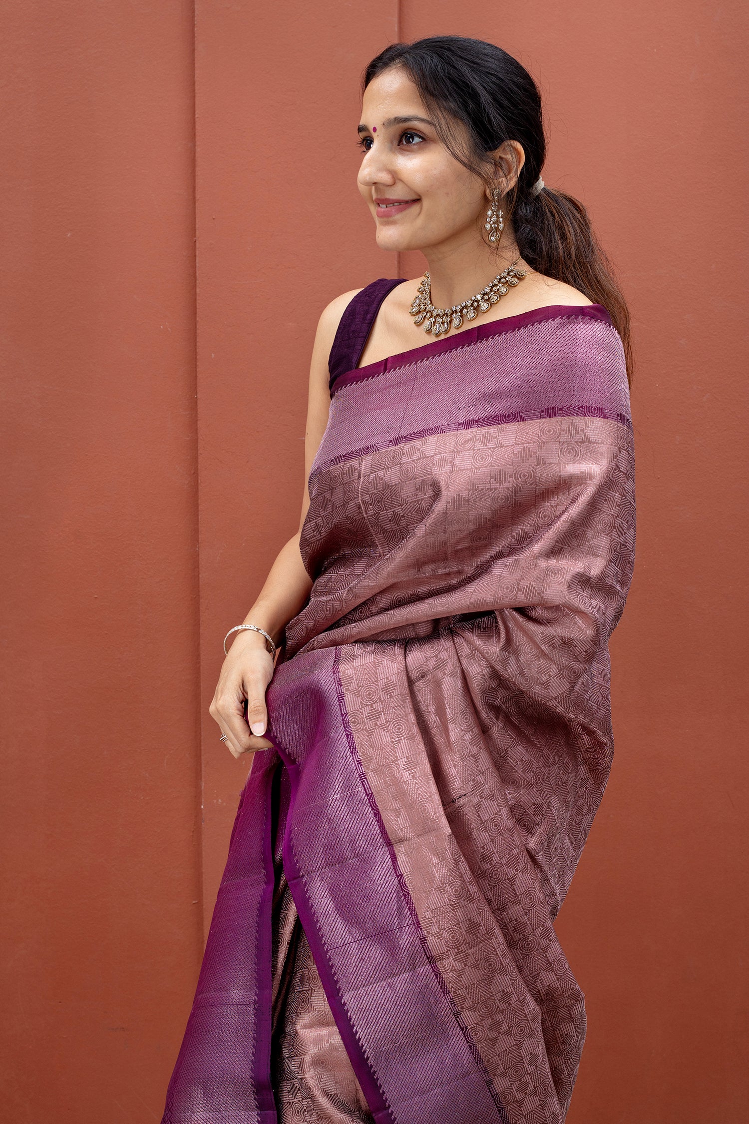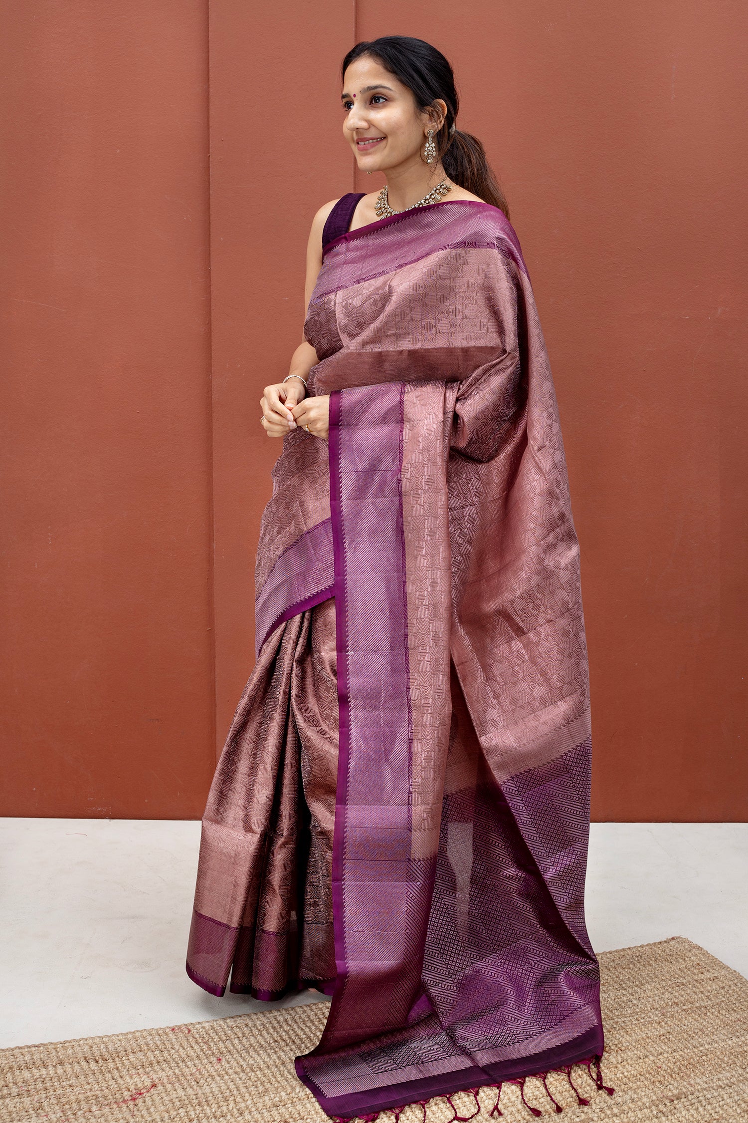 - Kanjivaram lightweight silk saree, handwoven with contrast zari borders and pallu