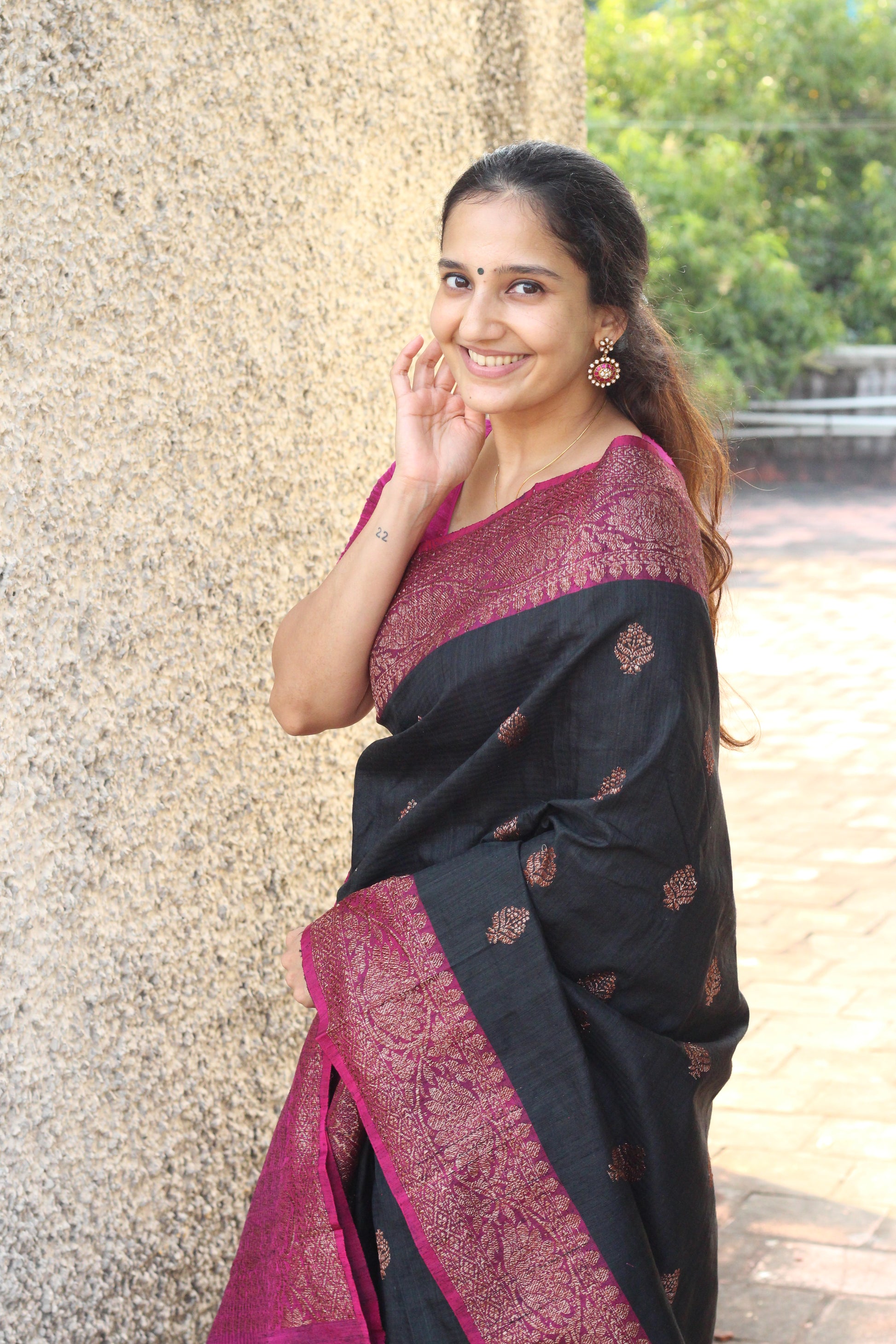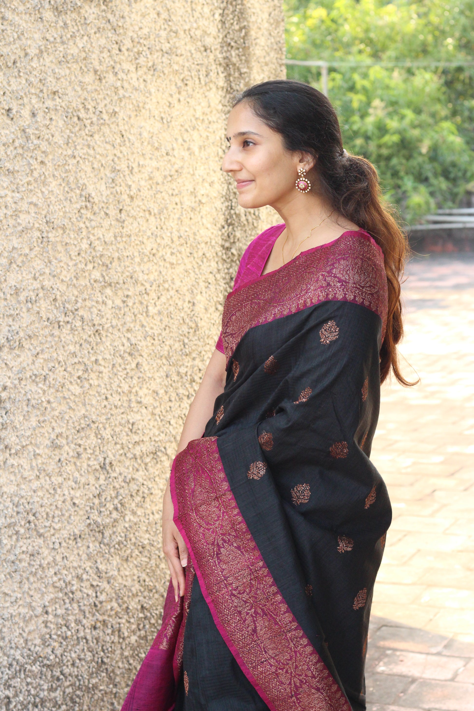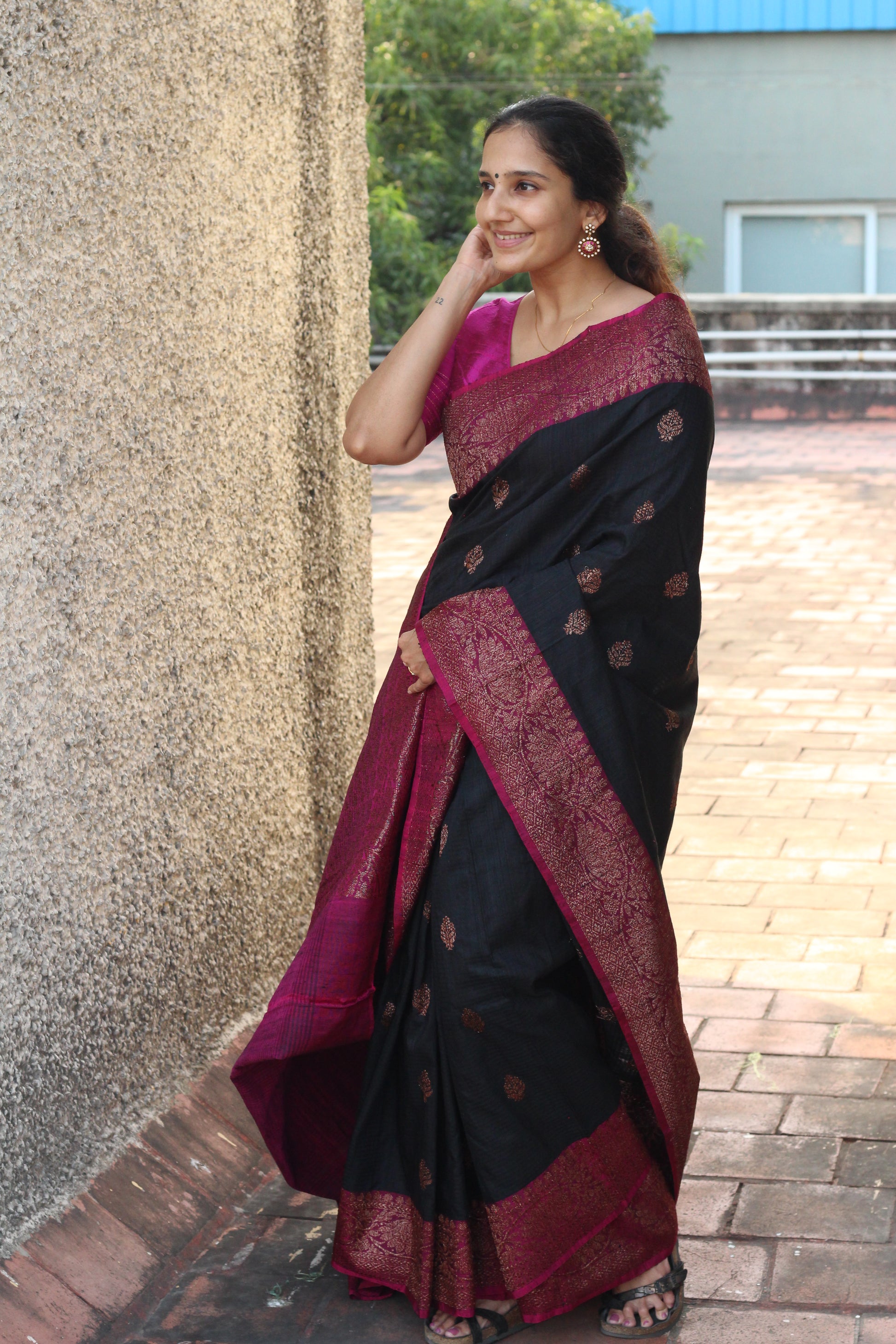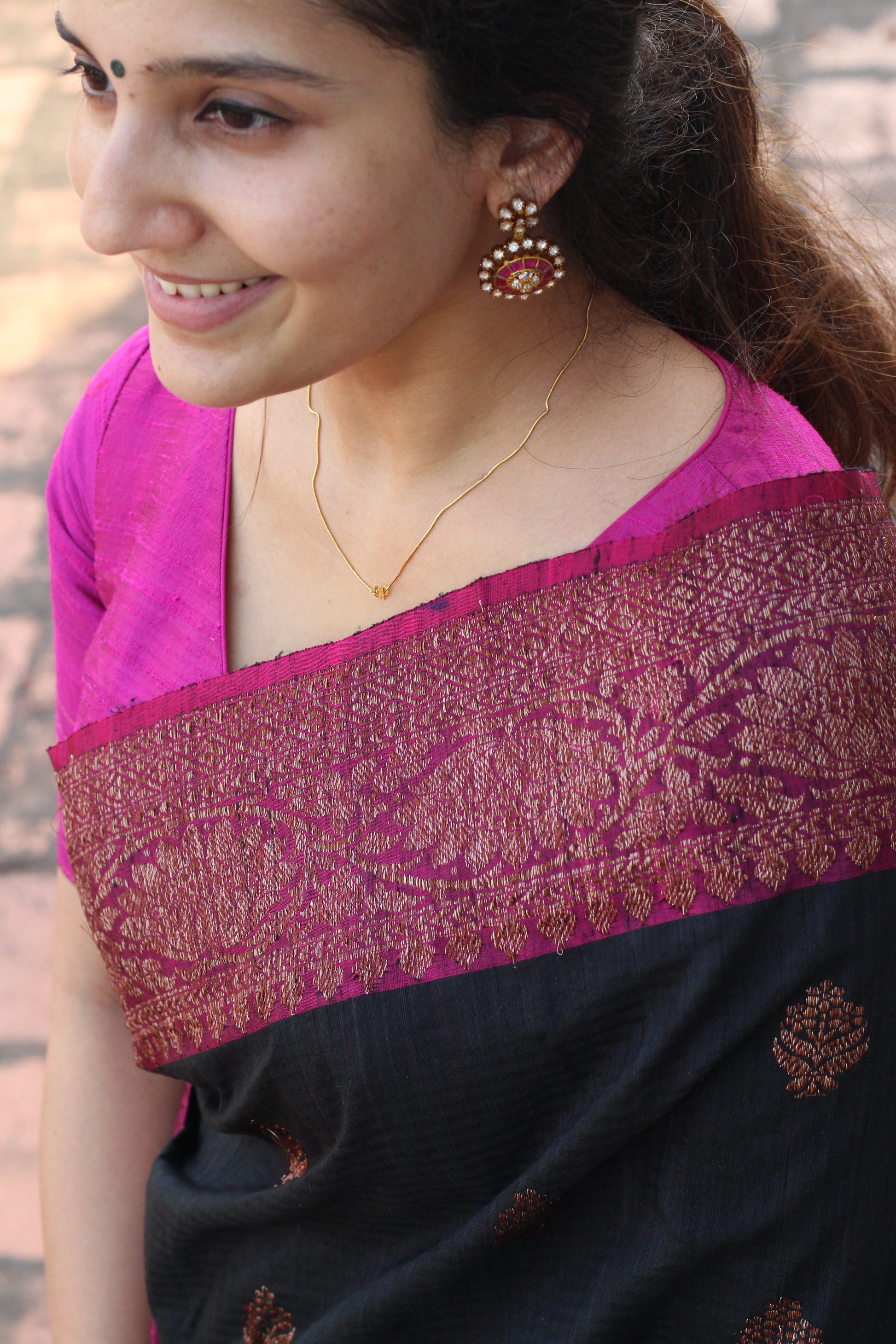 - Contrast banaras silk blouse with coordinated borders (same color as pallu)