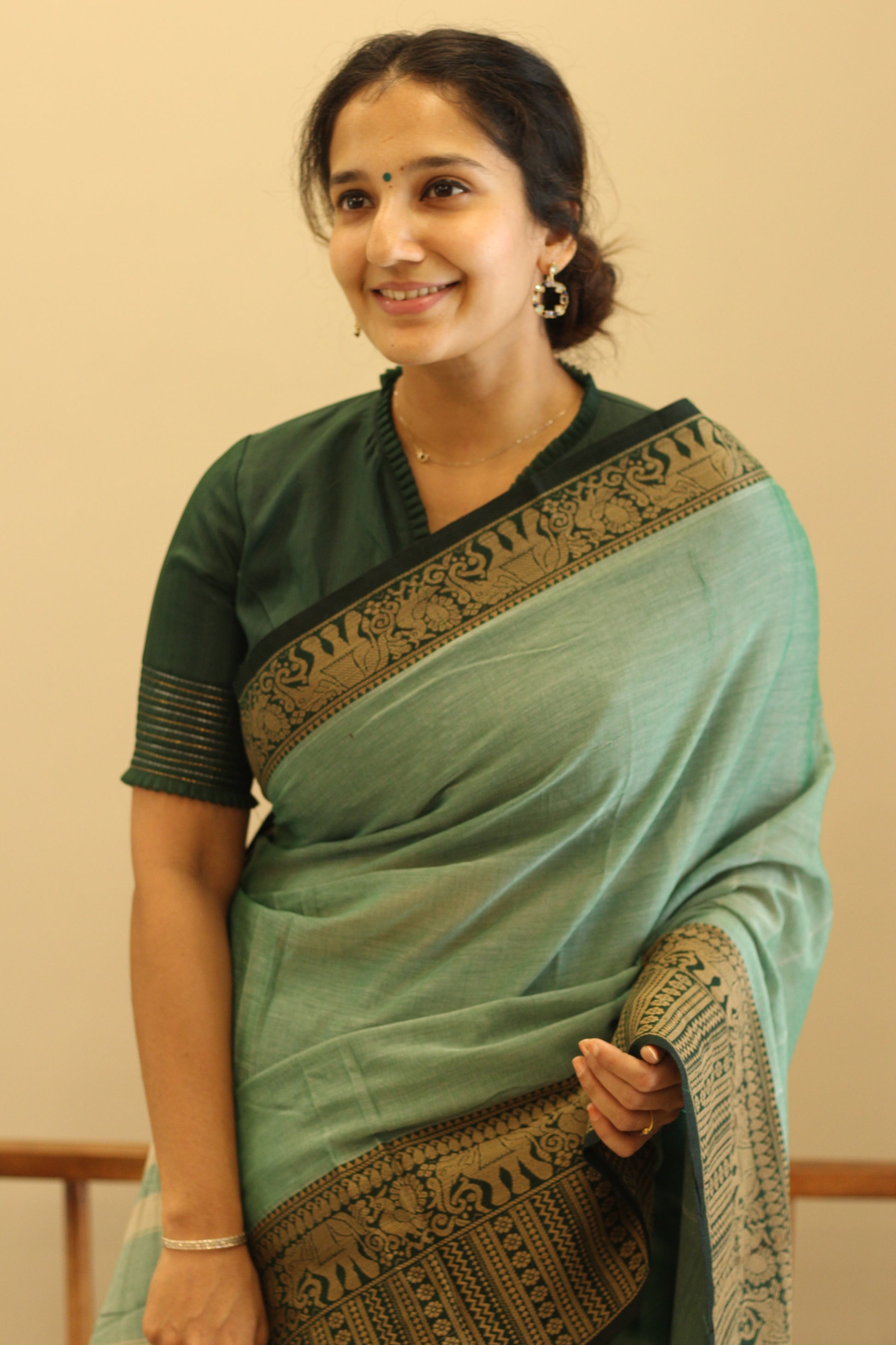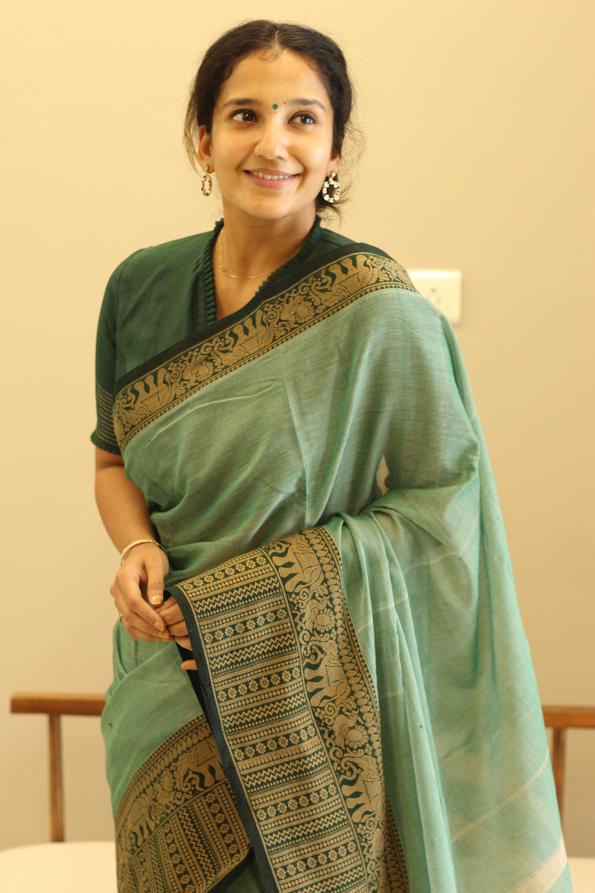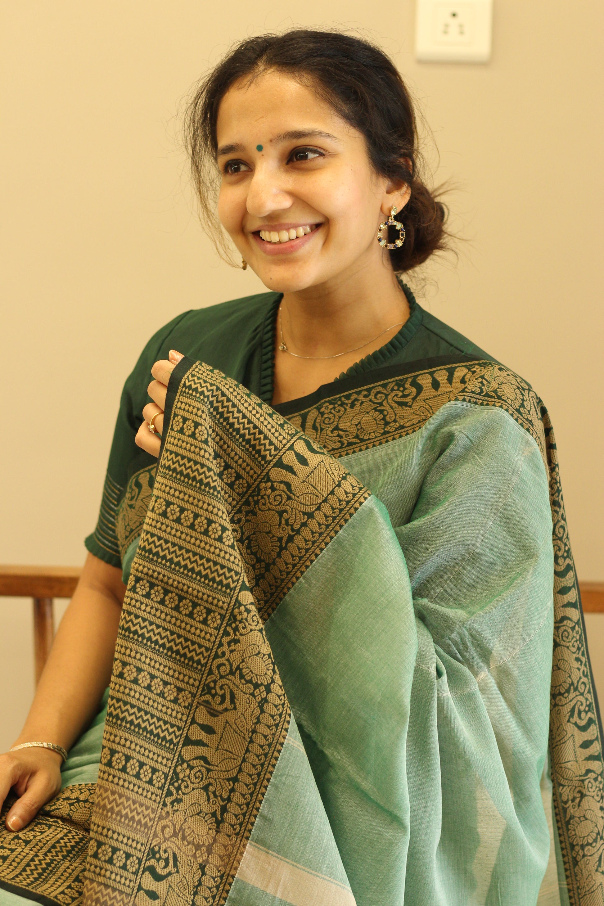 Buttery soft Banana Fibre, Cotton Silk Saree with contrast woven borders give it a rich and unique look. A saree for any occasion - a family function, be it a casual walk in the neighbourhood, day at the office, grab a coffee with your besties or even go on a date with your partner.