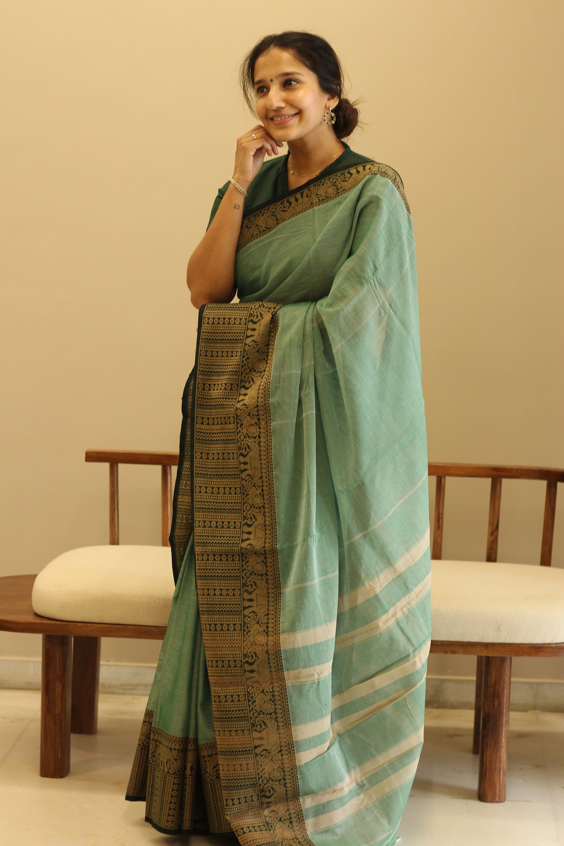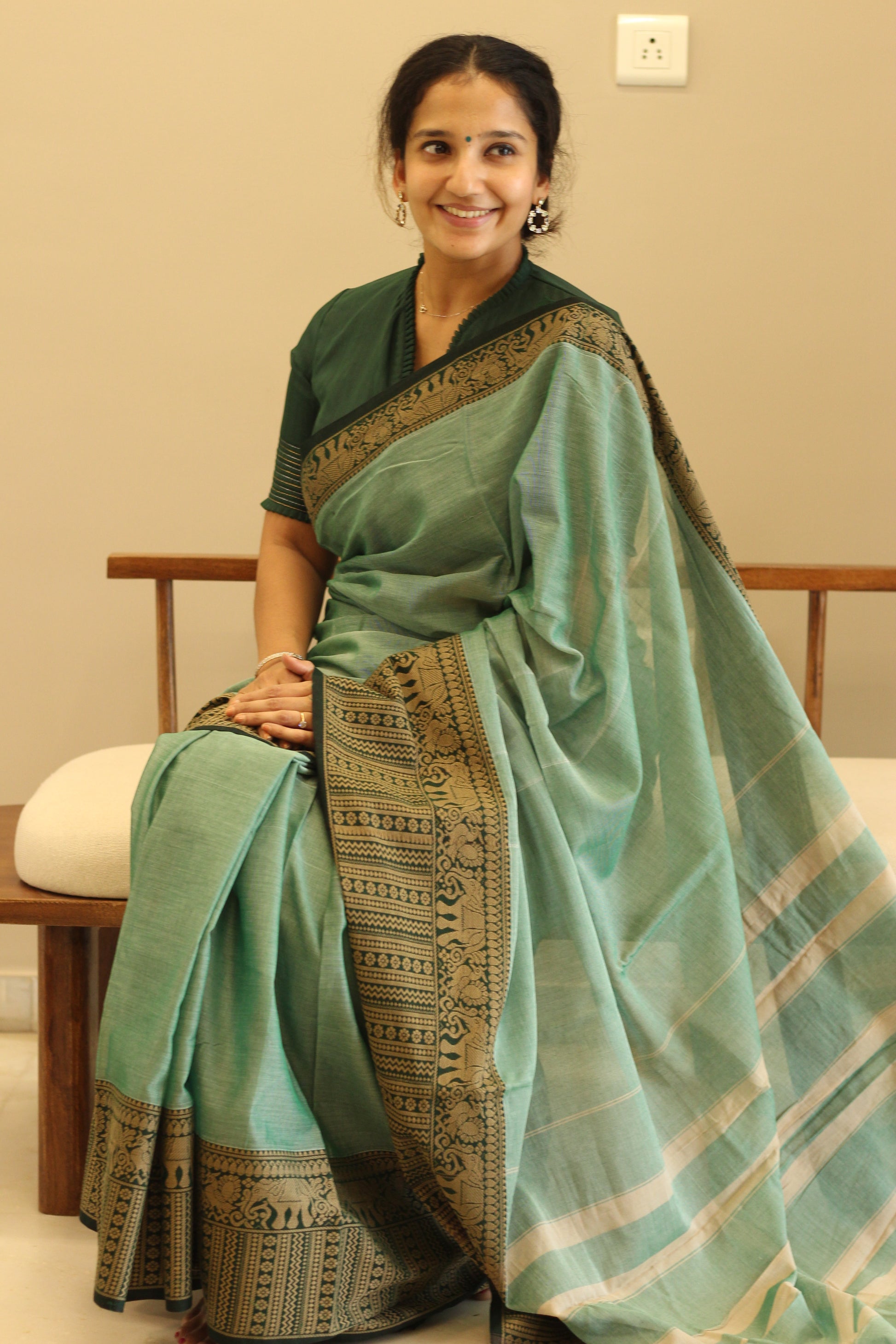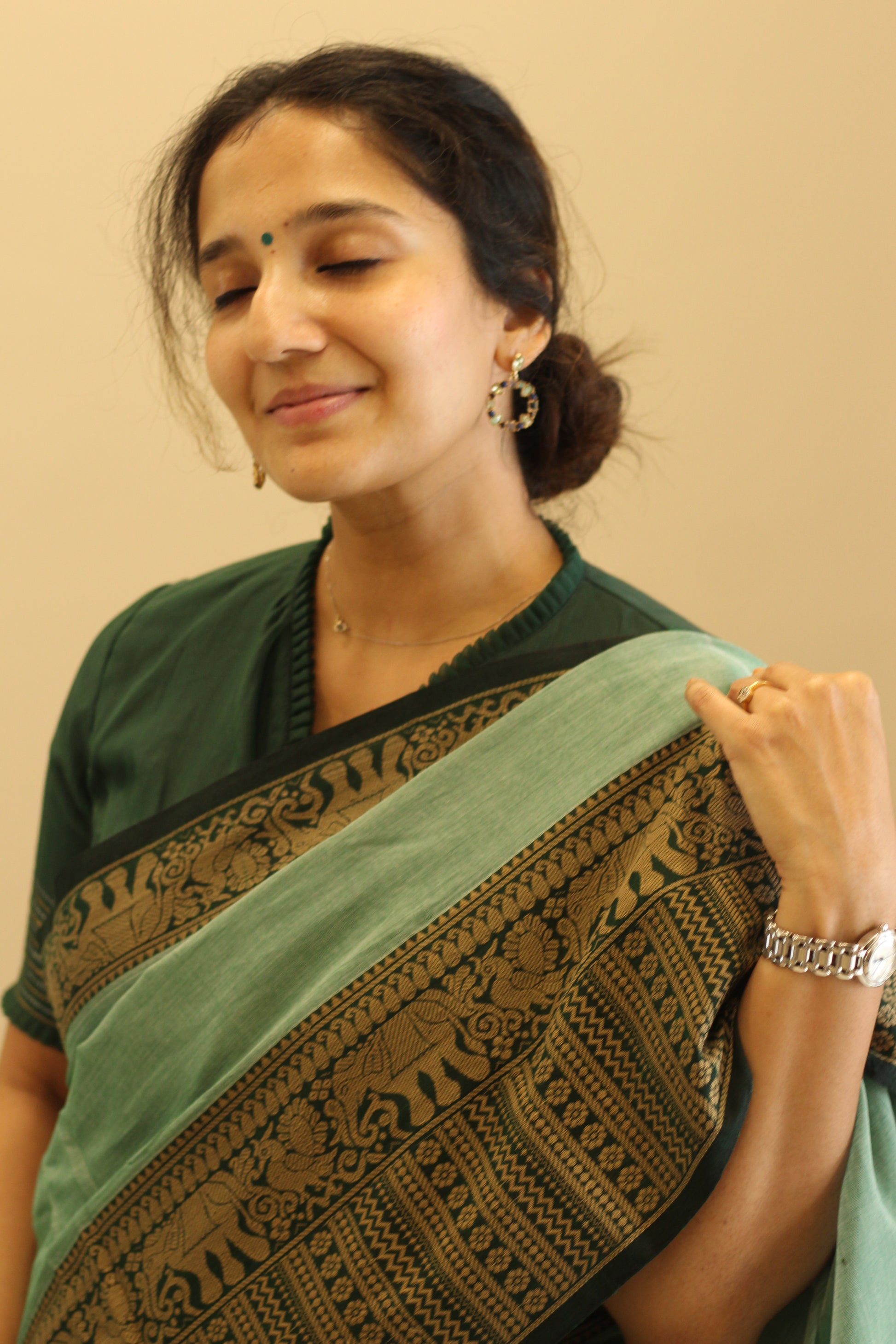 Buttery soft Banana Fibre, Cotton Silk Saree with contrast woven borders give it a rich and unique look. A saree for any occasion - a family function, be it a casual walk in the neighbourhood, day at the office, grab a coffee with your besties or even go on a date with your partner.