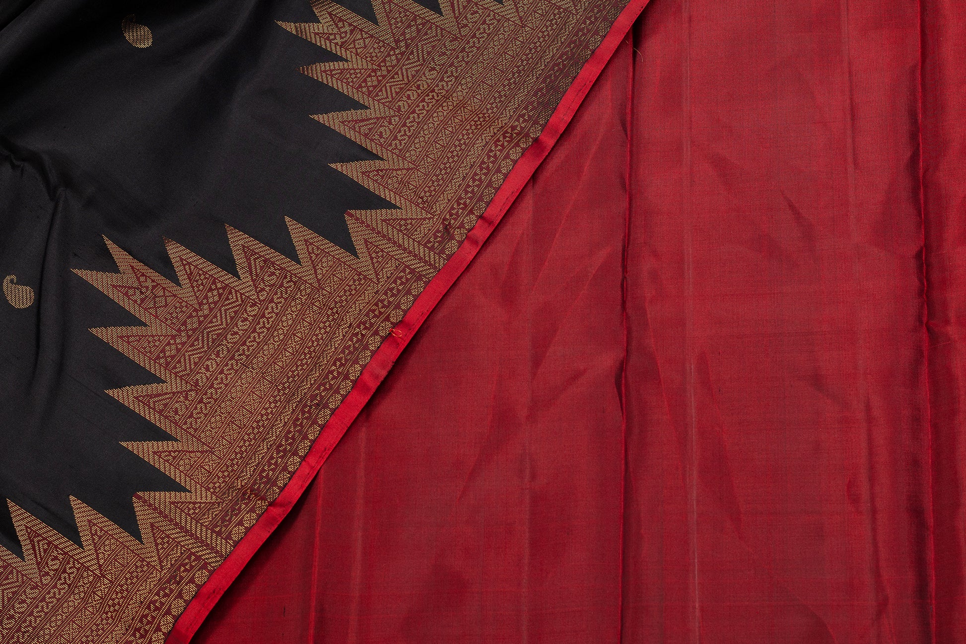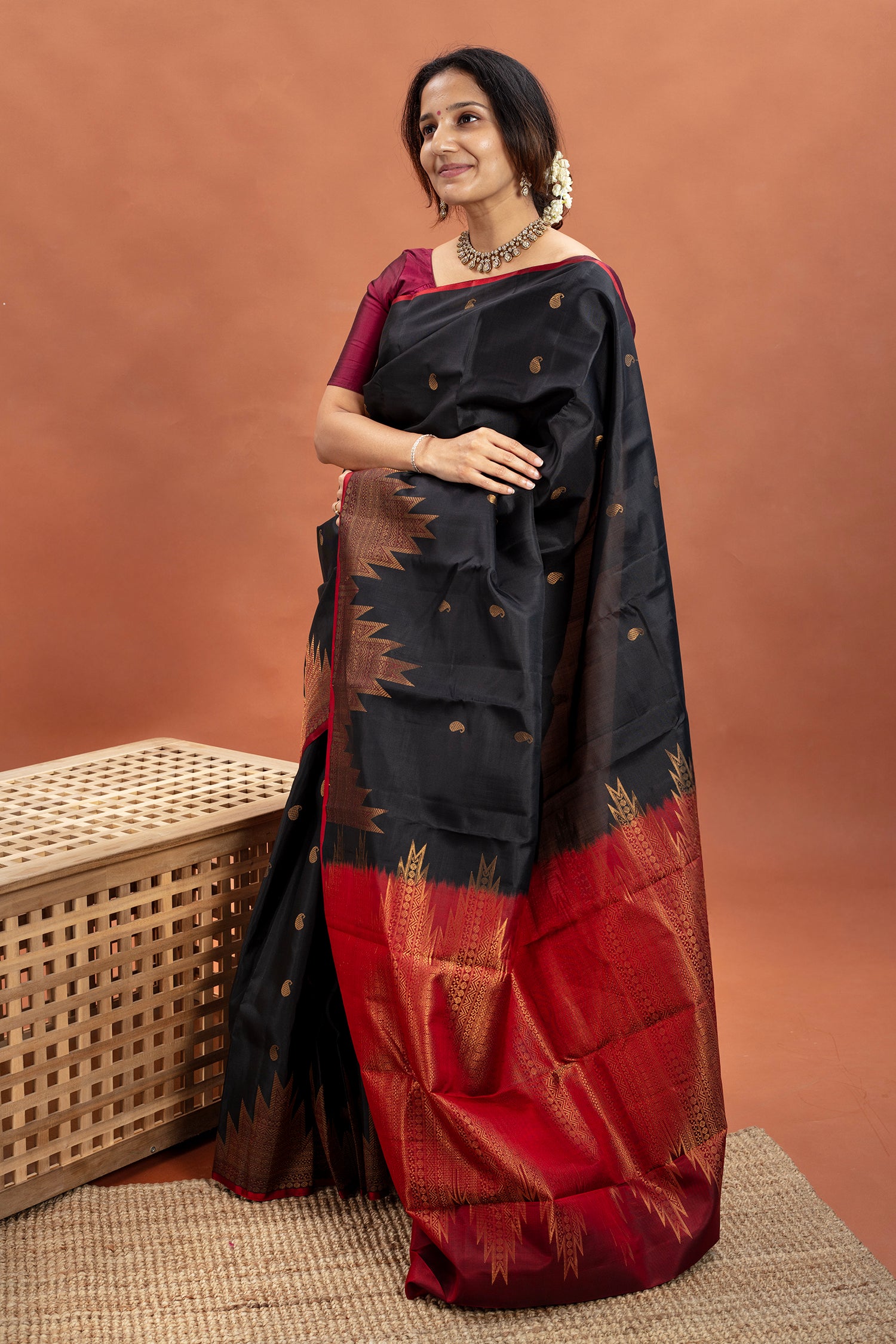 - Kanjivaram lightweight silk saree, handwoven with contrast zari temple borders and pallu