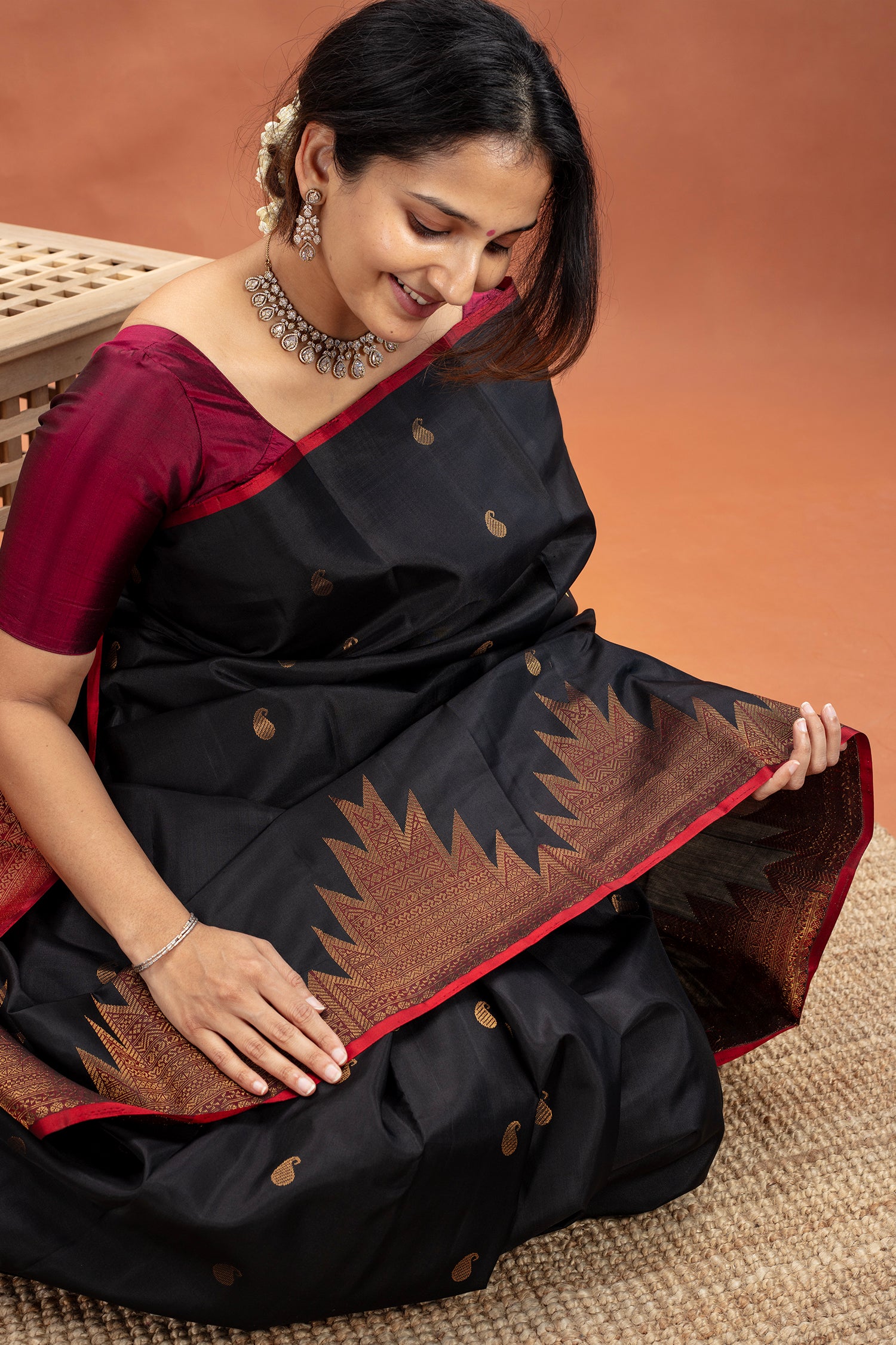 - Zari motifs woven all over