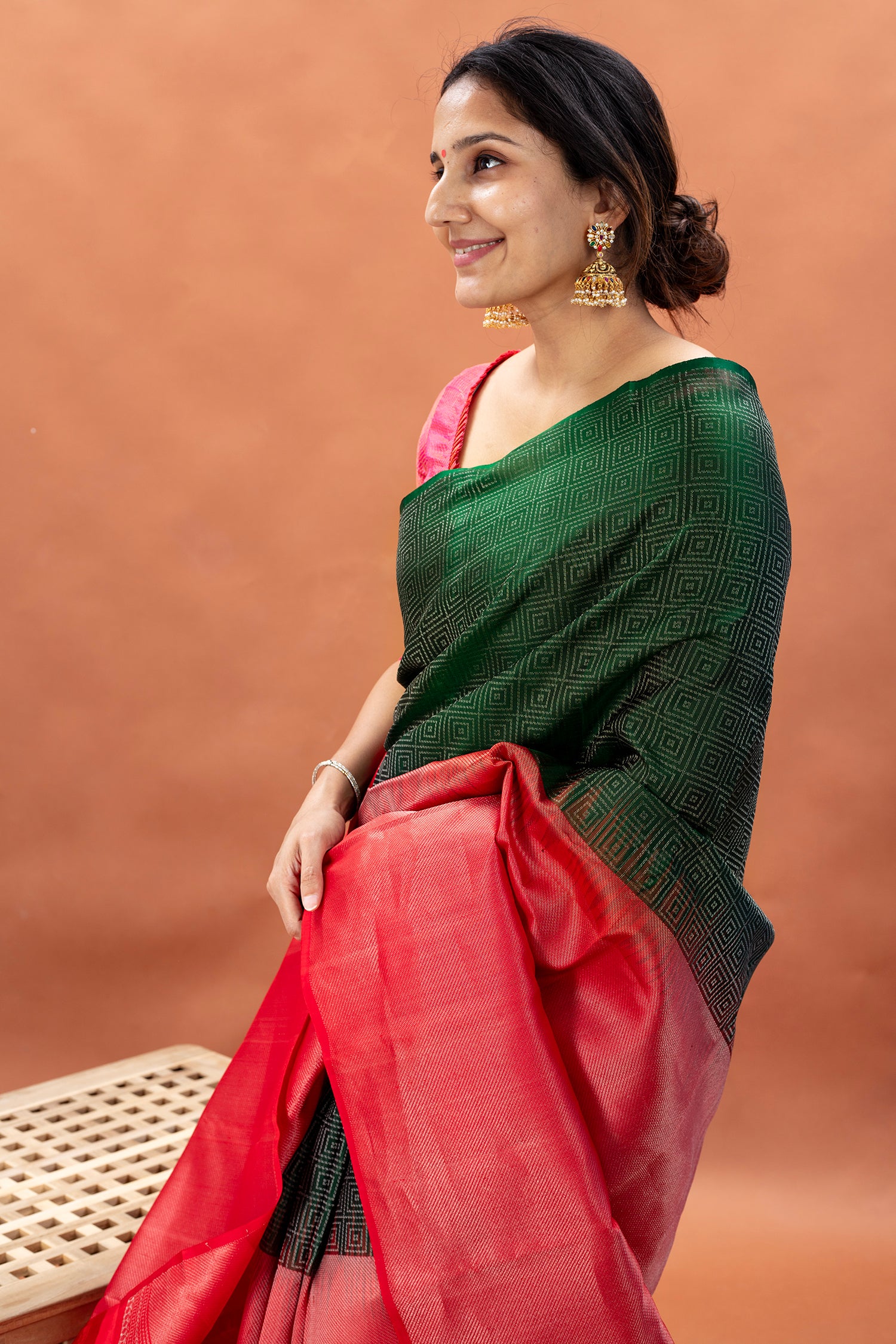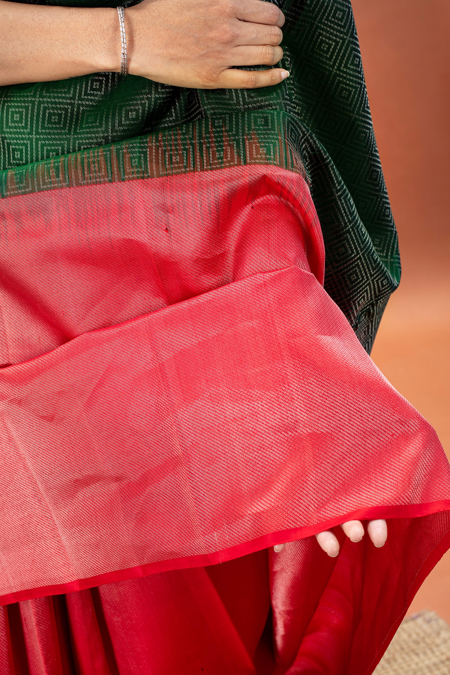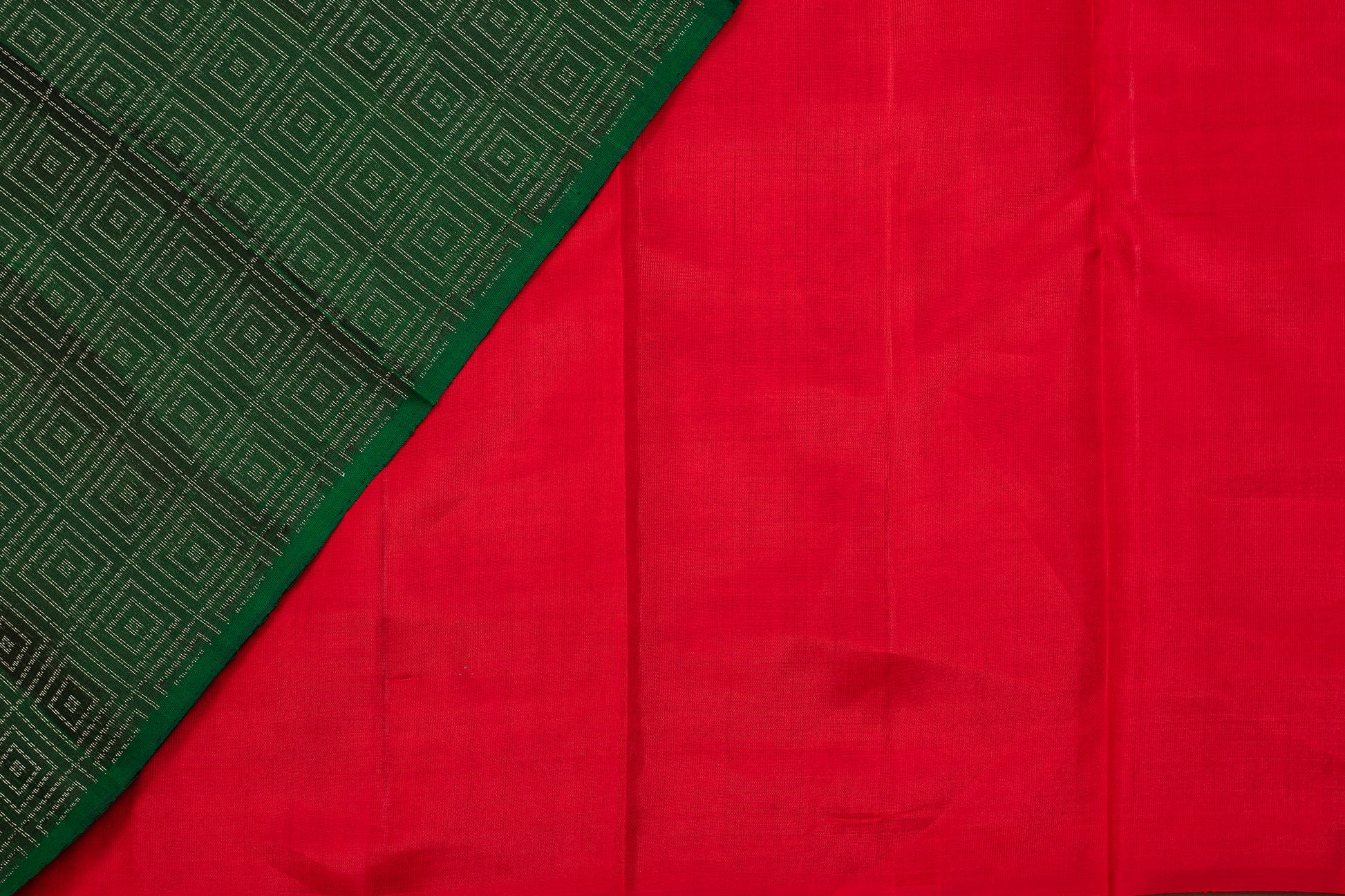 - Kanjivaram lightweight silk saree, handwoven in a vertical half and half design