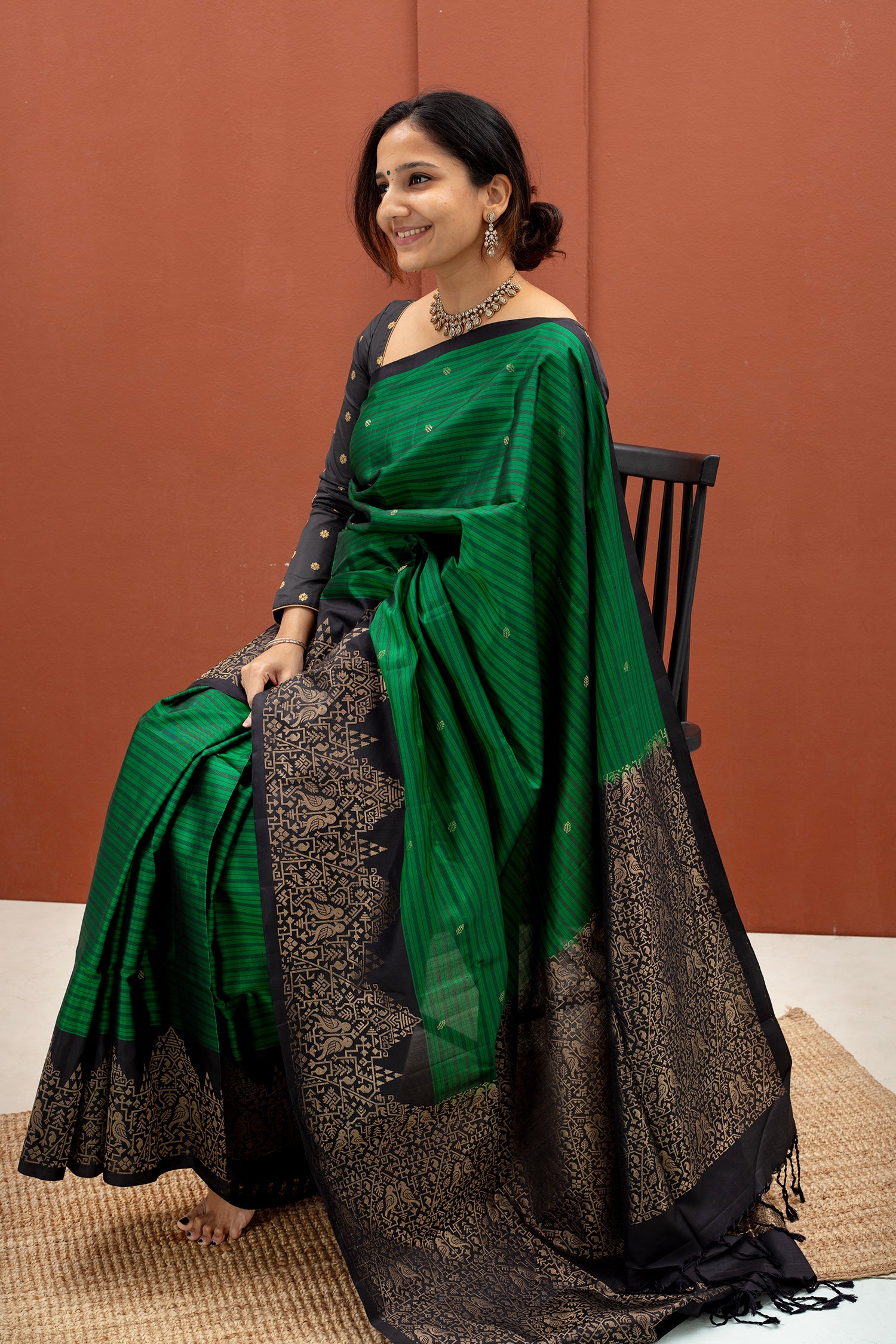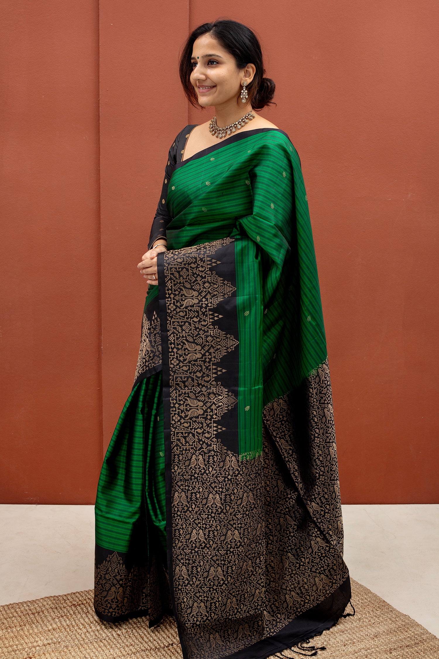 - Contrast silk blouse with coordinated borders (same color as pallu)