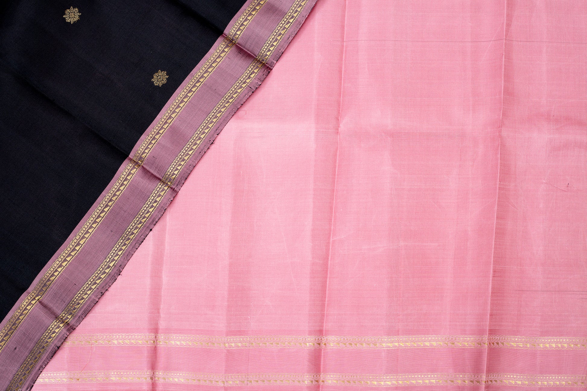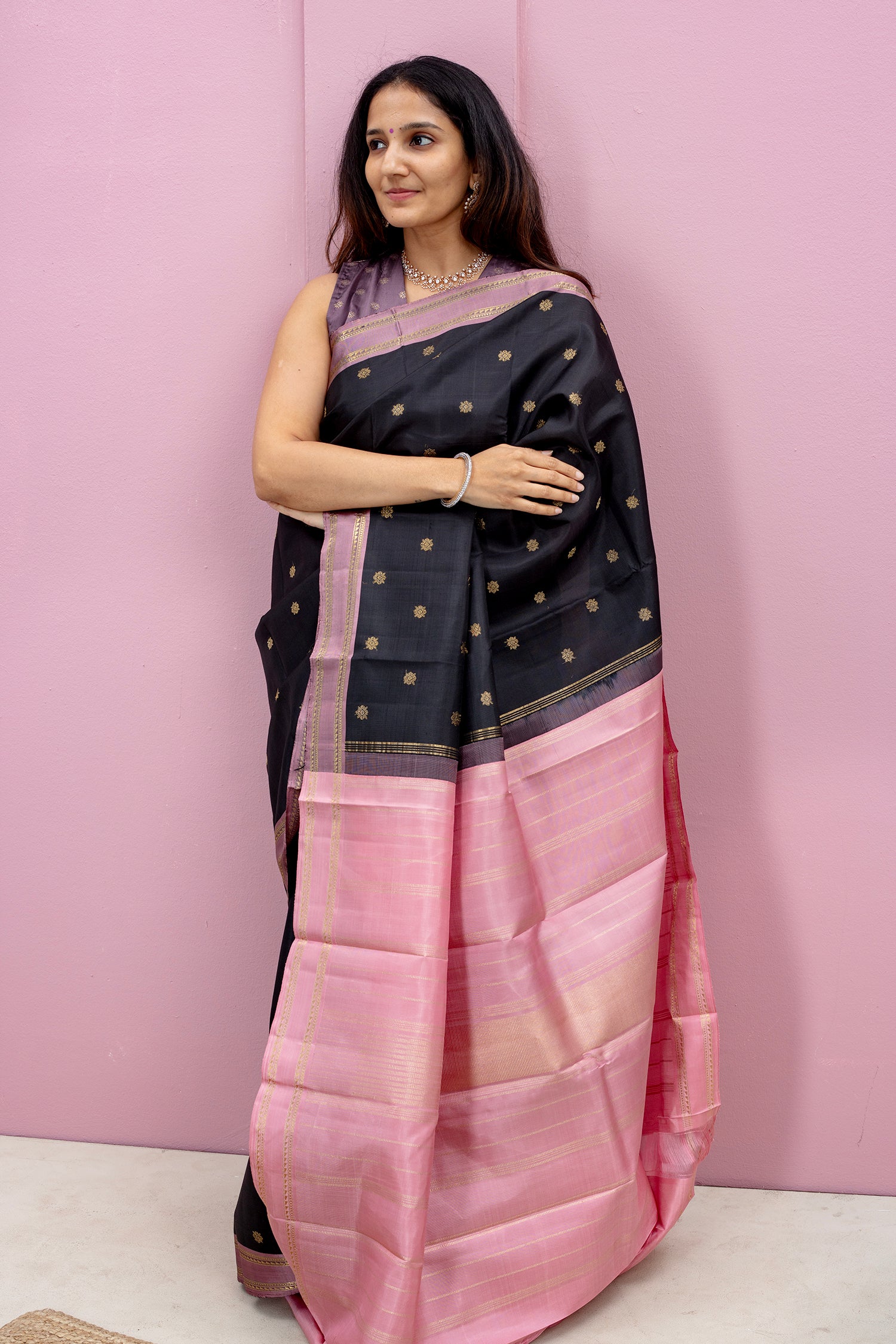 A luxurious and regal handwoven silk saree in black, featuring gold zari floral motifs woven all over. The elegant contrast of a pastel border and pallu, adds a timeless charm making it perfect for festive occasions or sophisticated party wear.