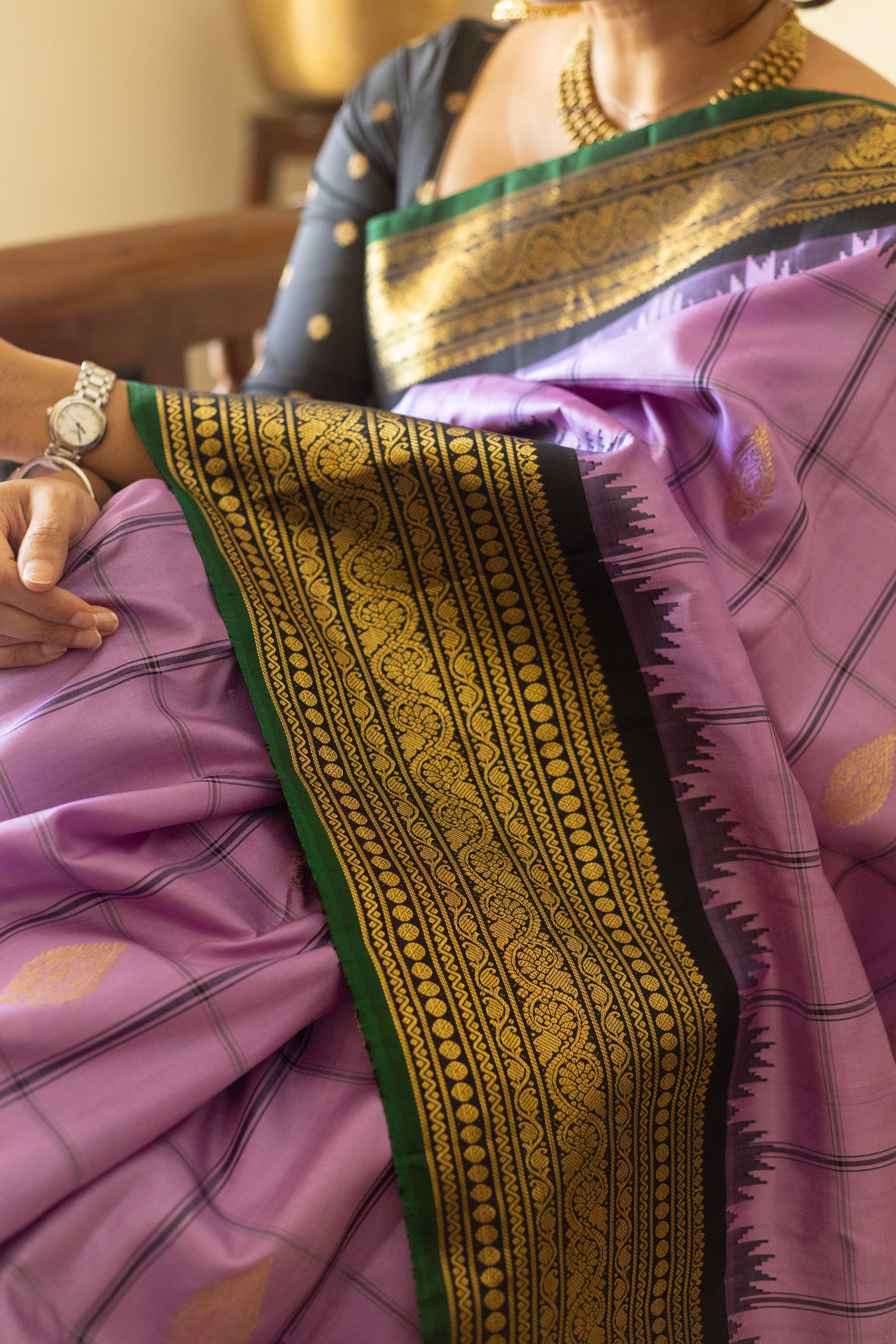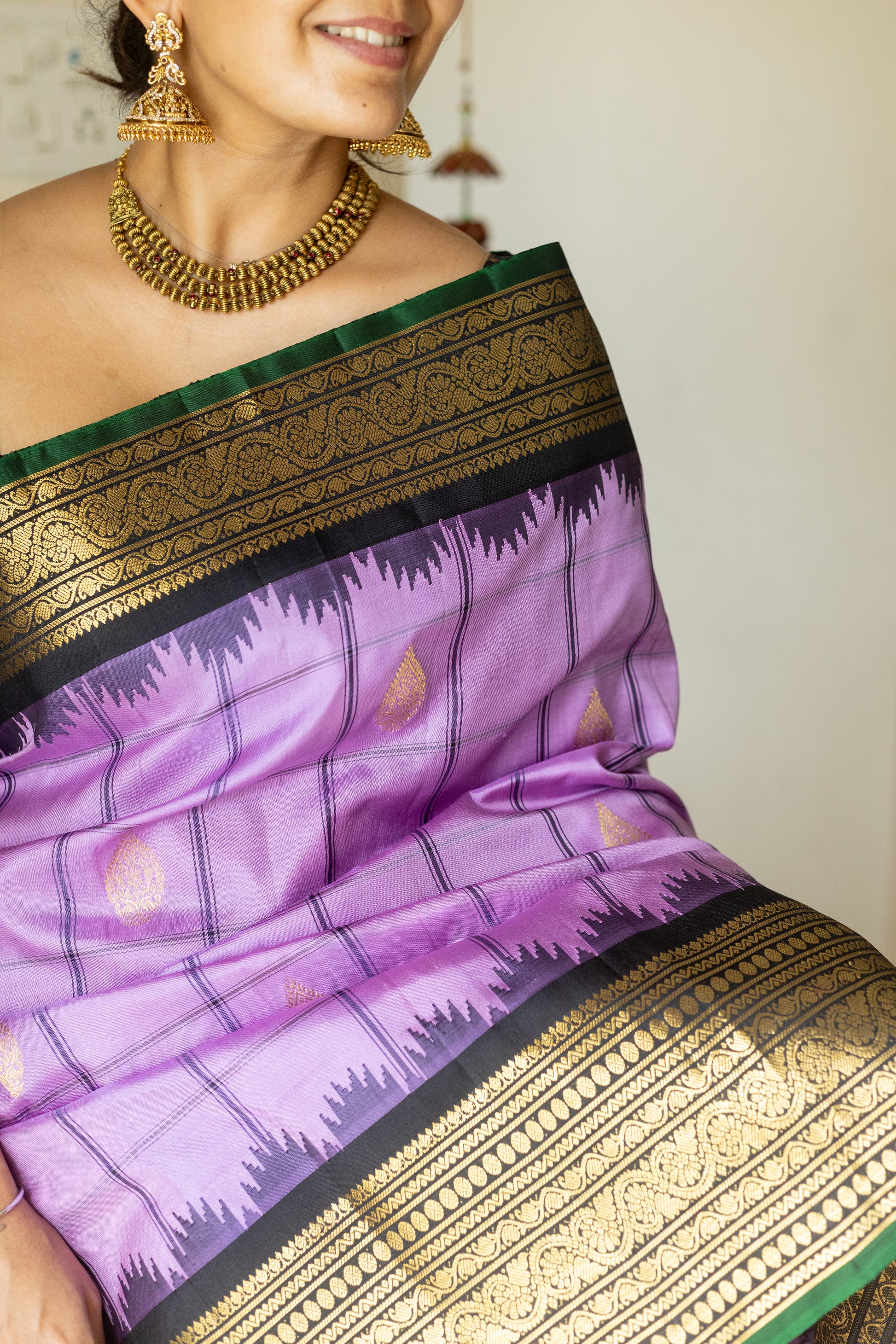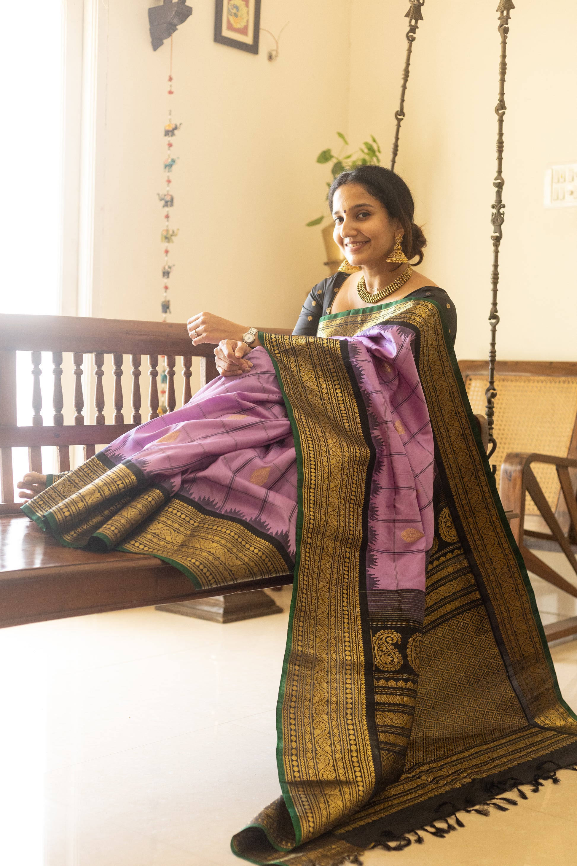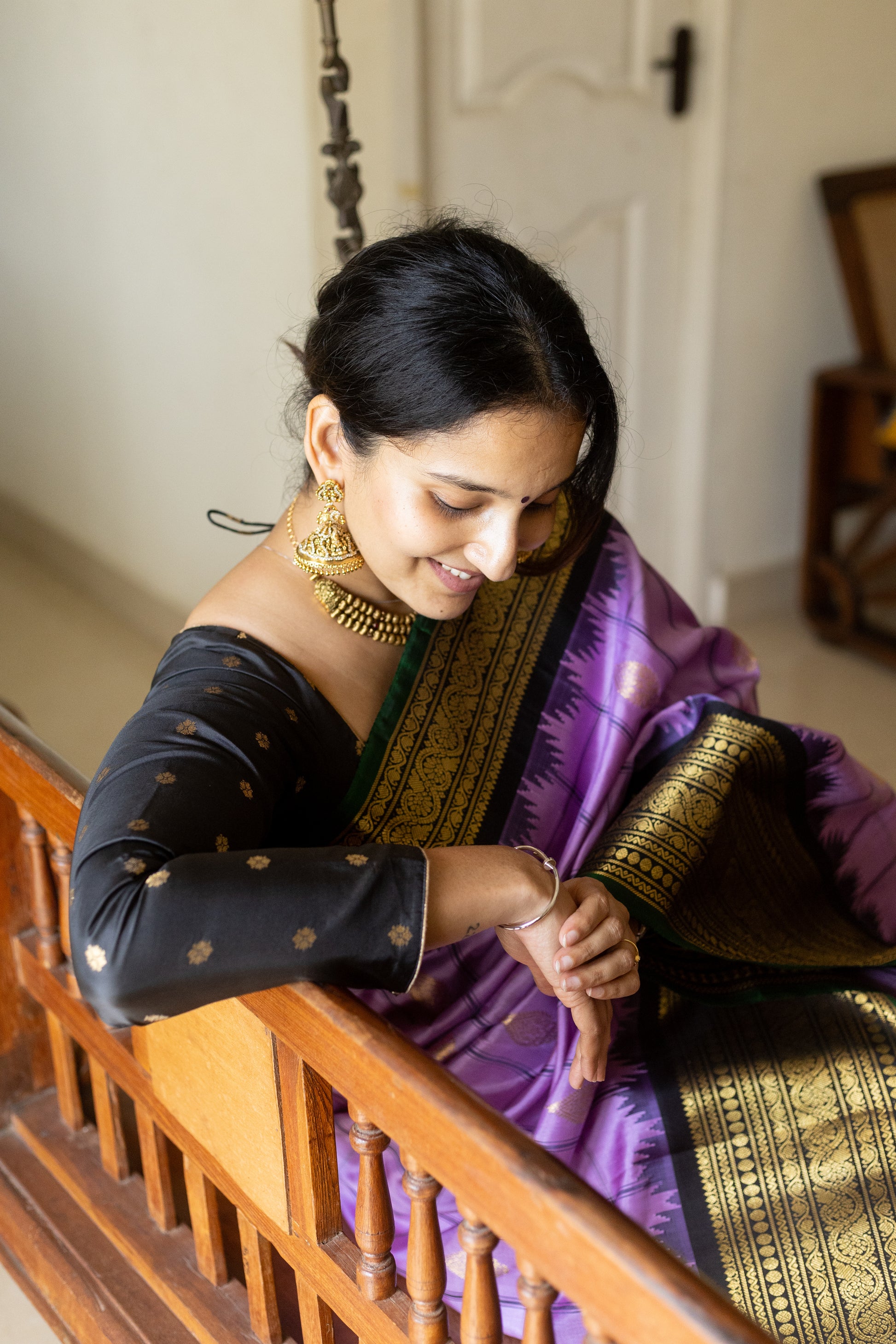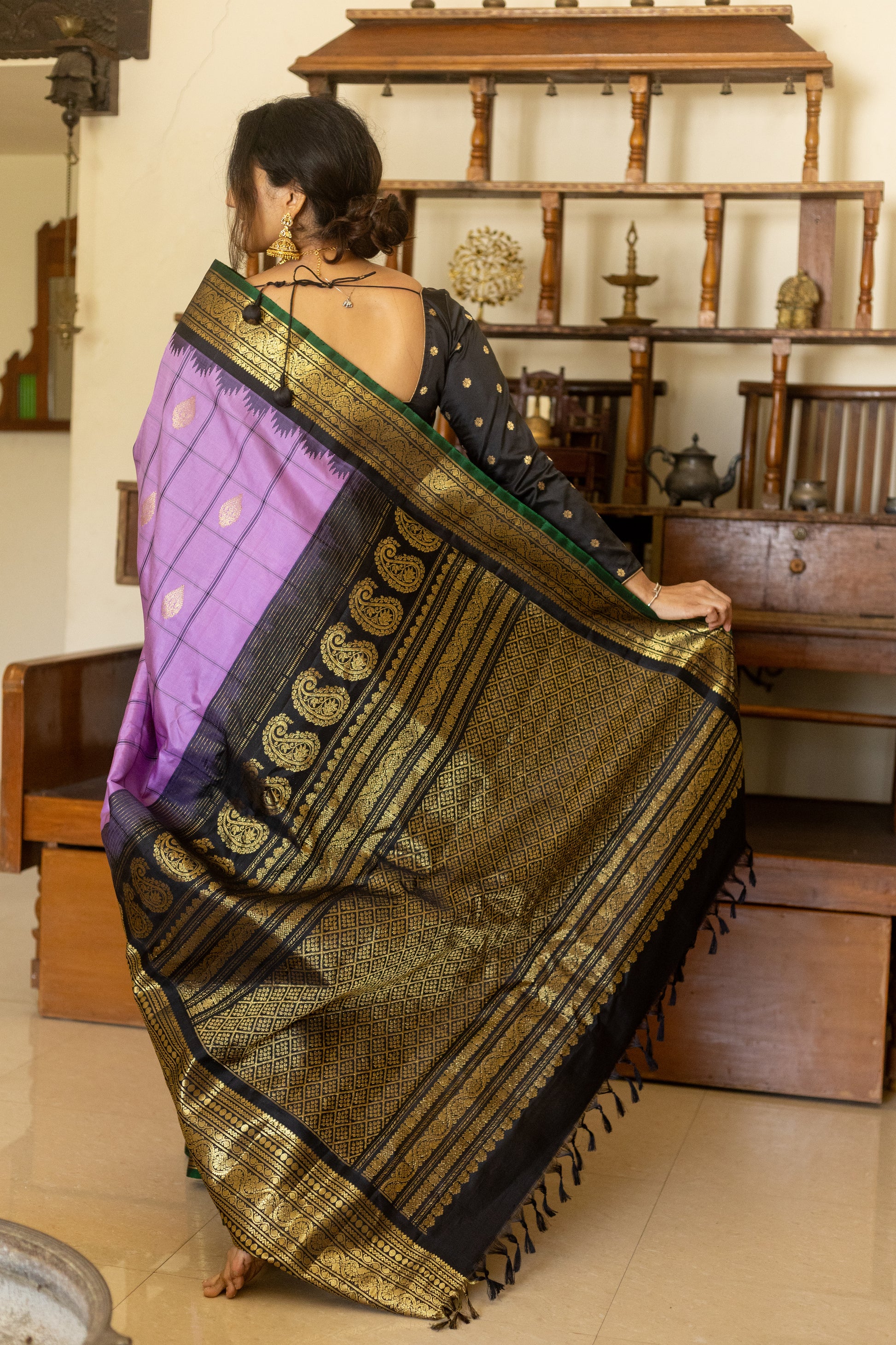 Drape yourself in the rich heritage of Indian textiles with this stunning handwoven Gadwal Silk saree in Lavender. The intricately woven Black borders and pallu add a touch of sophistication, while the subtle sheen of the silk catches the light. Gold zari motifs adorn the body all over and finished with a bottle green selvedge.