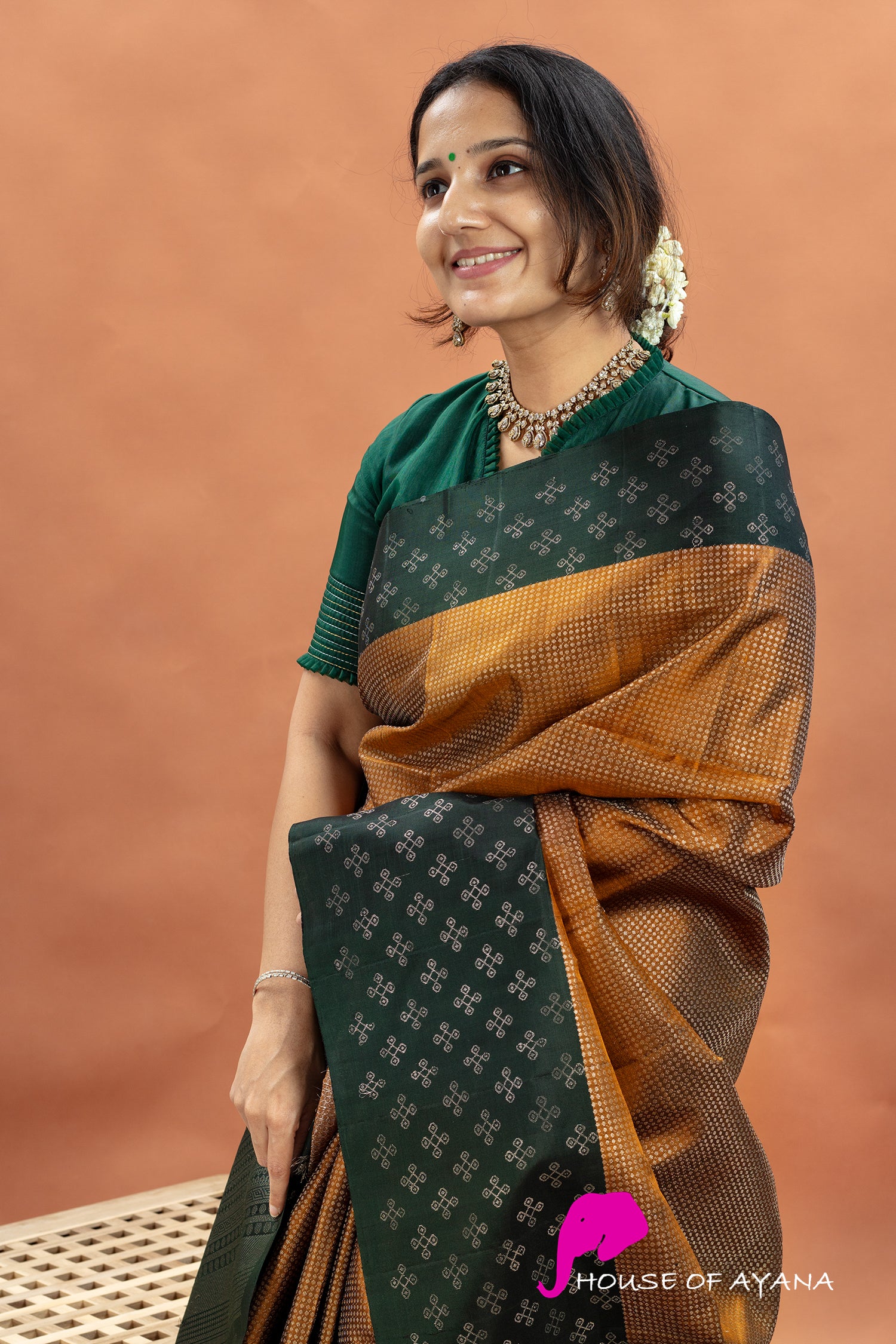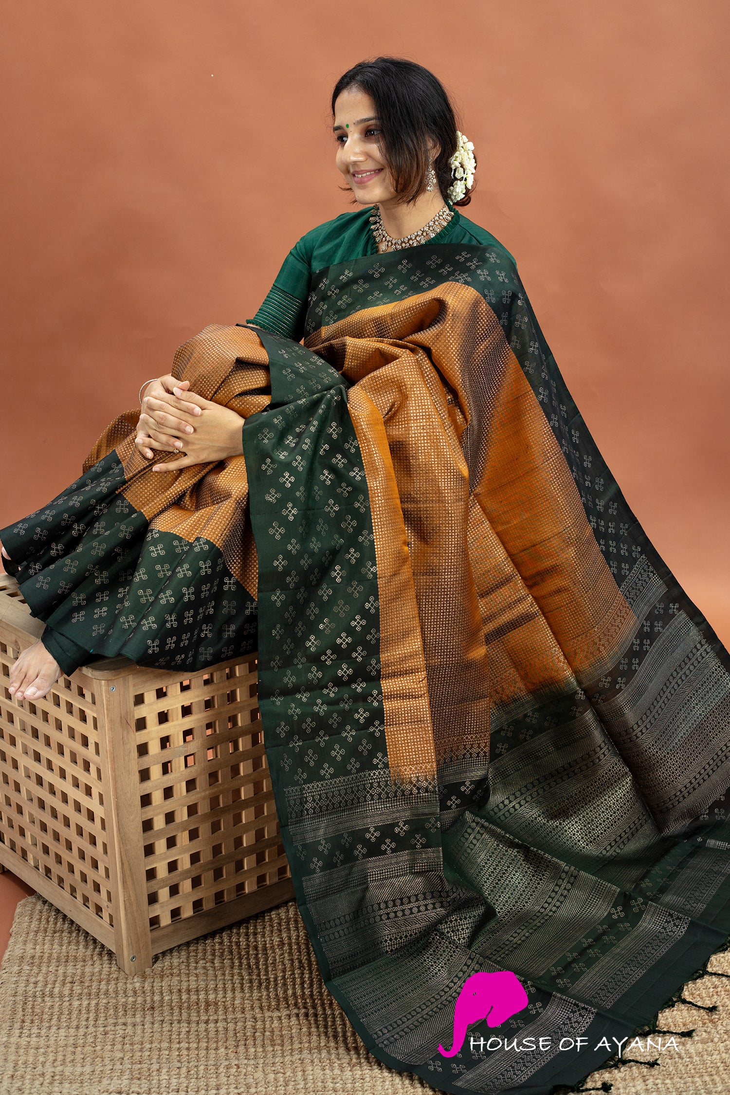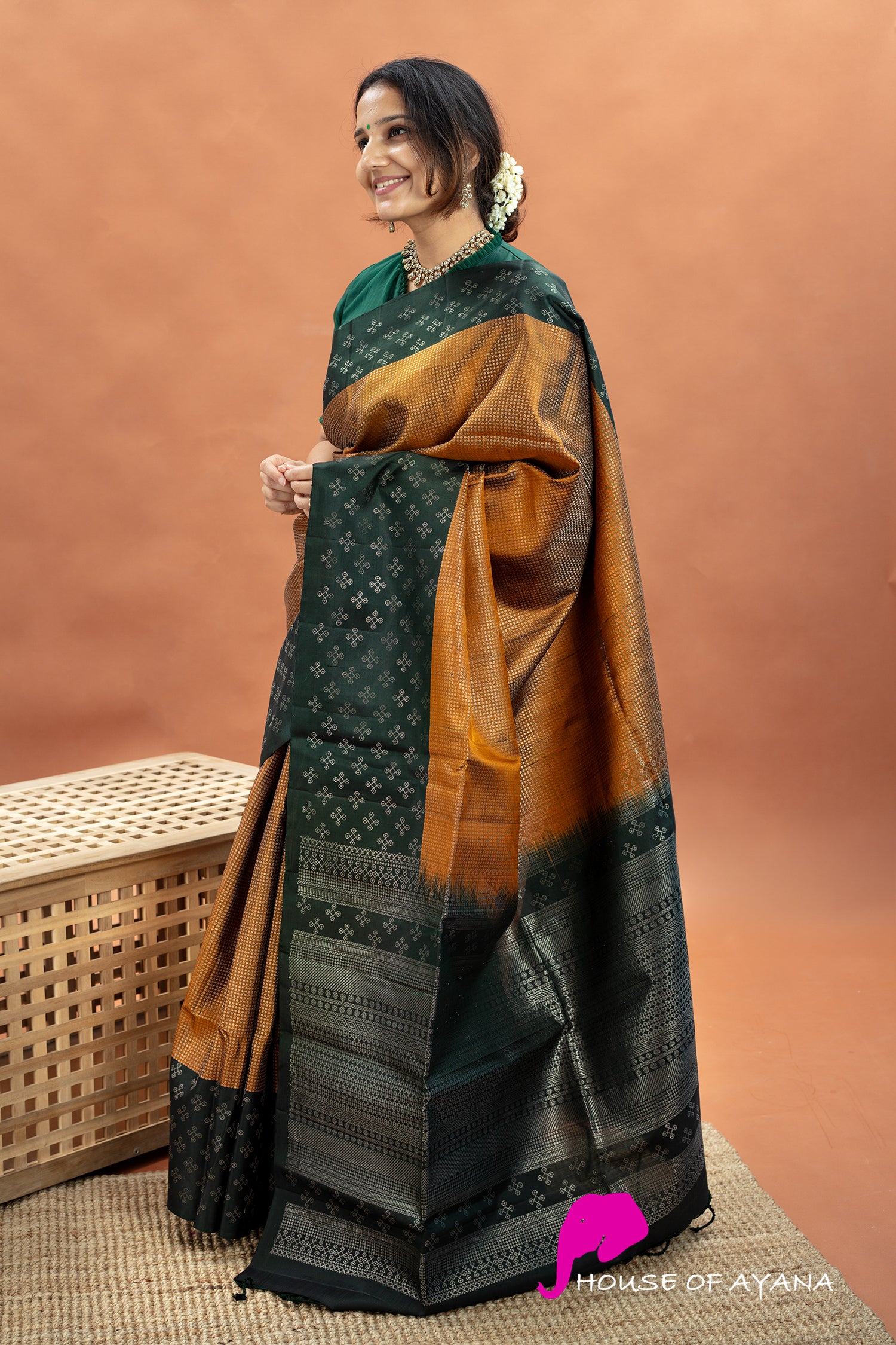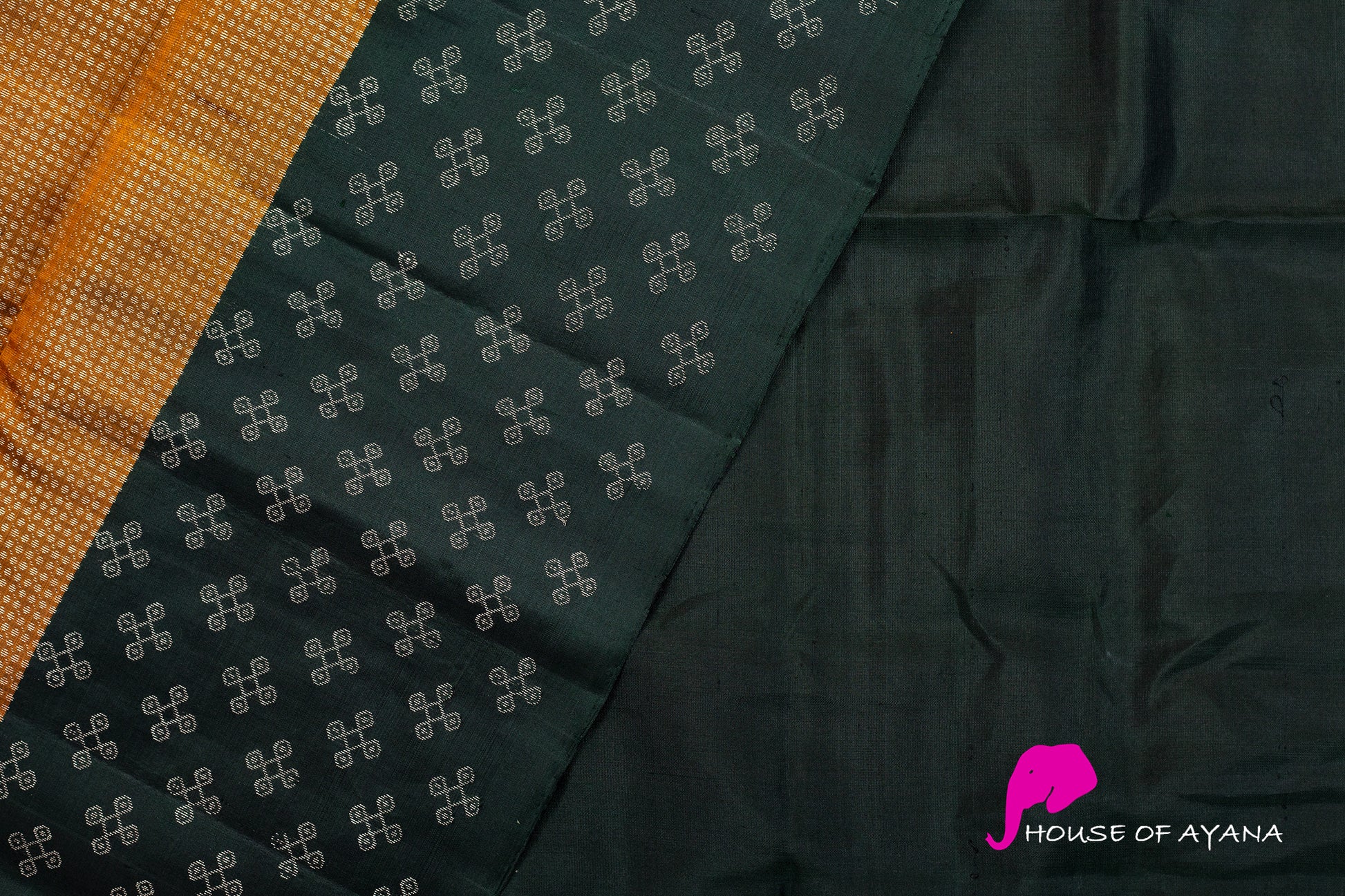 - Kanjivaram lightweight silk saree, handwoven with contrast zari borders and grand pallu