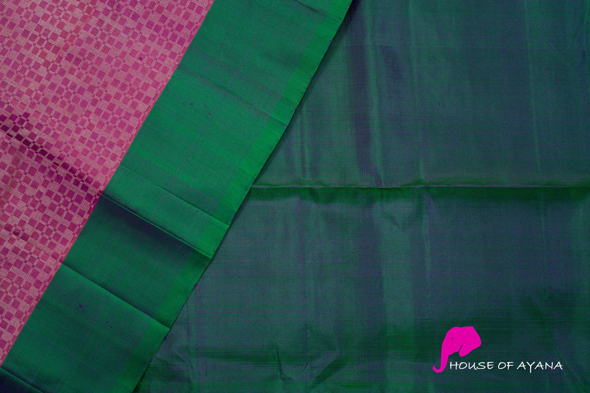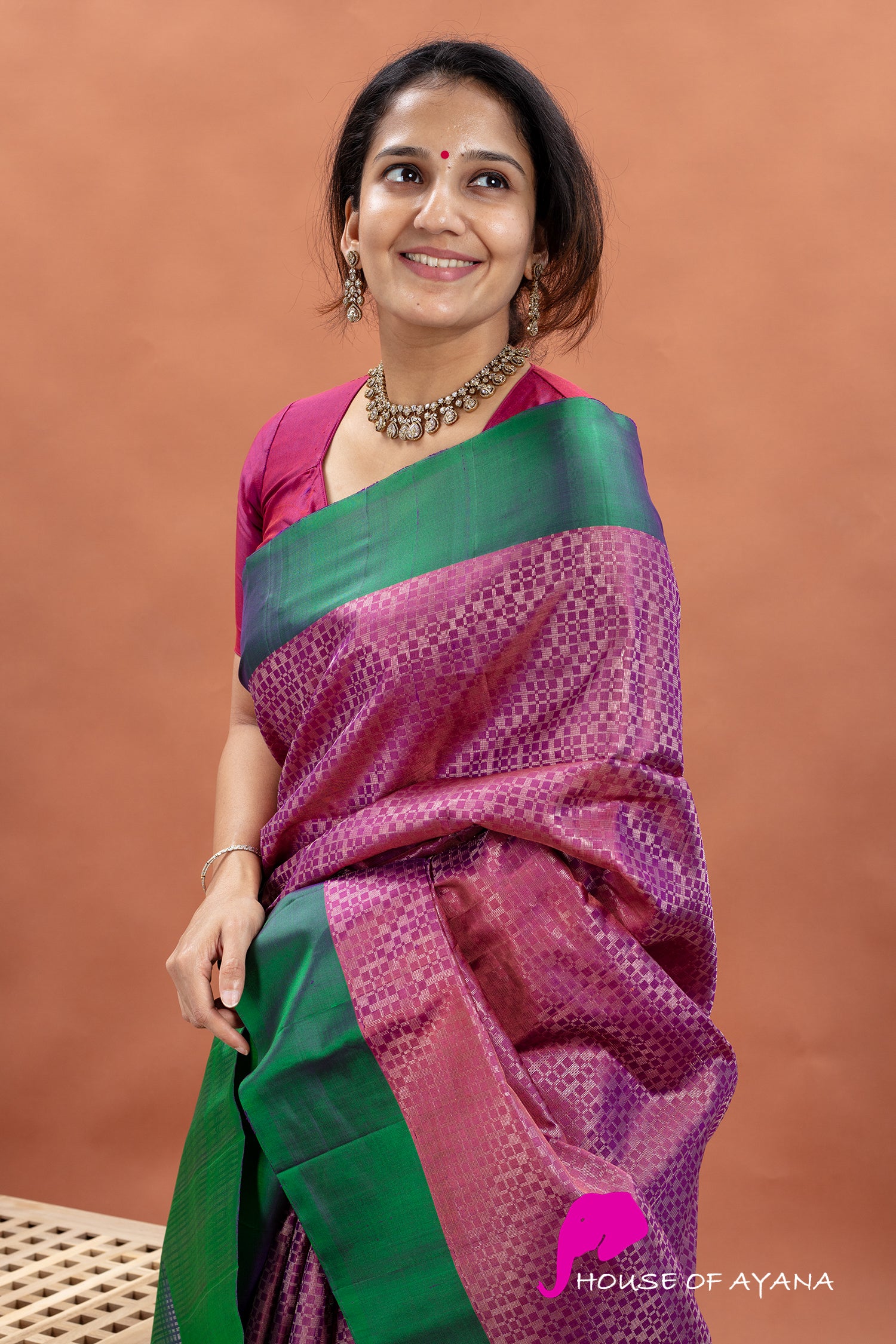 - Kanjivaram lightweight silk saree, handwoven with contrast borders and grand zari pallu