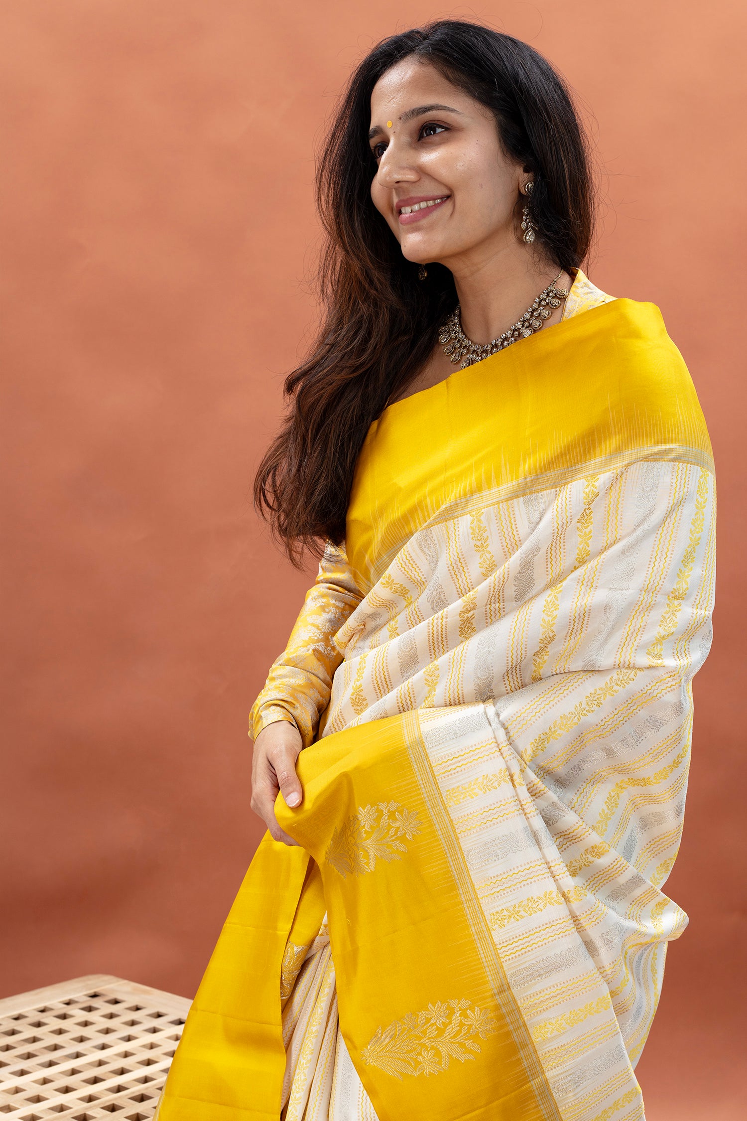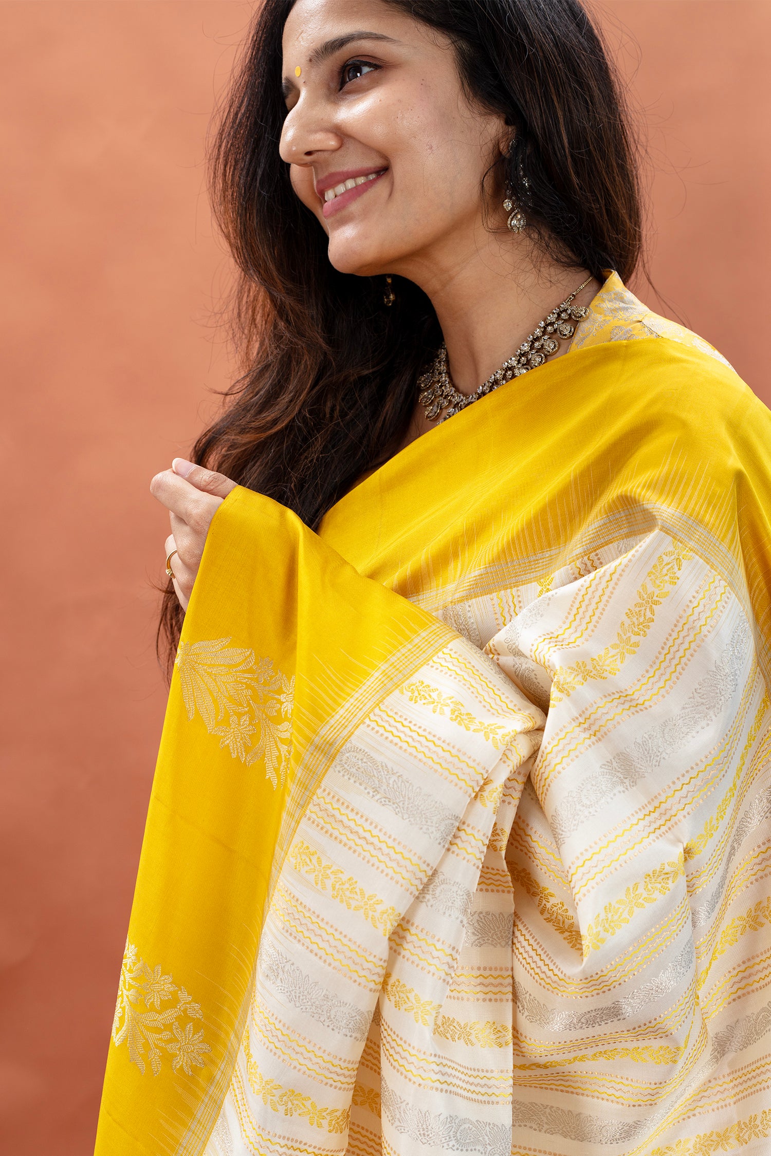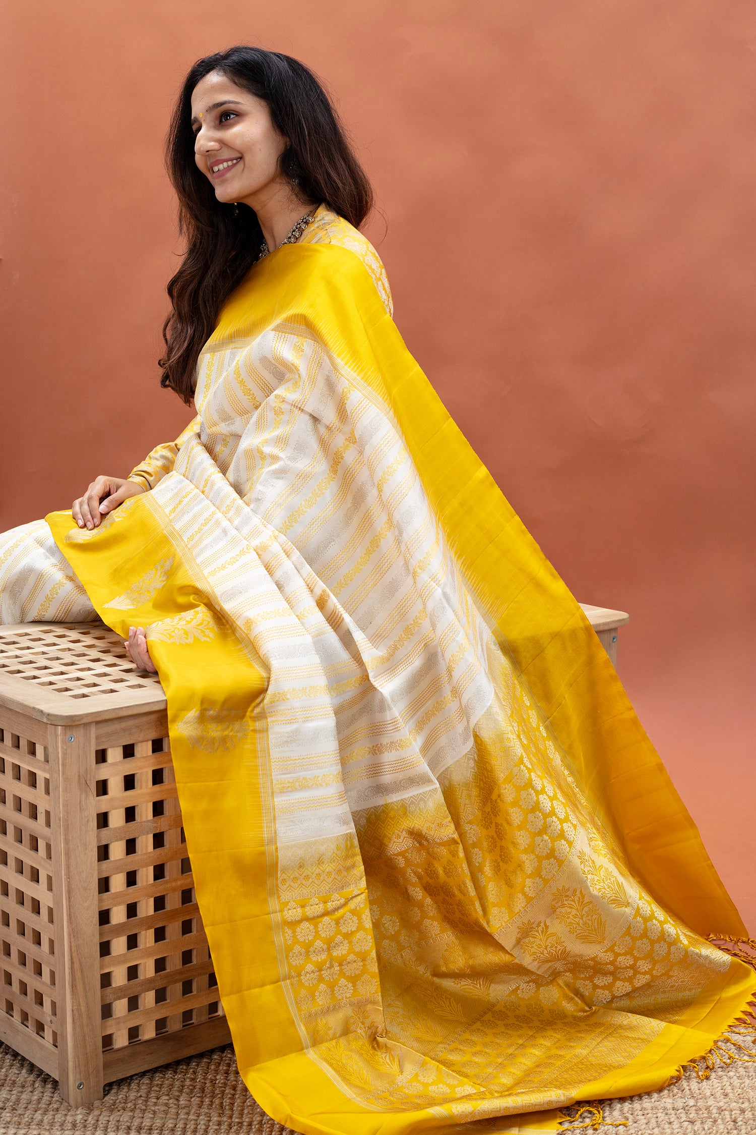 - Zari details woven all over the saree