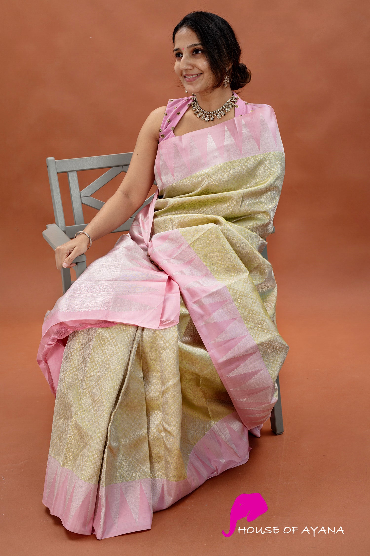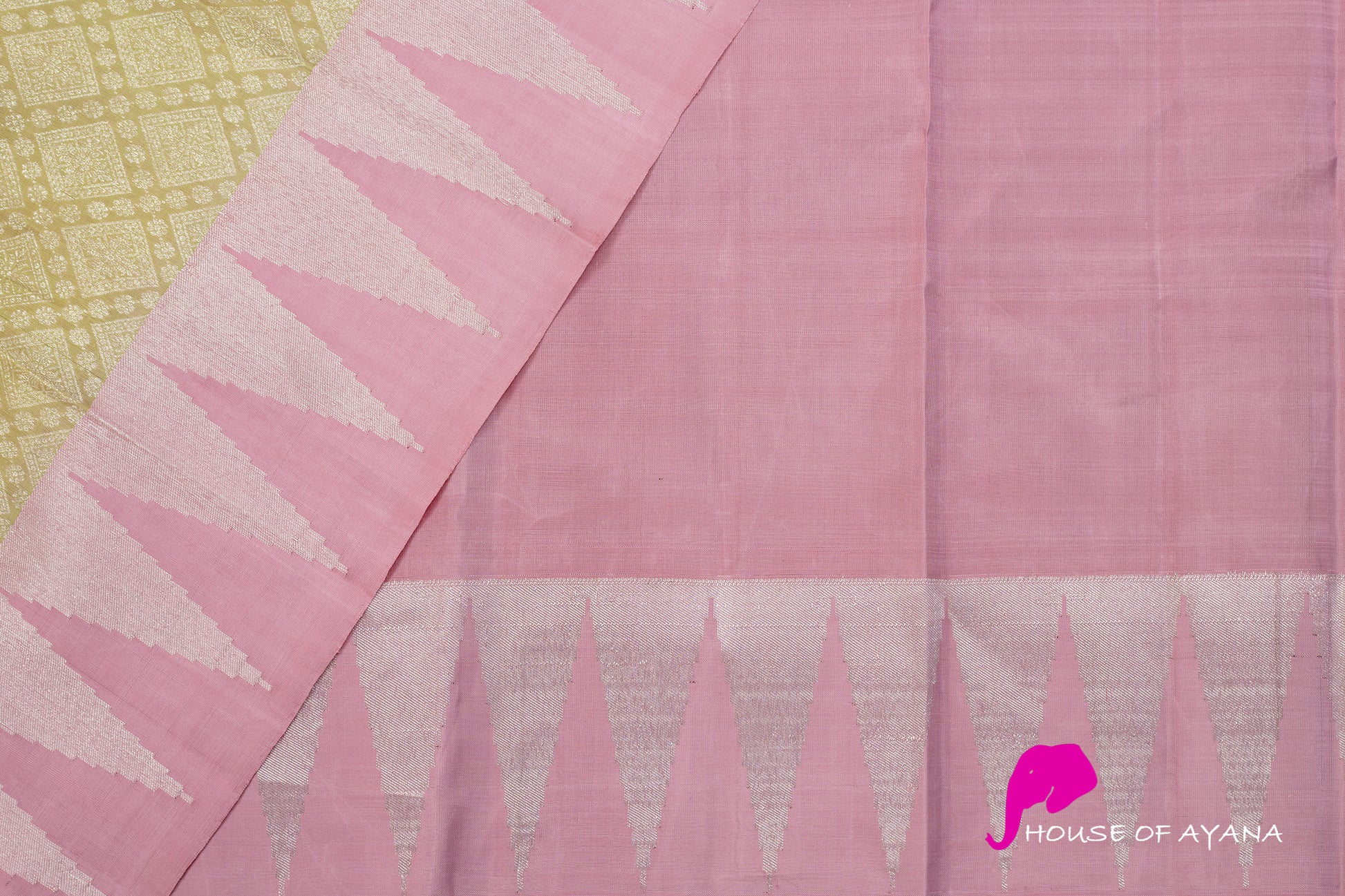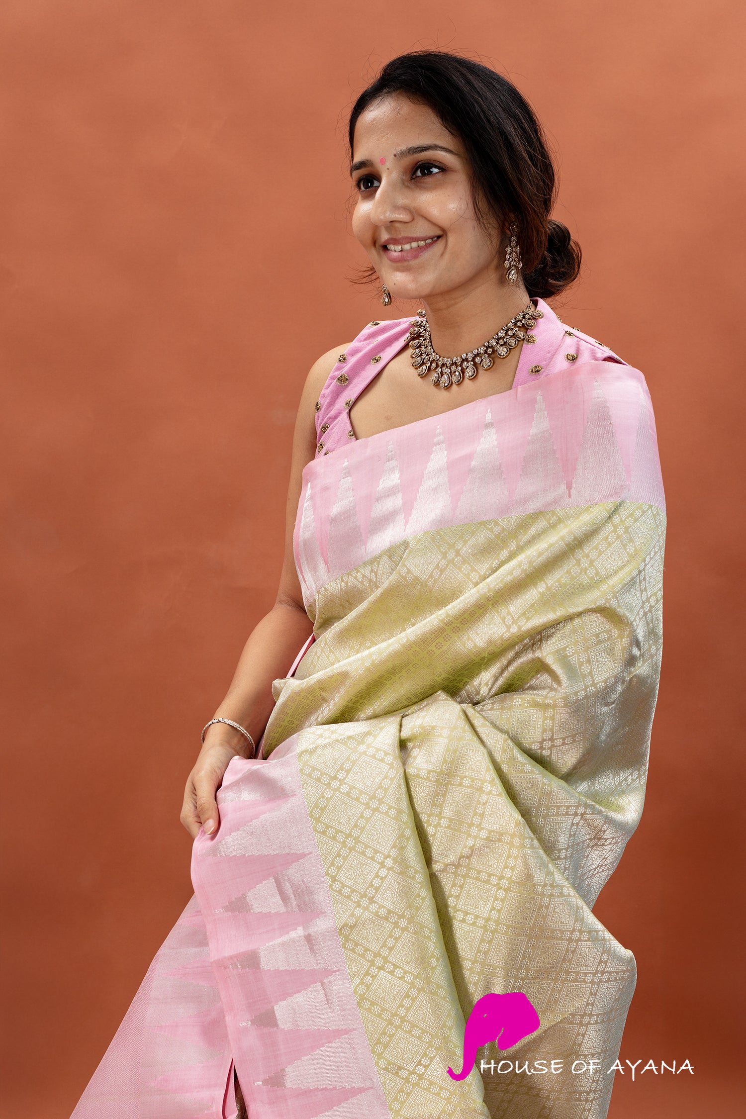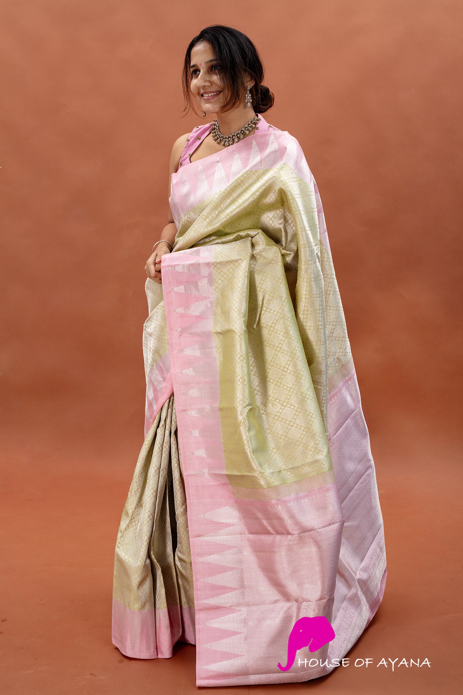 - Kanjivaram pure silk saree, handwoven in pastel green with silver zari motifs all over. Completed with a rare and stunning baby pink temple border and grand pallu, making it a true head turner.