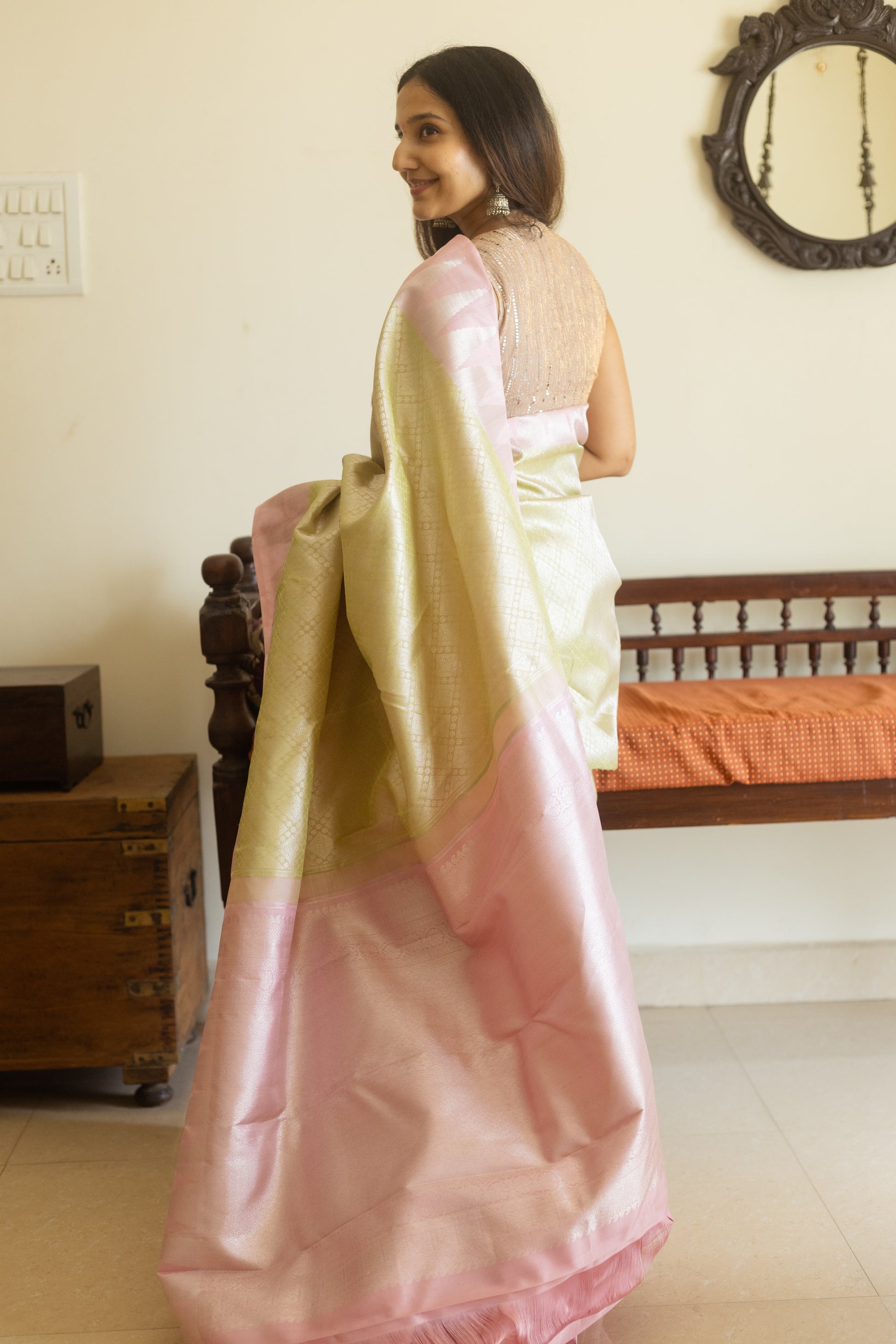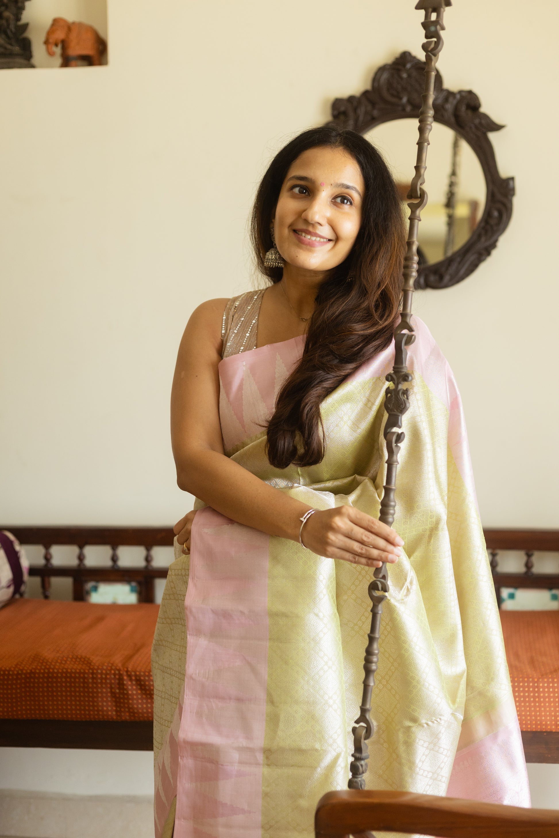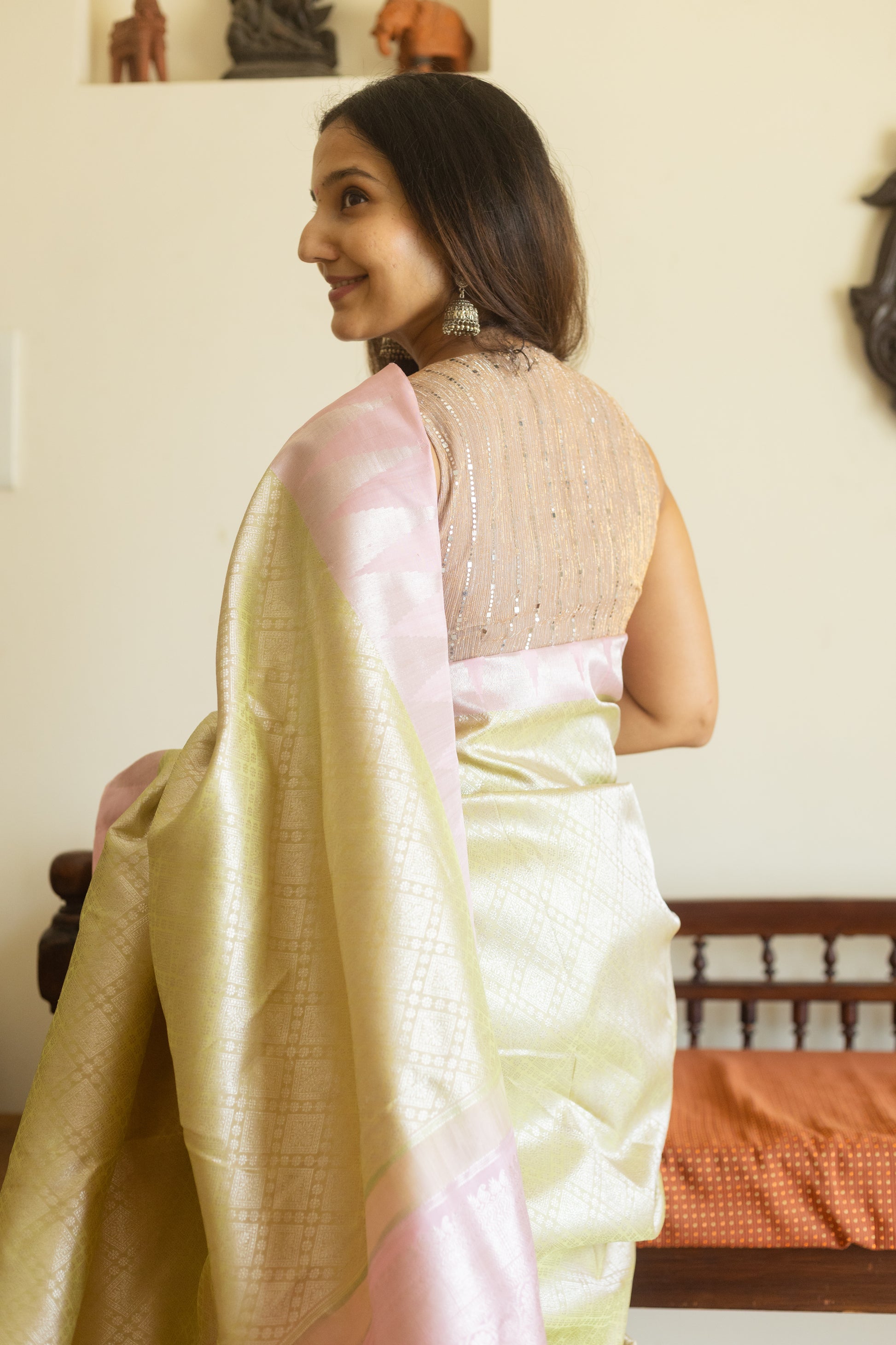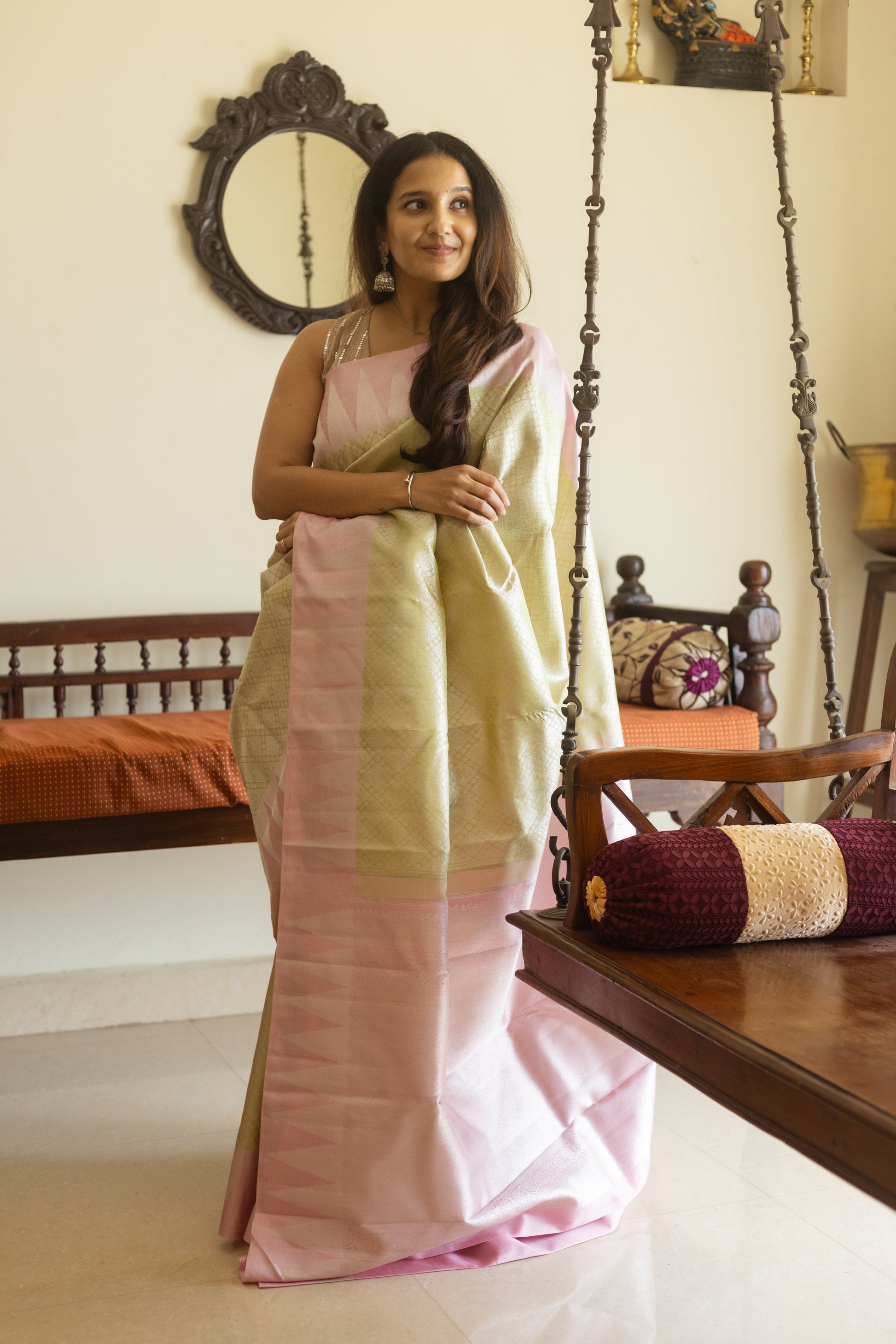 - Kanjivaram pure silk saree, handwoven in pastel green with silver zari motifs all over. Completed with a rare and stunning baby pink temple border and grand pallu, making it a true head turner.