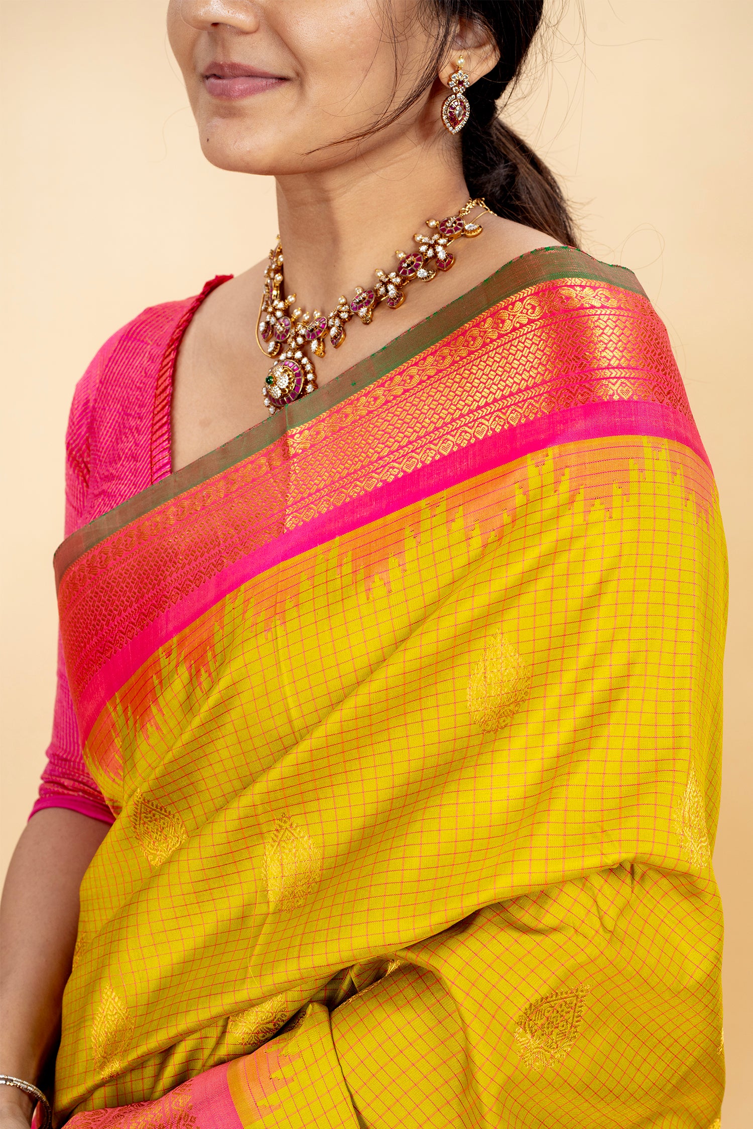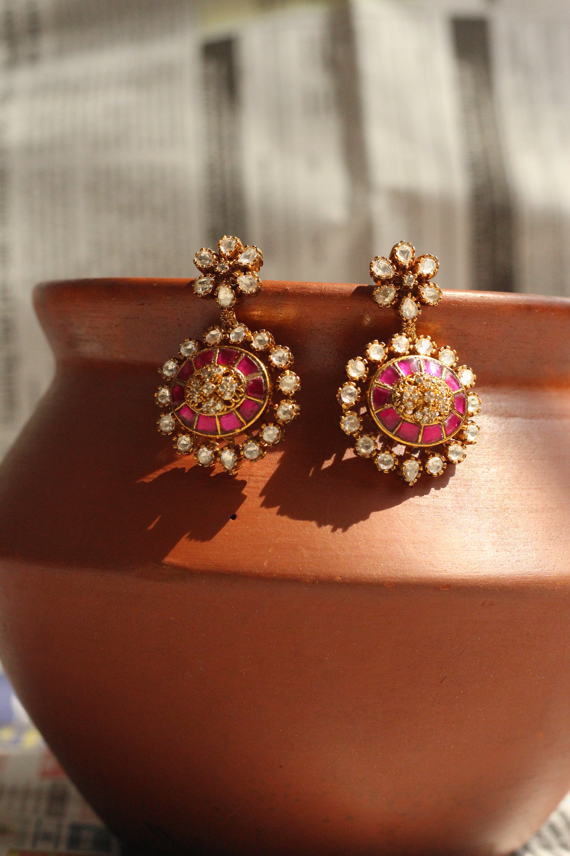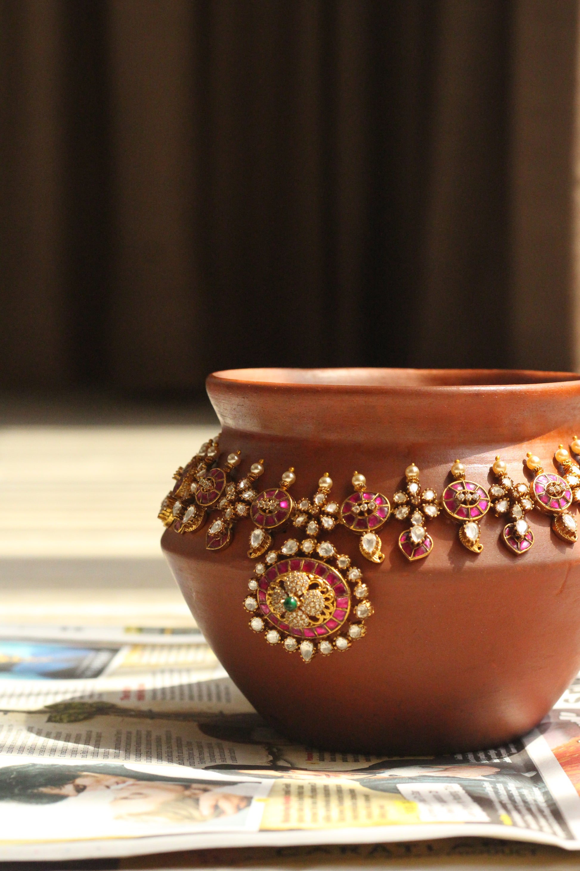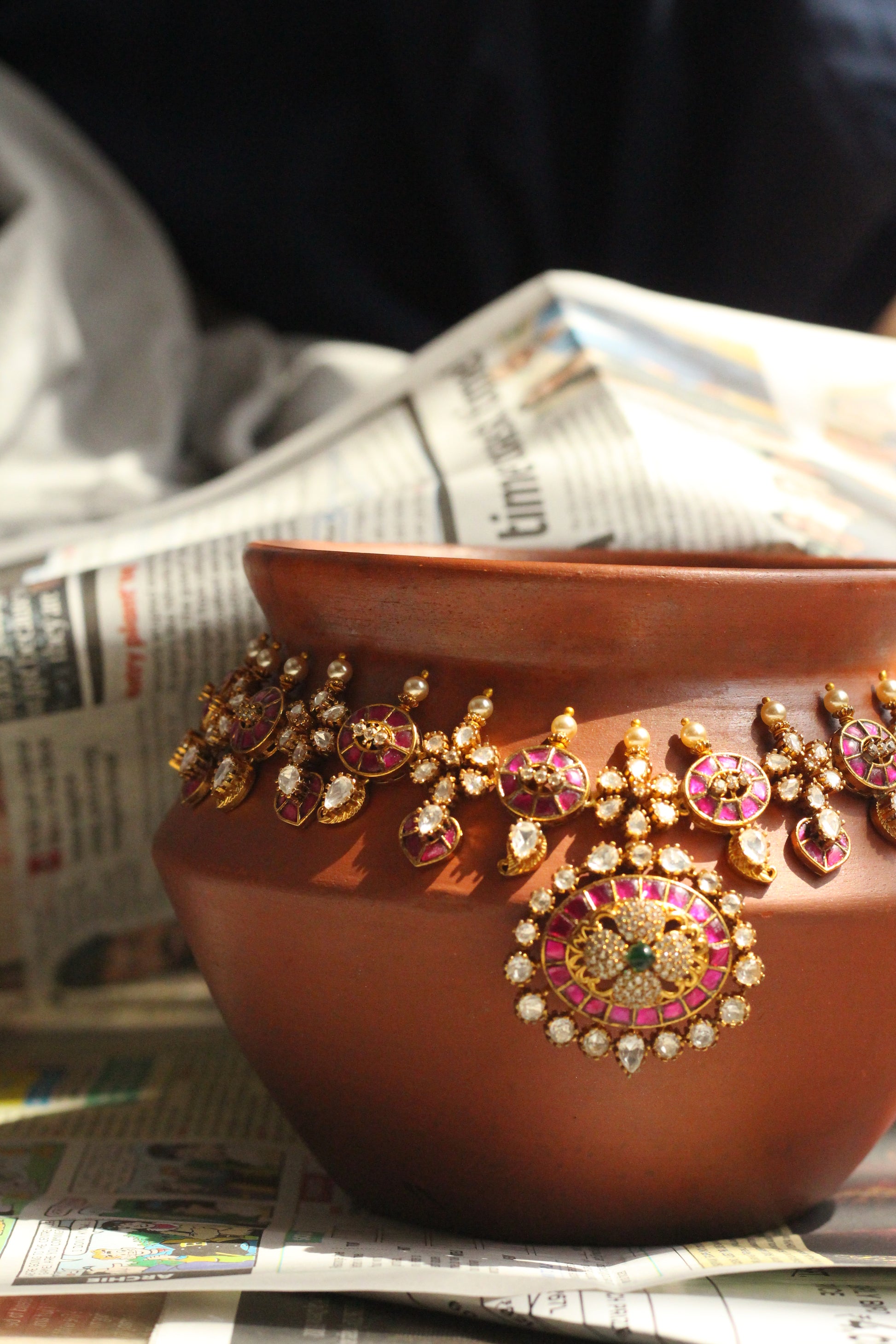 Ruby and polki have been set this way in South Indian ateliers for centuries — the deep red against uncut diamond, gold holding everything together. This haaram set follows that same hand, that same logic. Heavy enough to feel like it means something. Considered enough to wear to the occasion that does.
