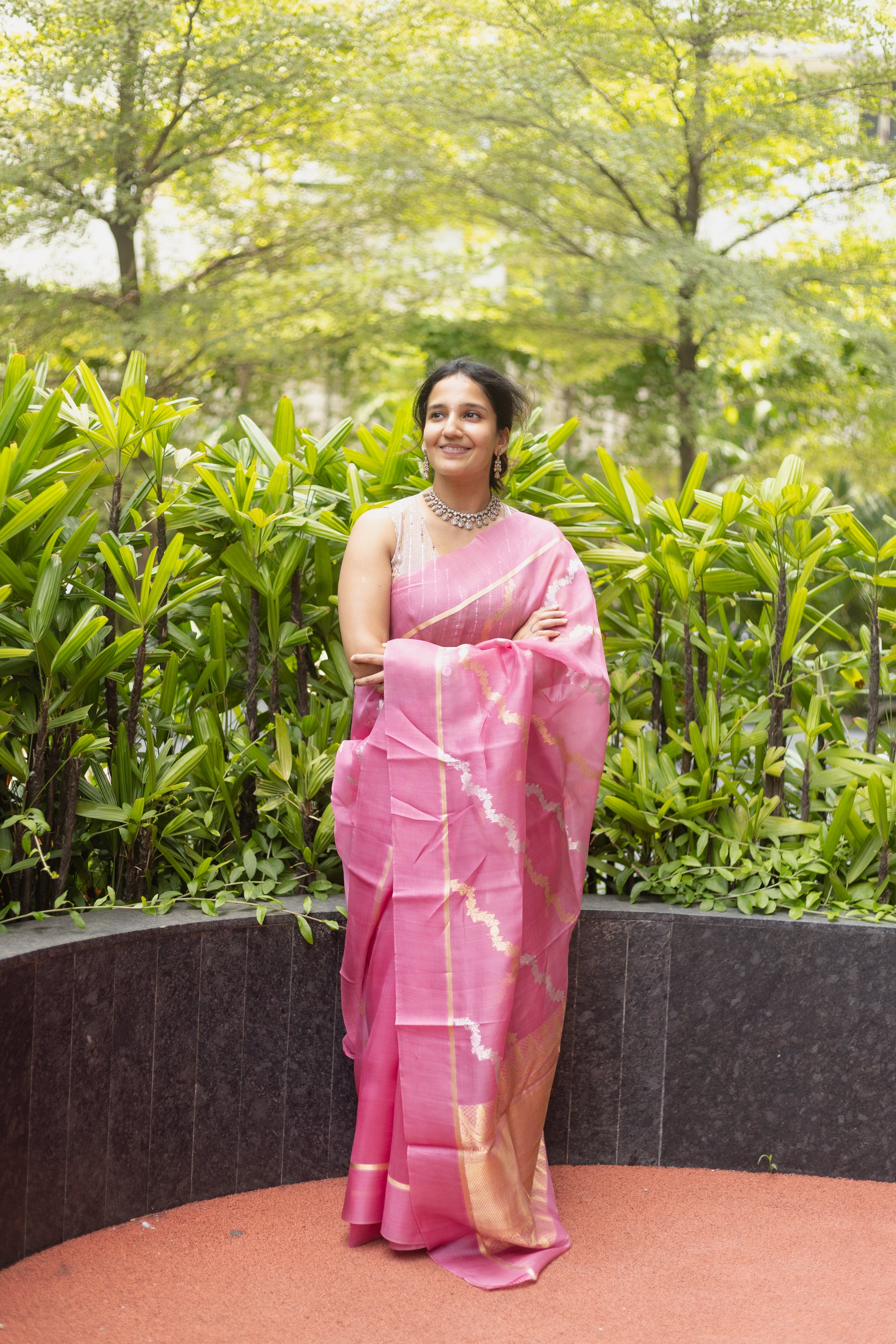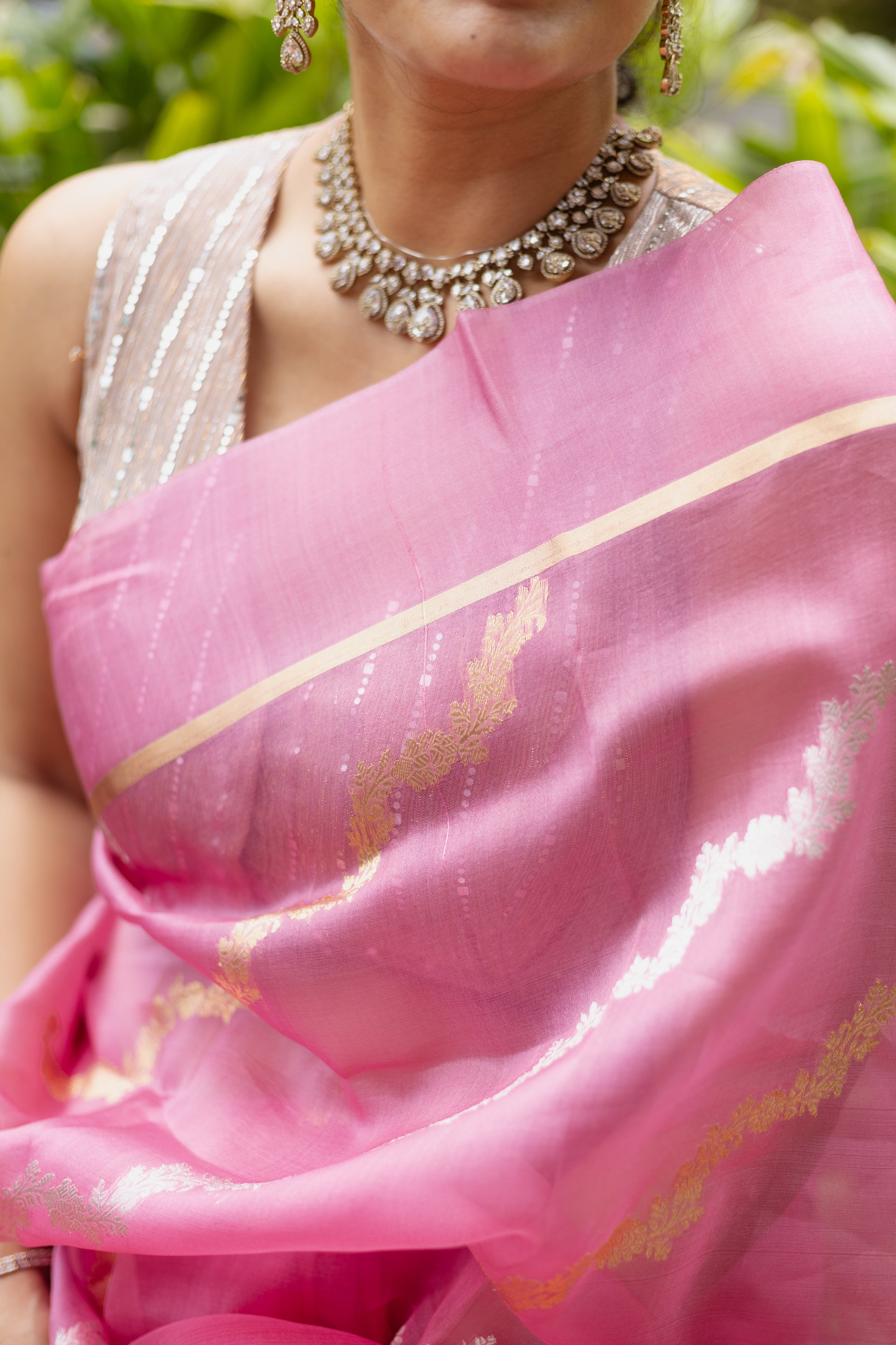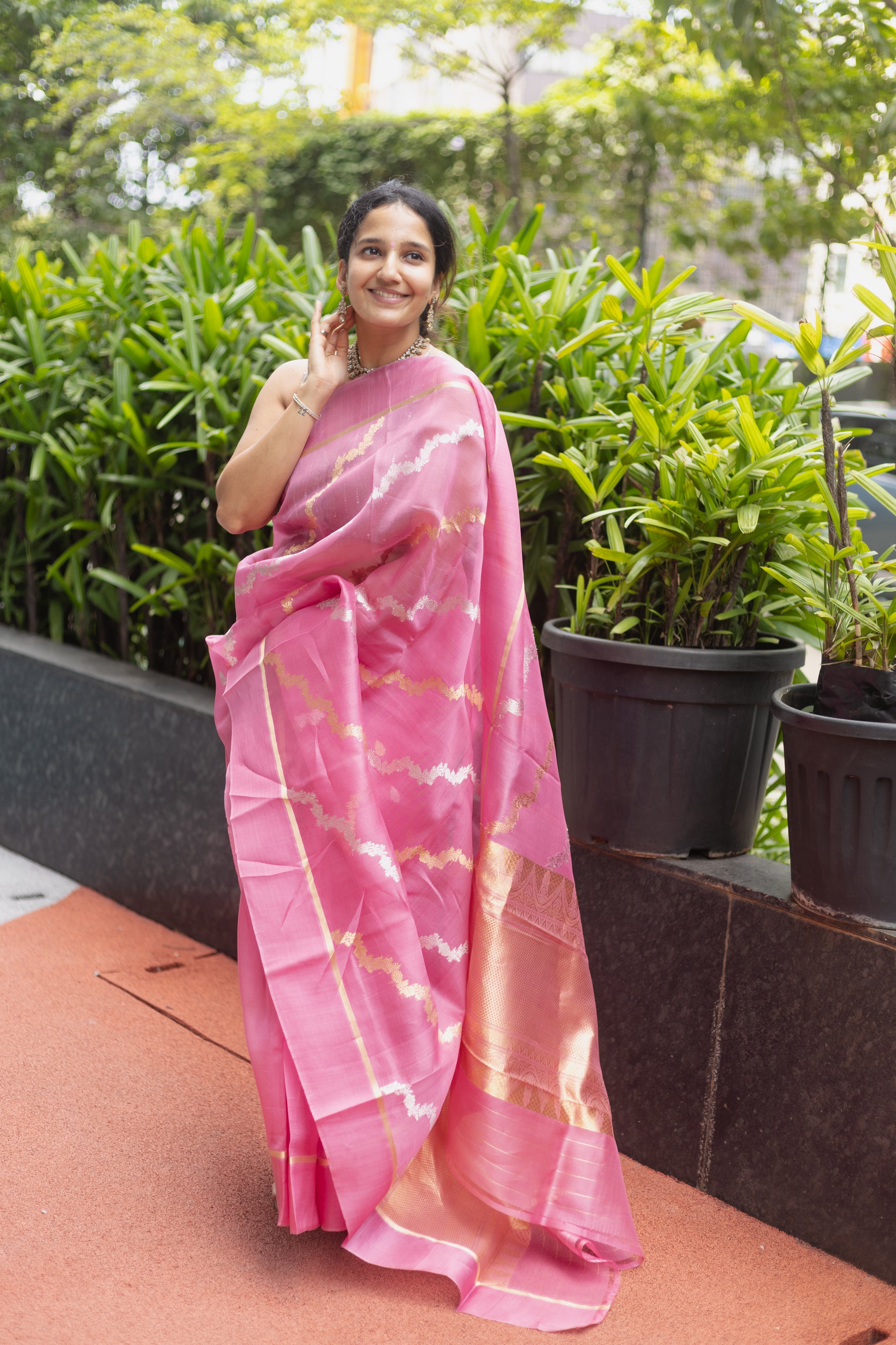 Banaras organza silk saree handwoven with silver and gold zari designs with kadwa technique