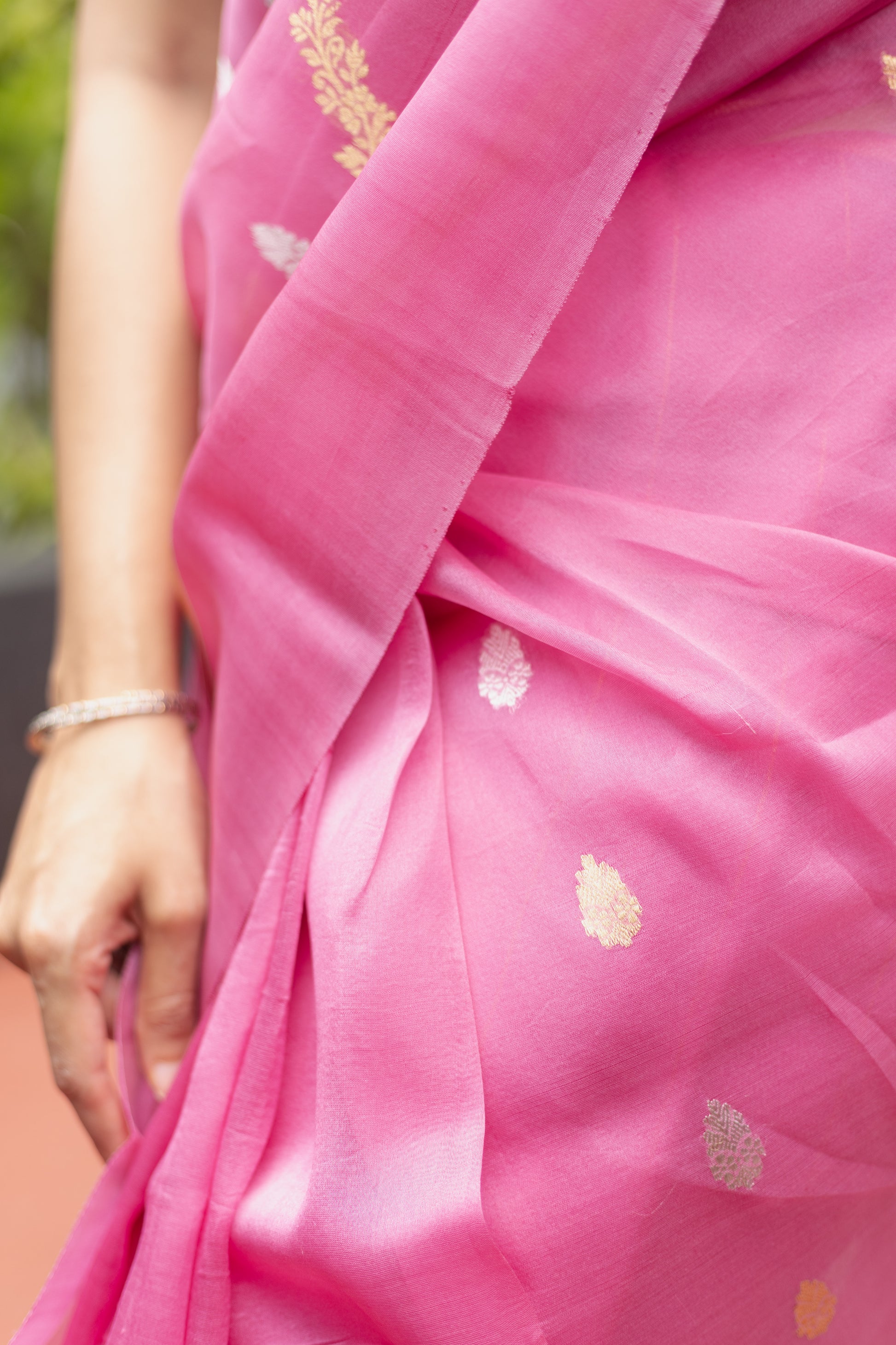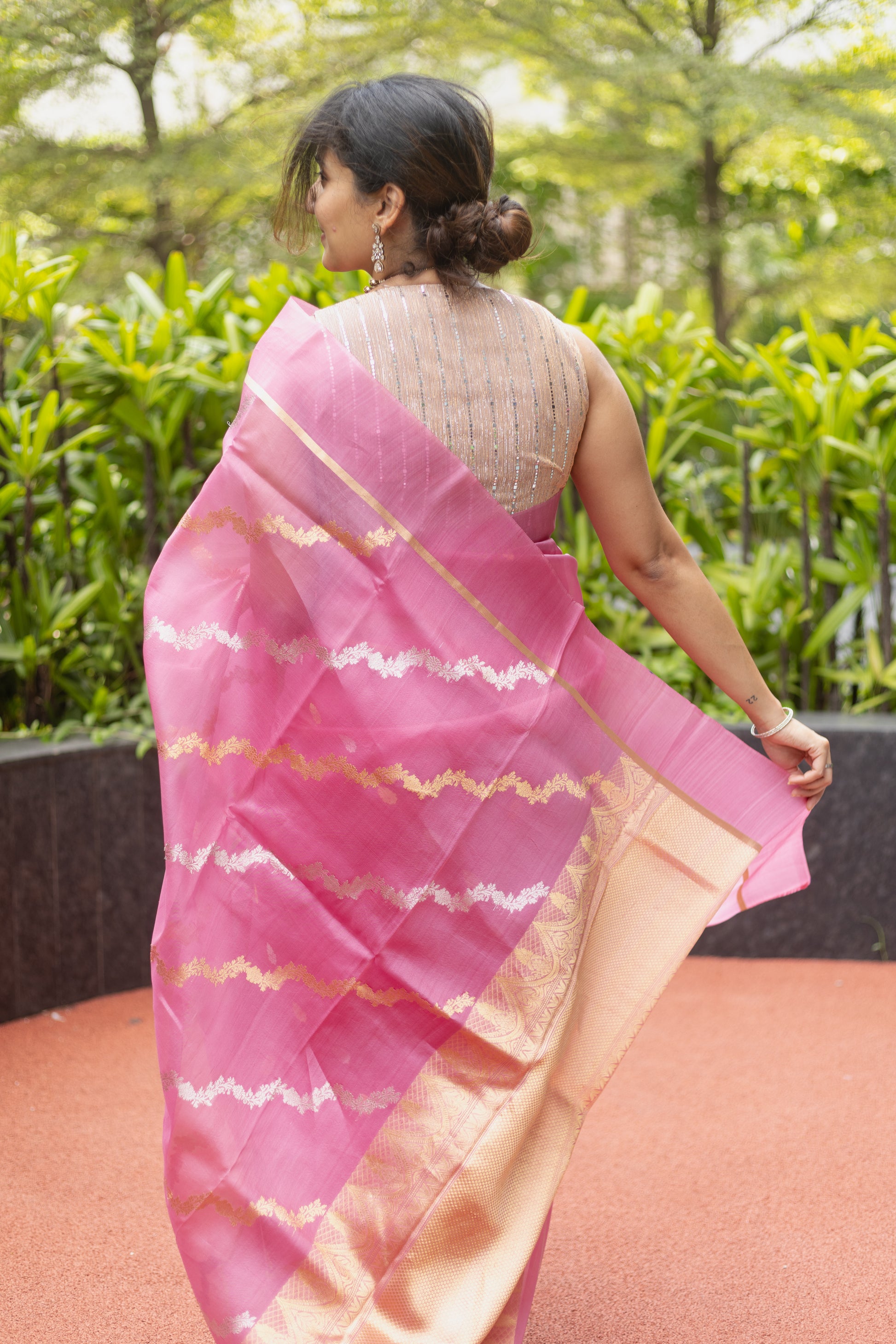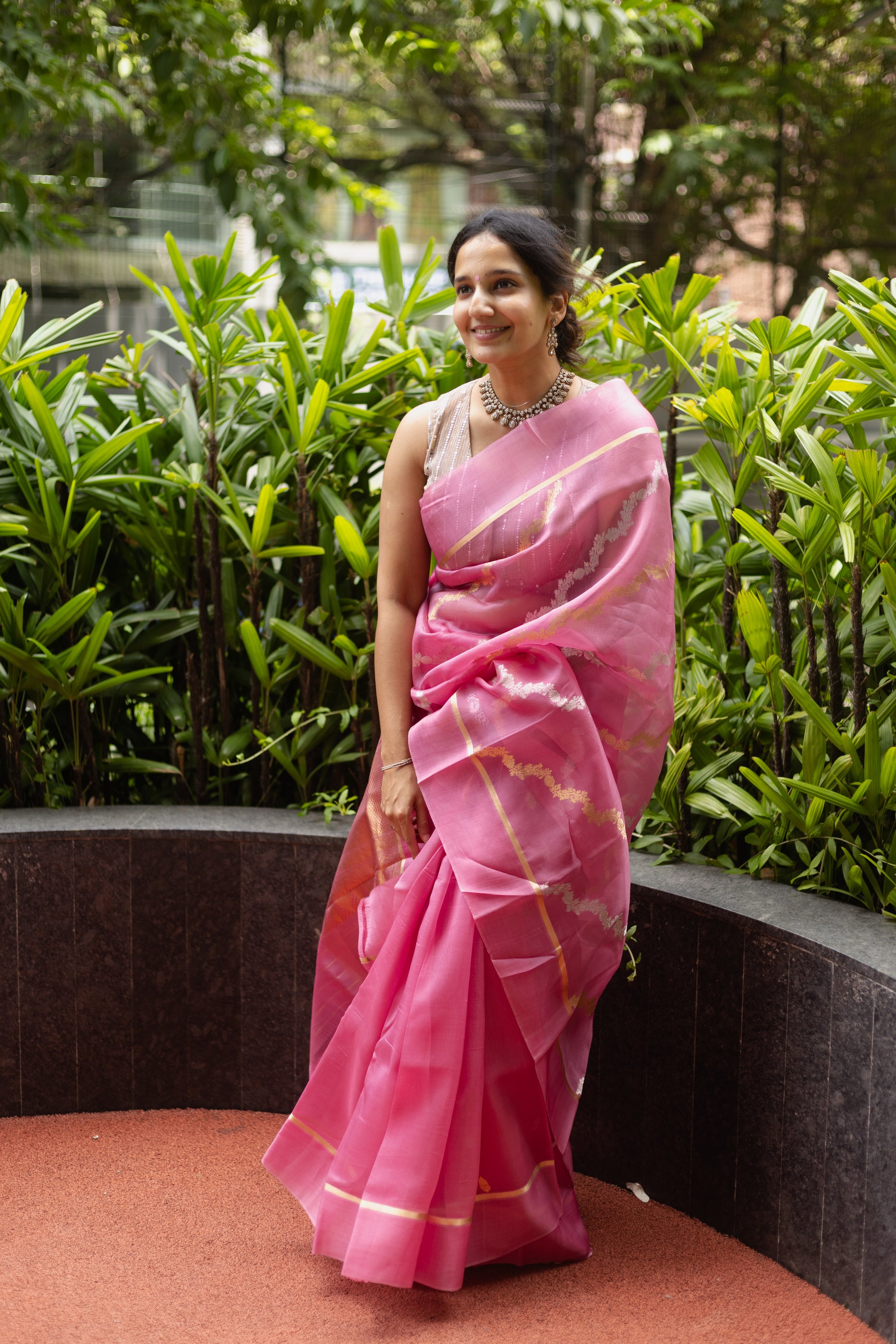 Banaras organza silk saree handwoven with silver and gold zari designs with kadwa technique