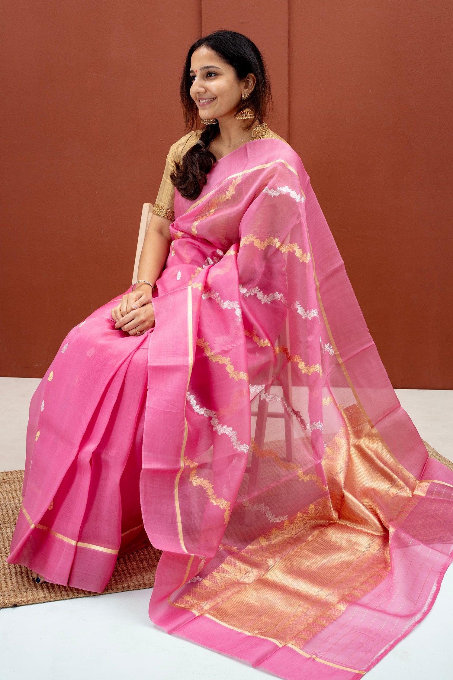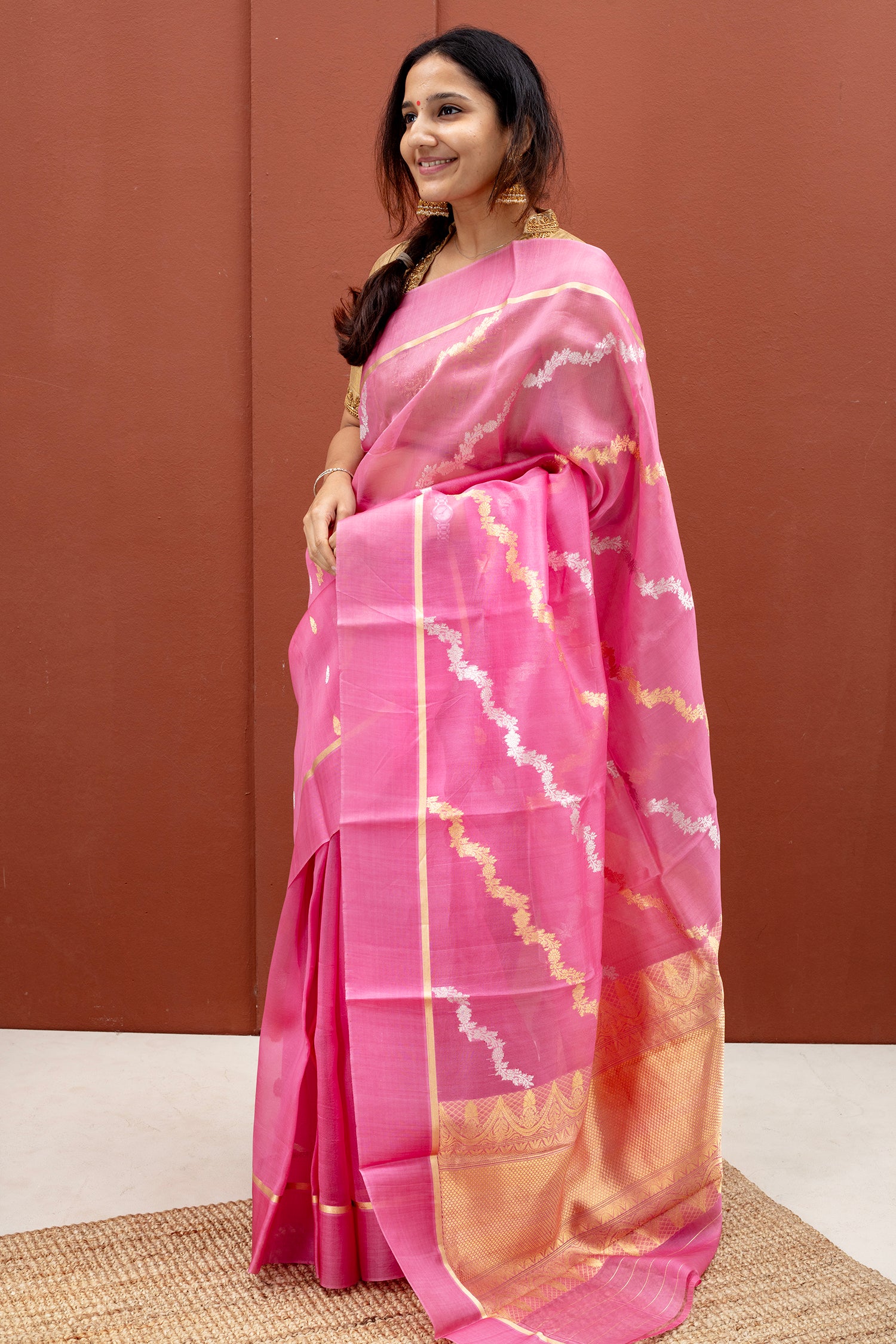 - Matching banaras organza silk blouse with zari designs all over