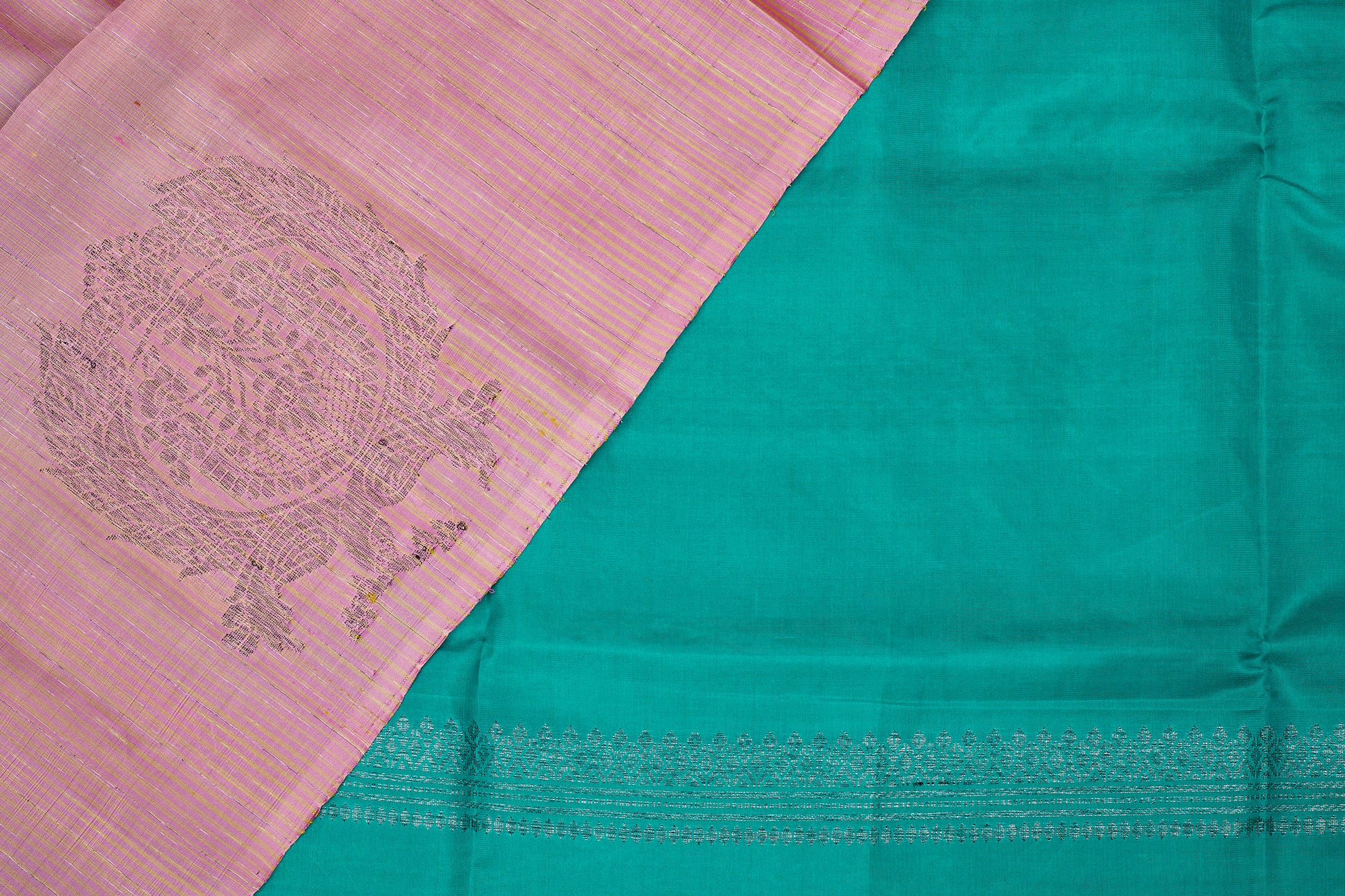 - Kanjivaram lightweight silk saree, handwoven with intricate silver zari motifs all over; completed with a grand contrast pallu