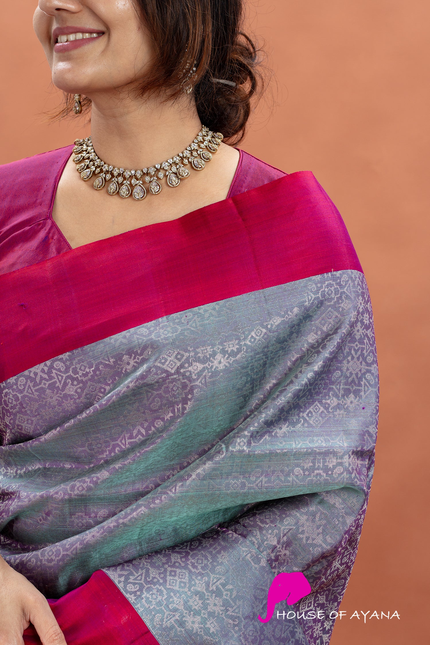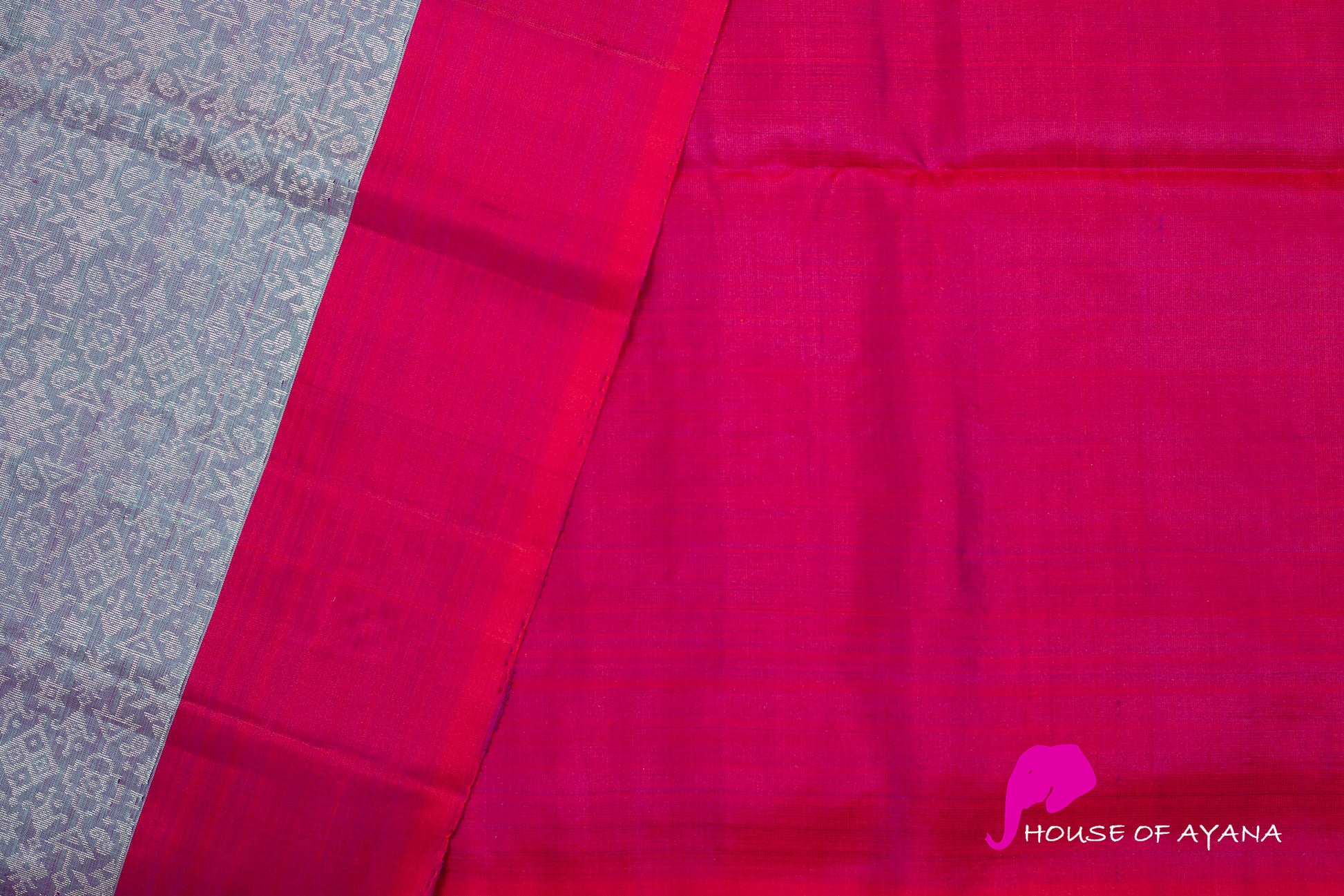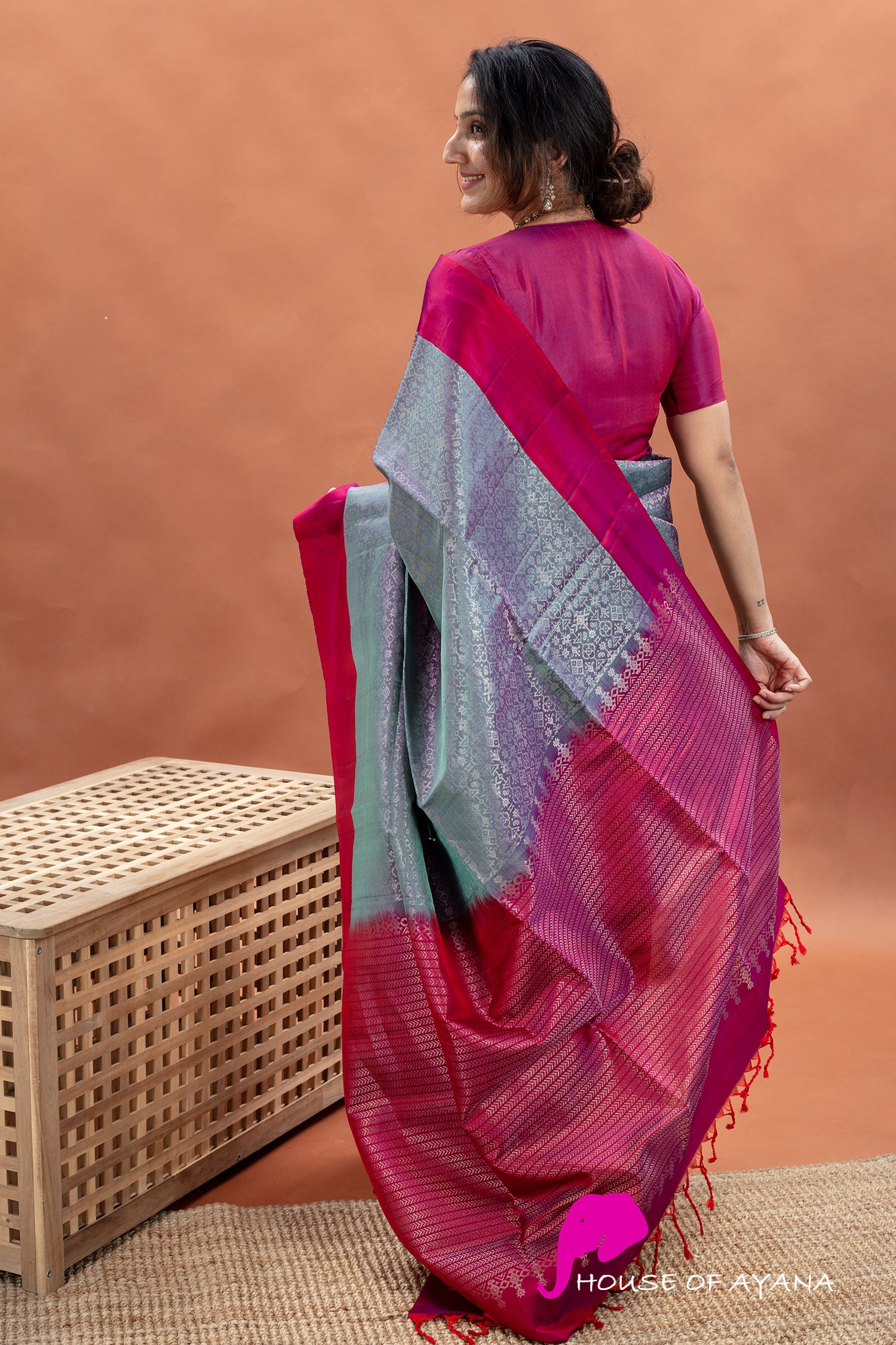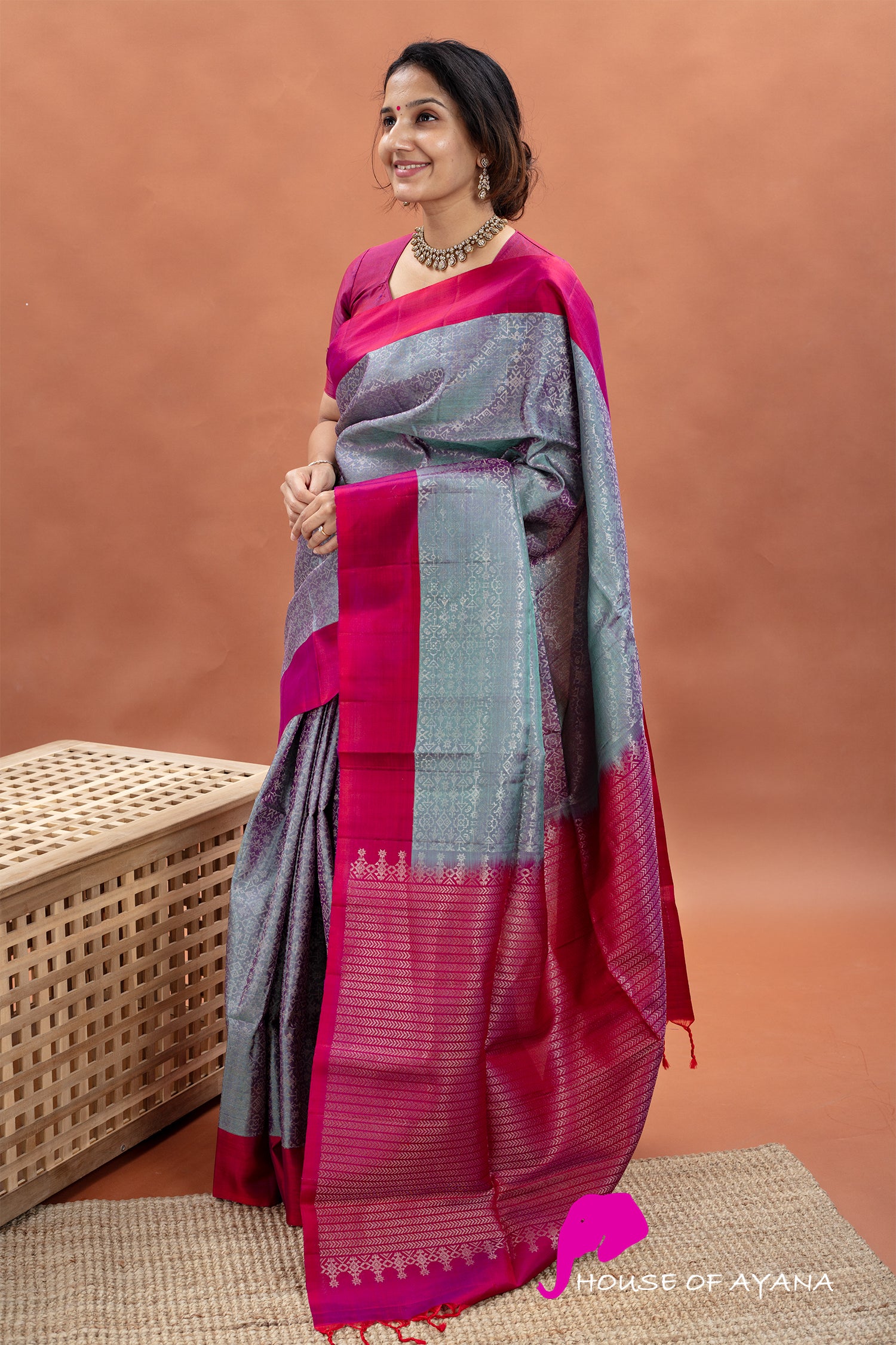 - Kanjivaram lightweight silk saree, handwoven with contrast borders and grand zari pallu