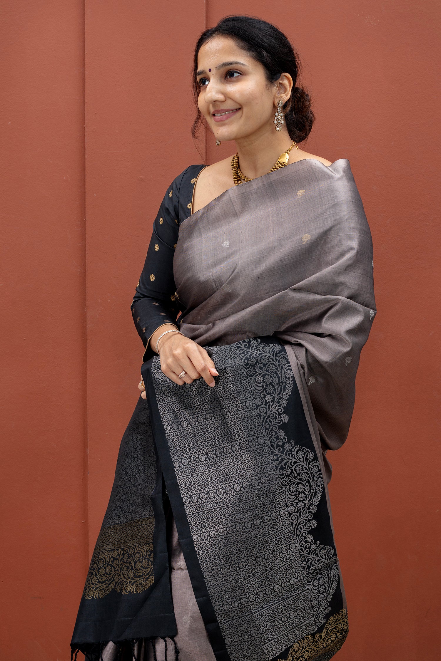 - Kanjivaram lightweight silk saree, handwoven with contrast borders and grand zari pallu