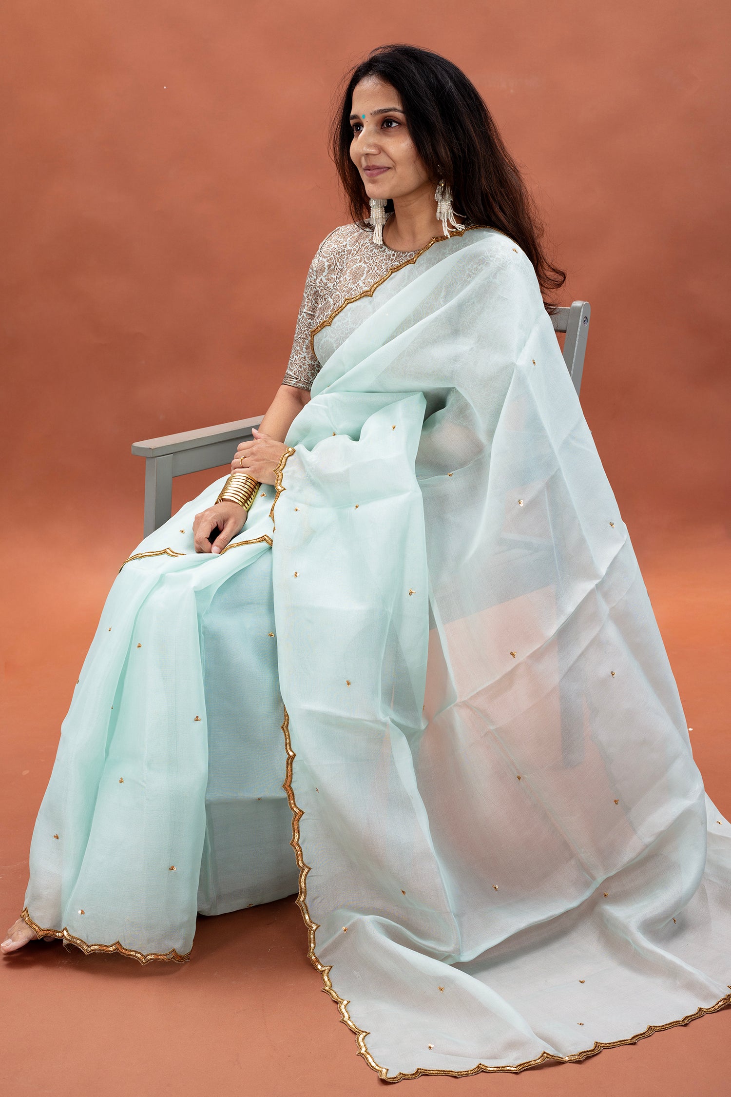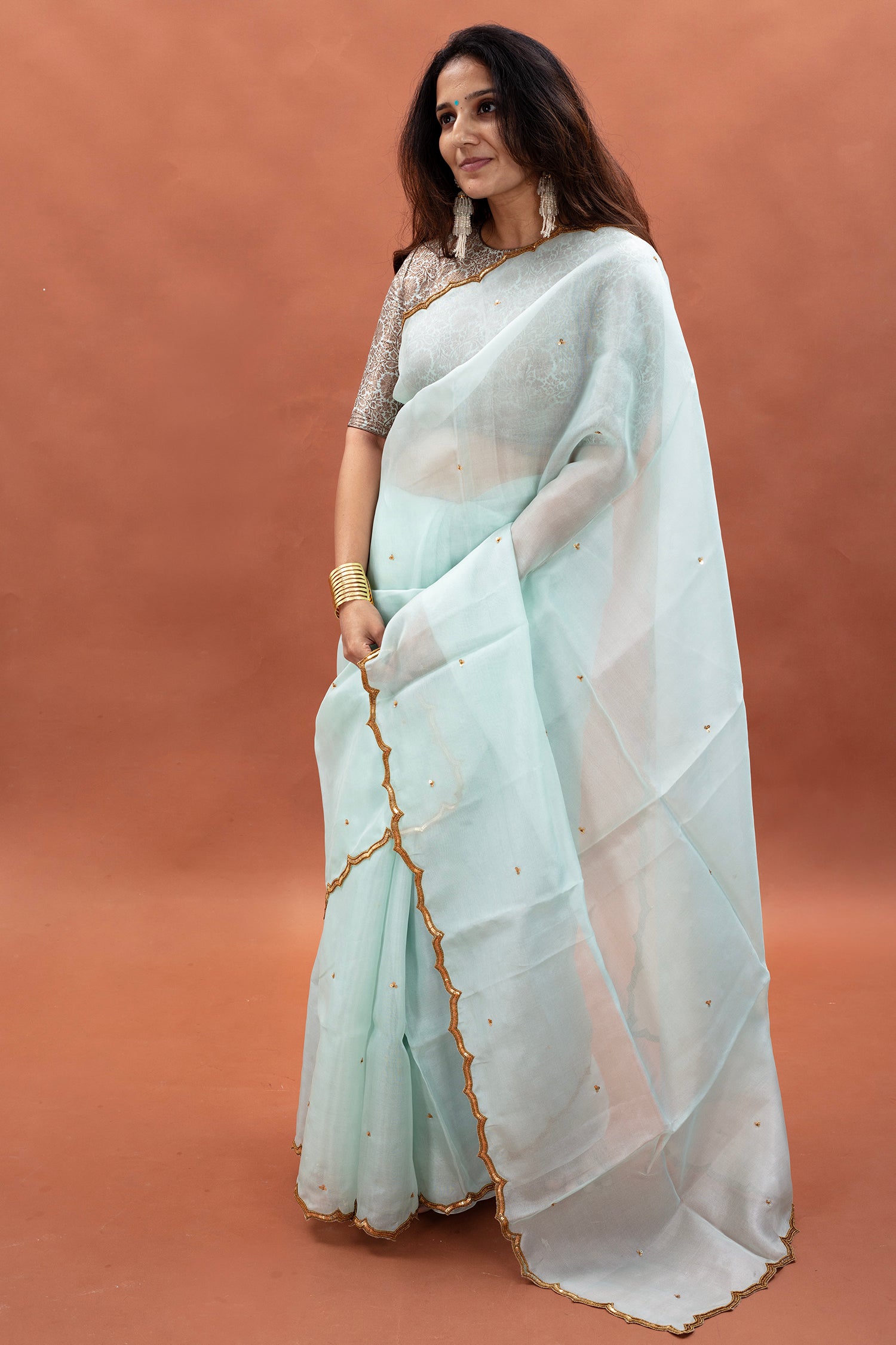 - Organza silk saree, hand dyed with hand embroidered scallop borders