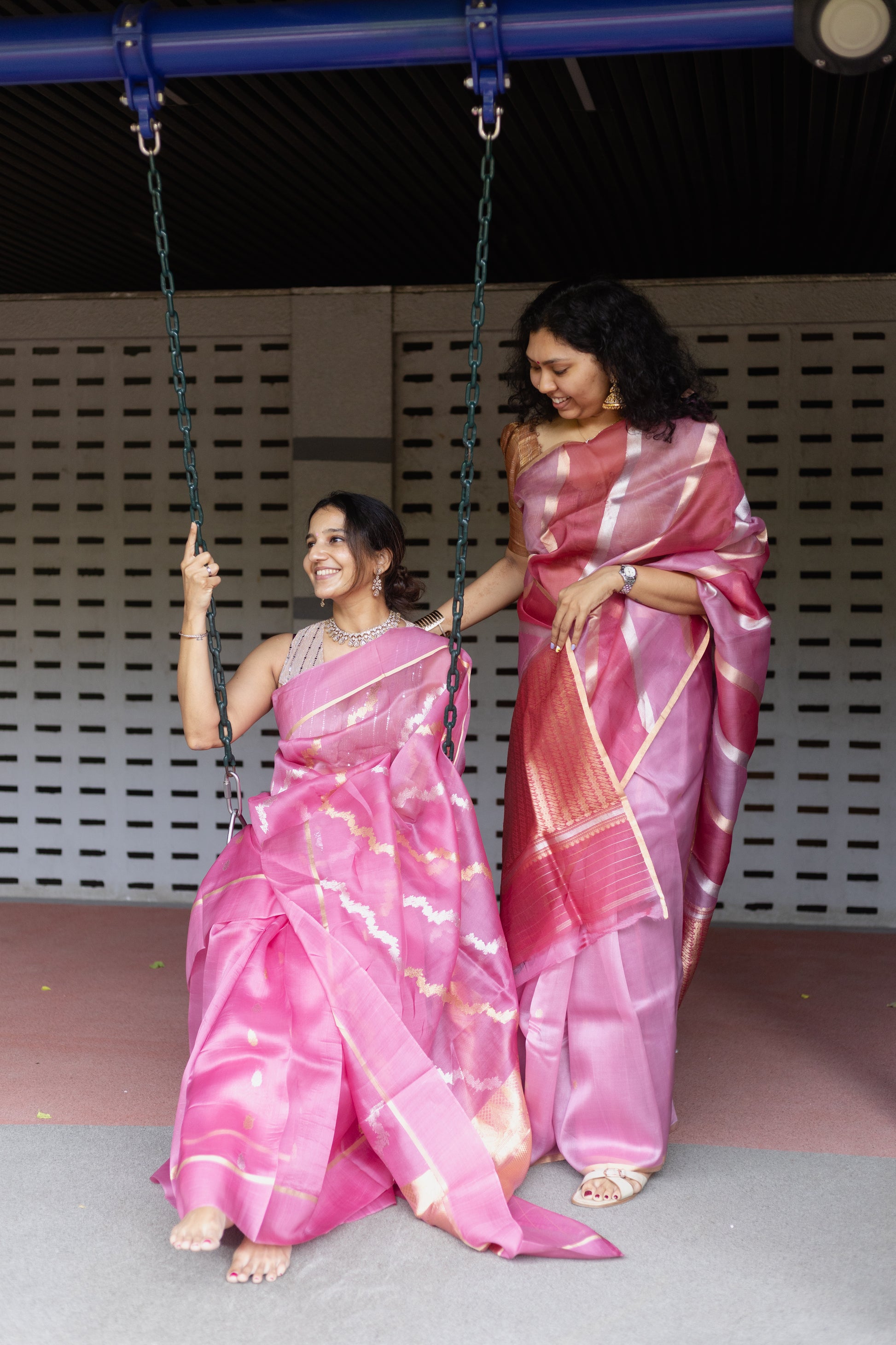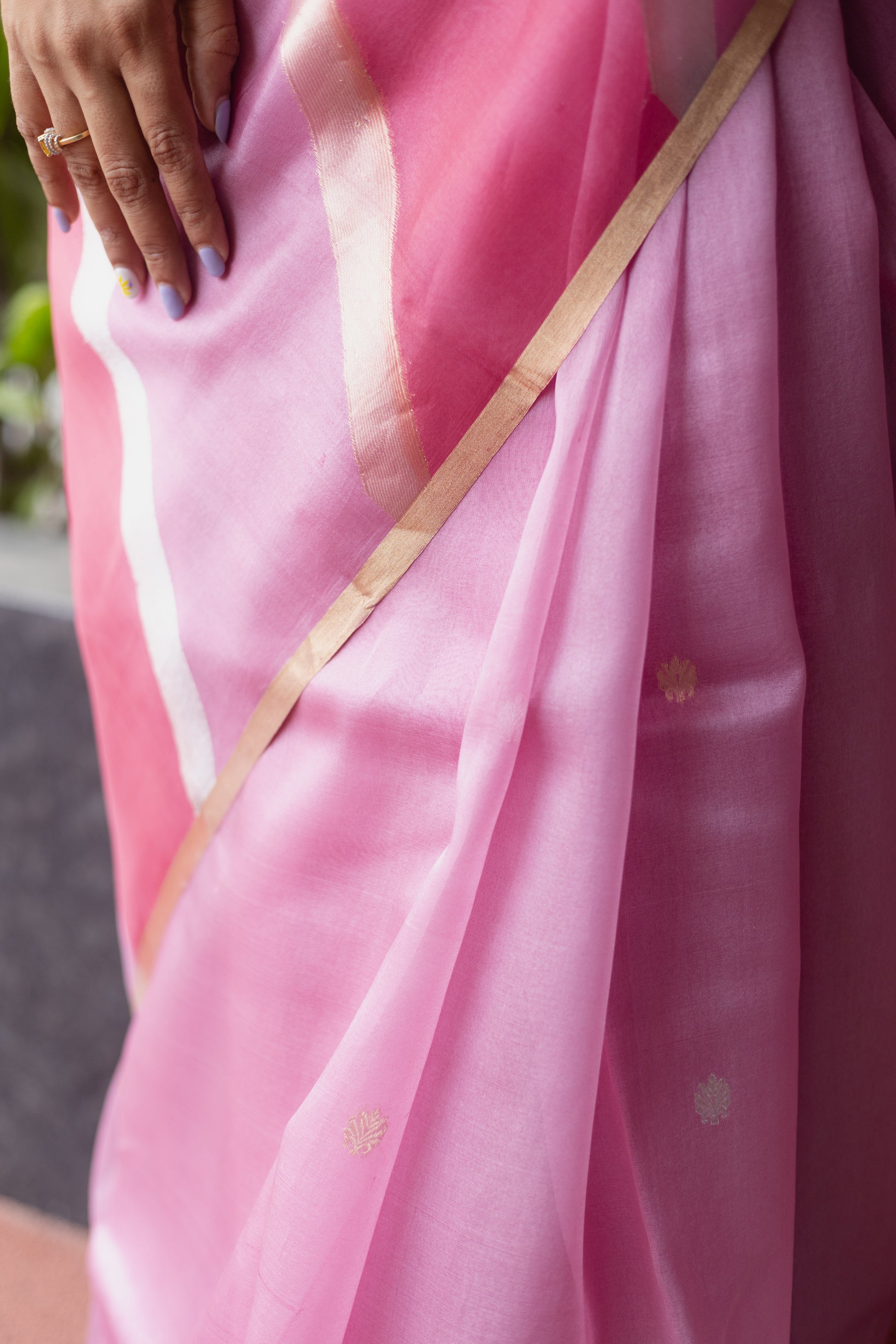 Banaras organza silk saree handwoven with silver and gold zari designs with kadwa technique