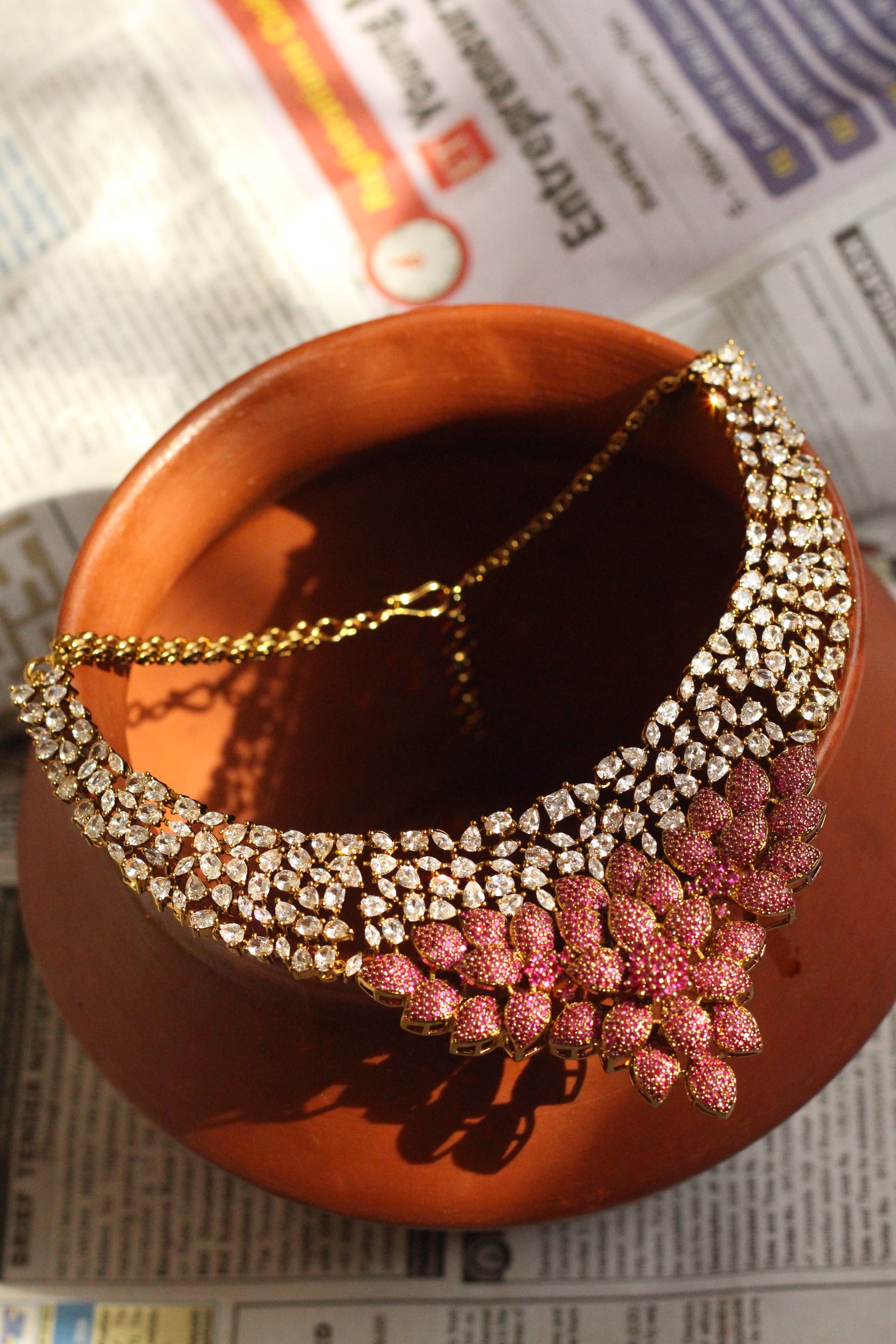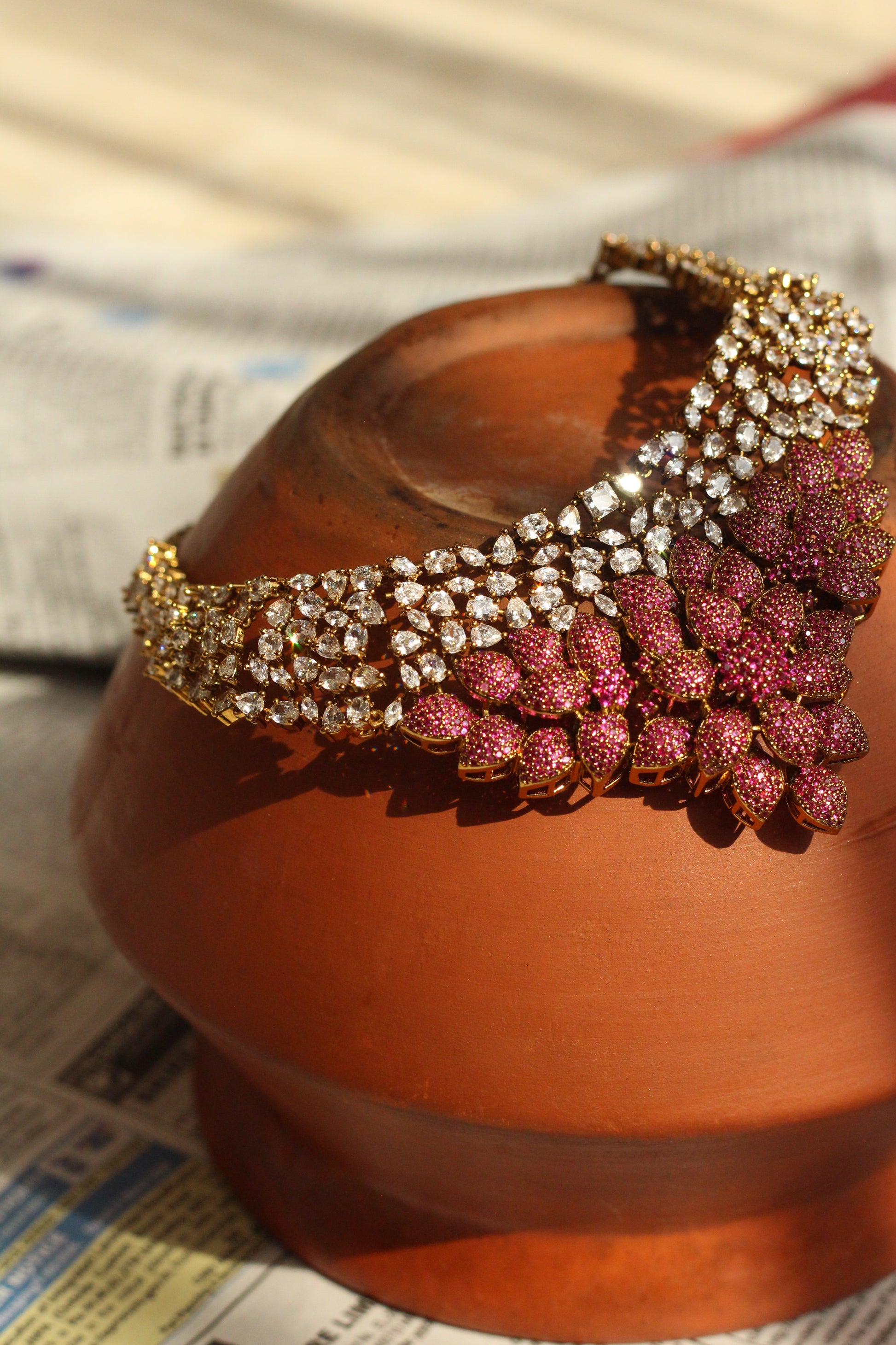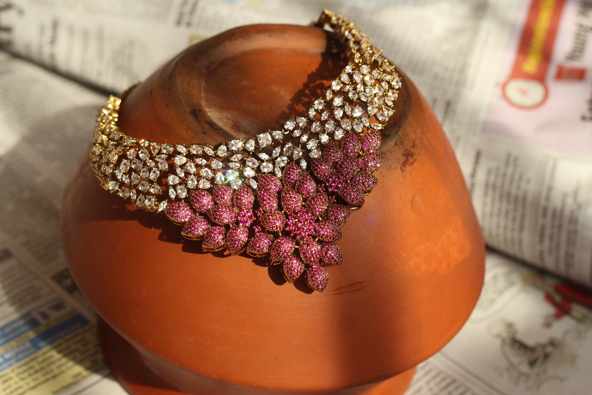 In temple ritual, pushpanjali is the offering of flowers — both hands cupped, petals released. This necklace holds that gesture. Ruby flowers cluster and cascade below a bed of white diamond, the whole piece spreading outward like an offering mid-release. One of the most elaborate pieces in the Haaram edit. Wear it to the occasion that deserves nothing less.