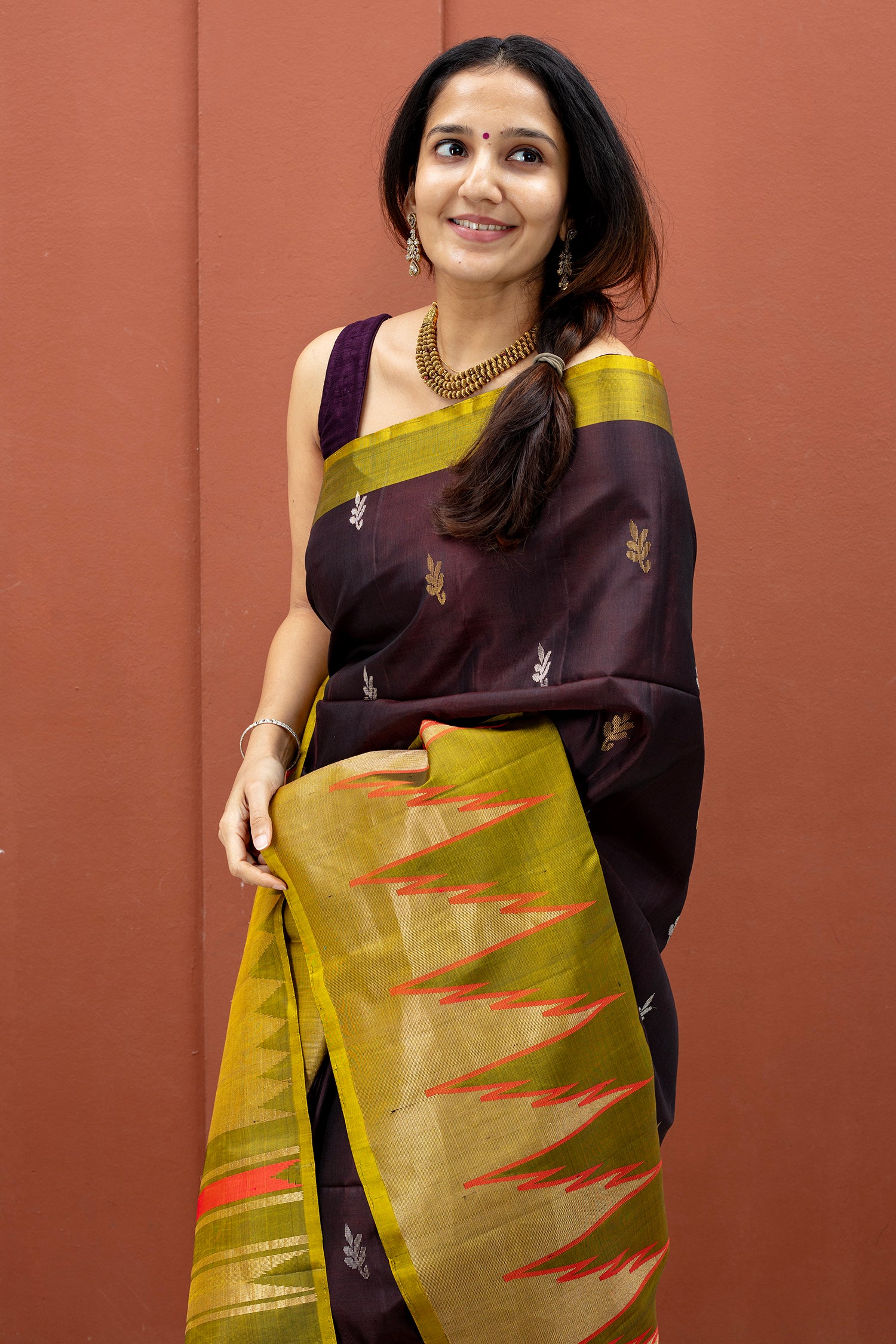 - Kanjivaram lightweight silk saree, handwoven with contrast zari borders and pallu