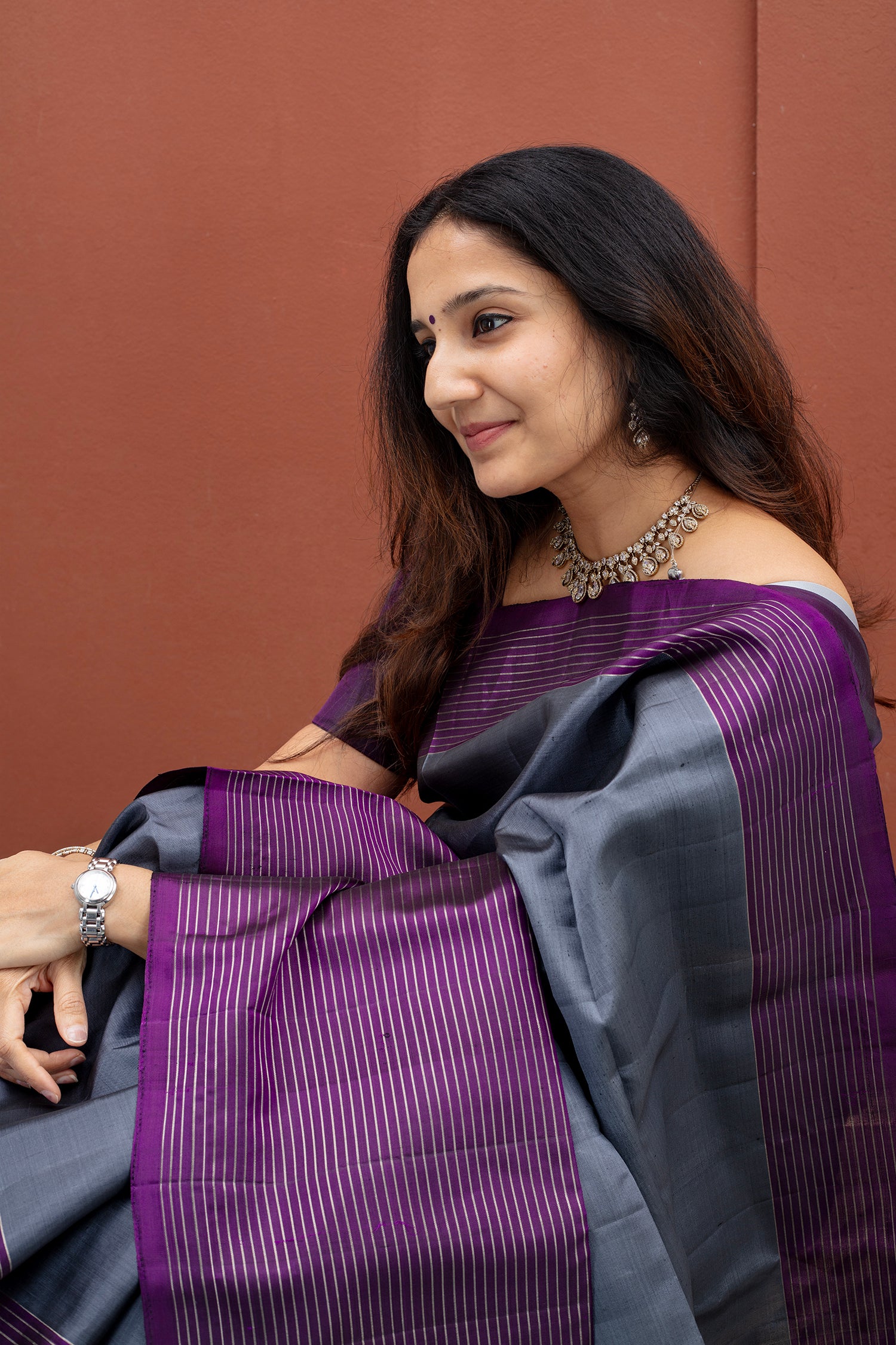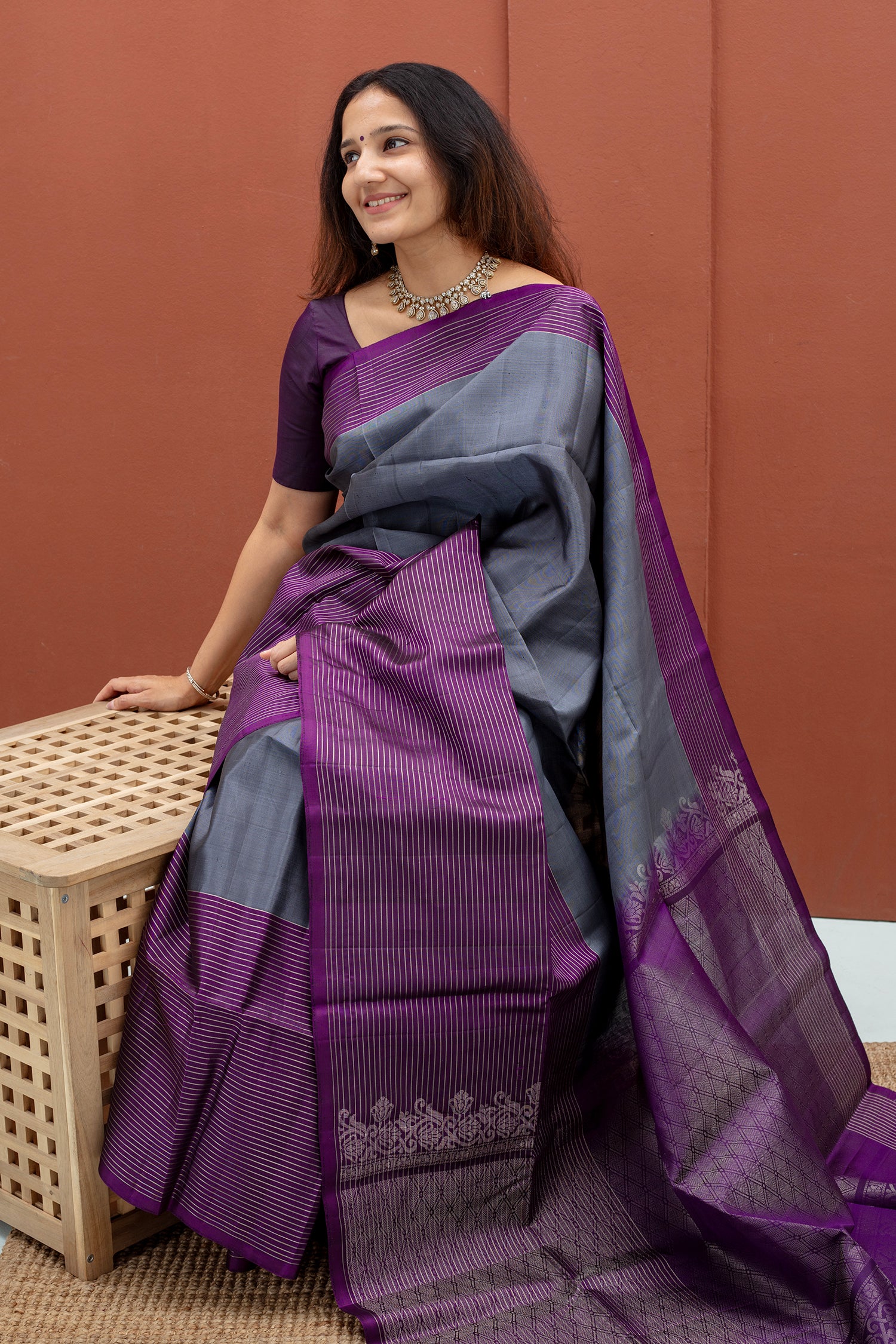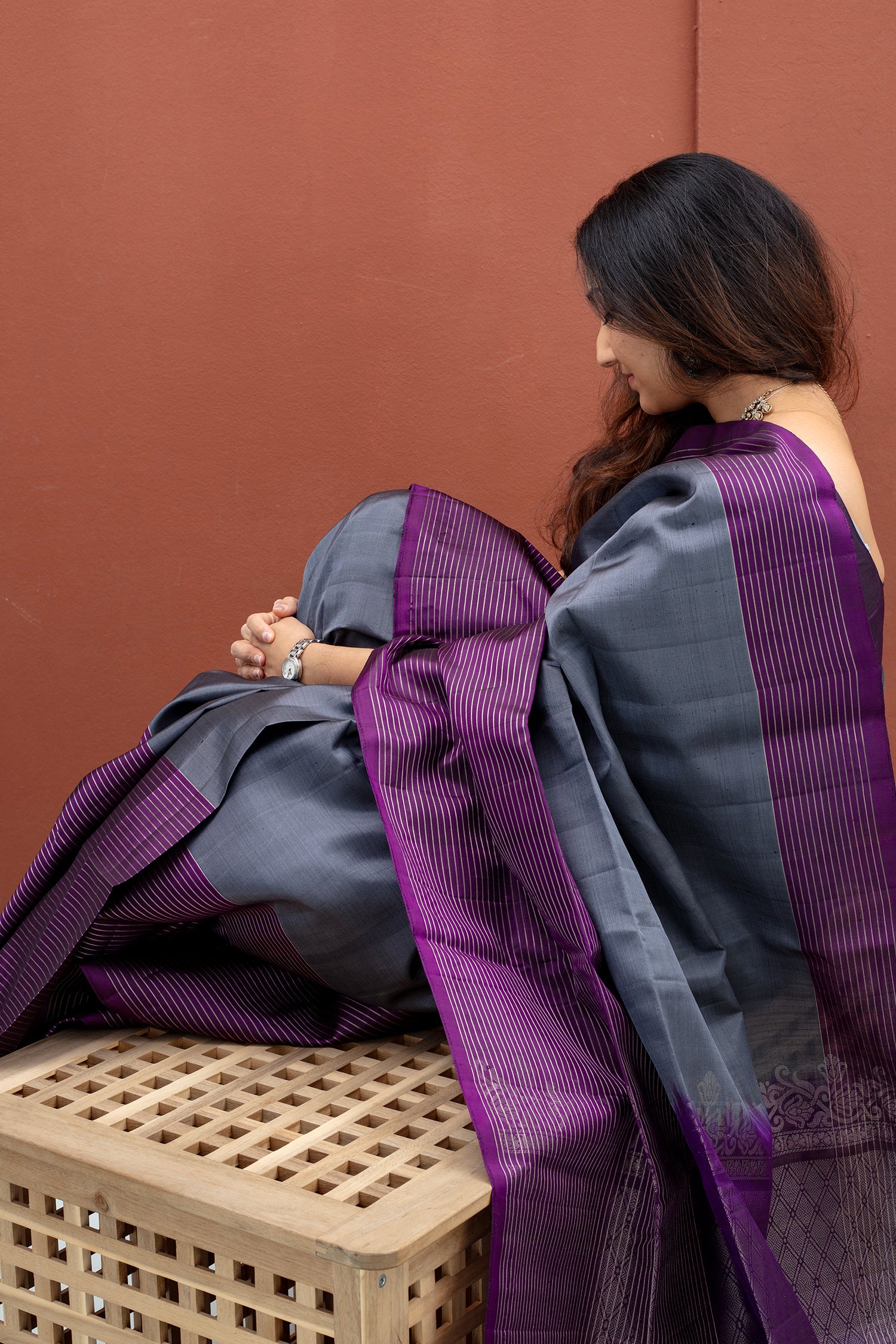 - Kanjivaram lightweight silk saree, handwoven with contrast zari borders and pallu