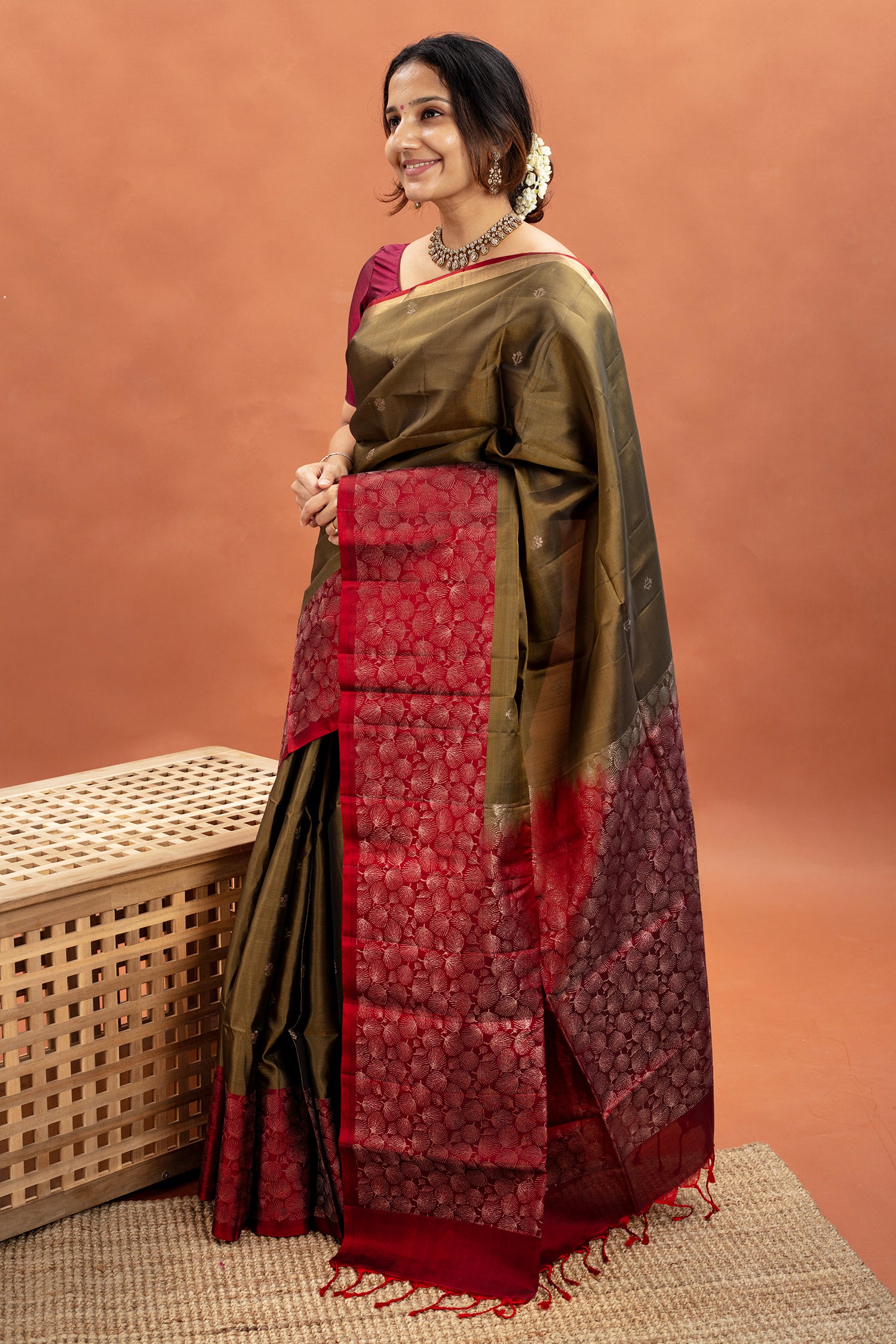 - Kanjivaram lightweight silk saree, handwoven with contrast zari borders and pallu