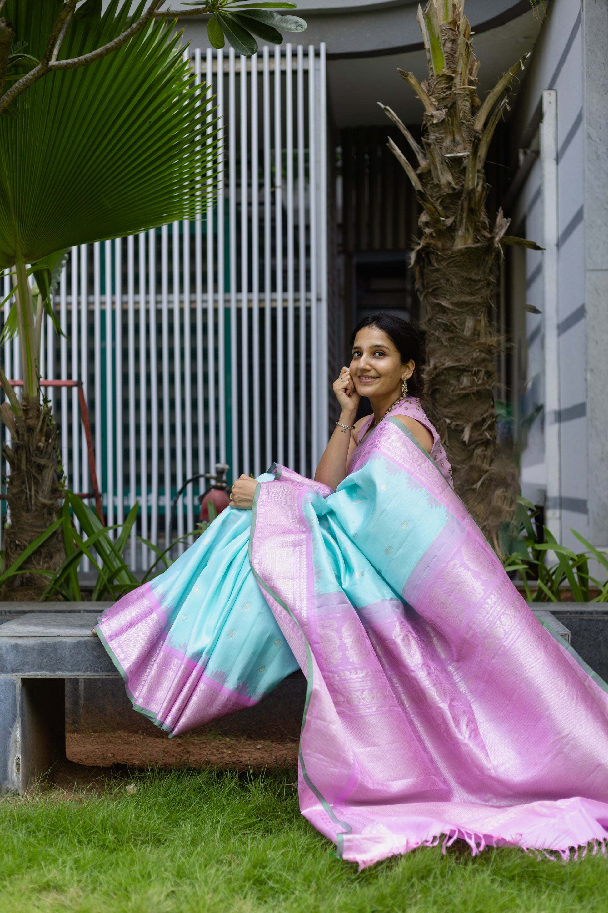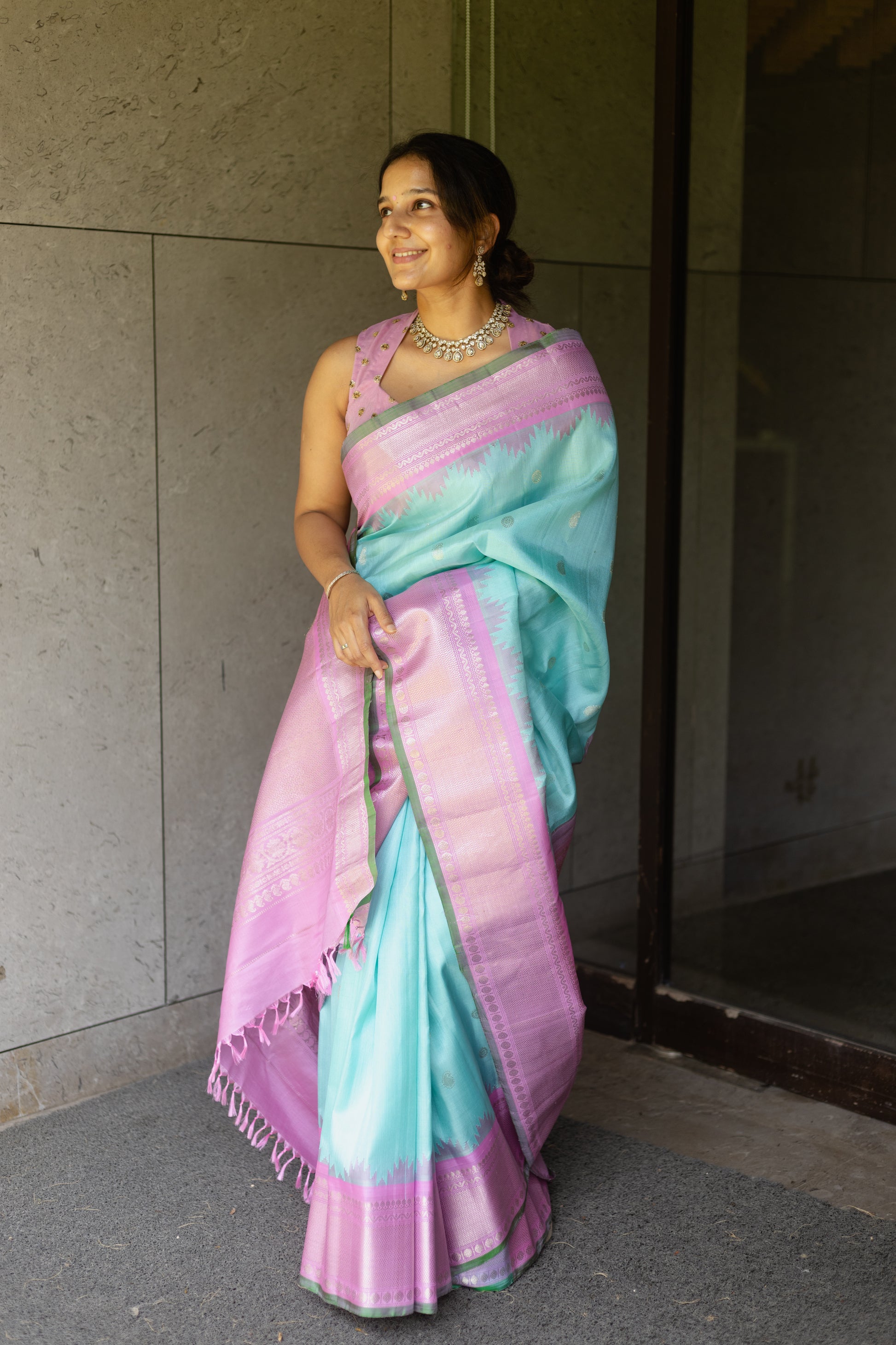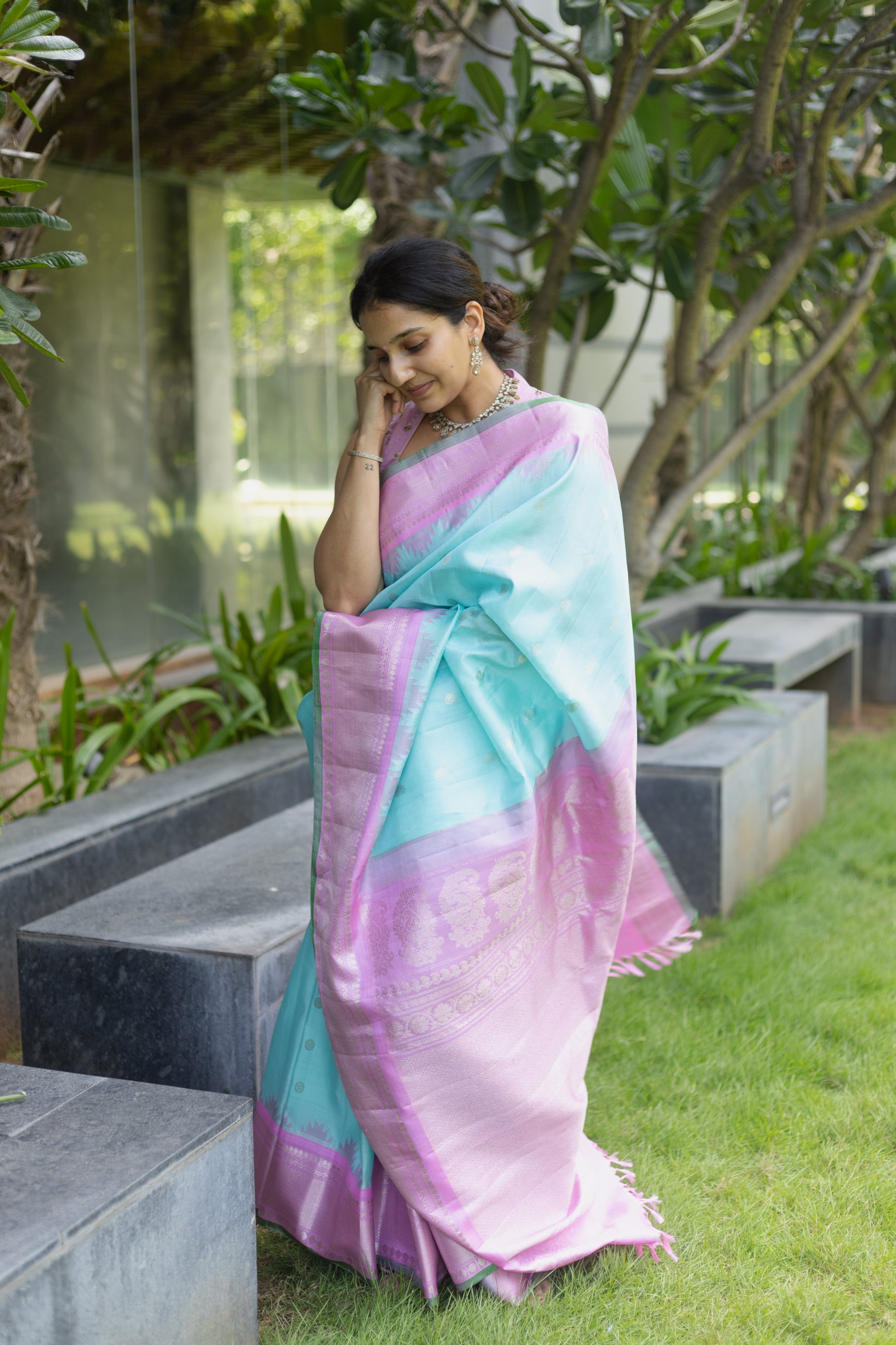 An ode to the women we first looked up to, and to the little girls we once were — dreaming of becoming them... Drape yourself in this whimsical handwoven Gadwal Silk saree in Powder blue.