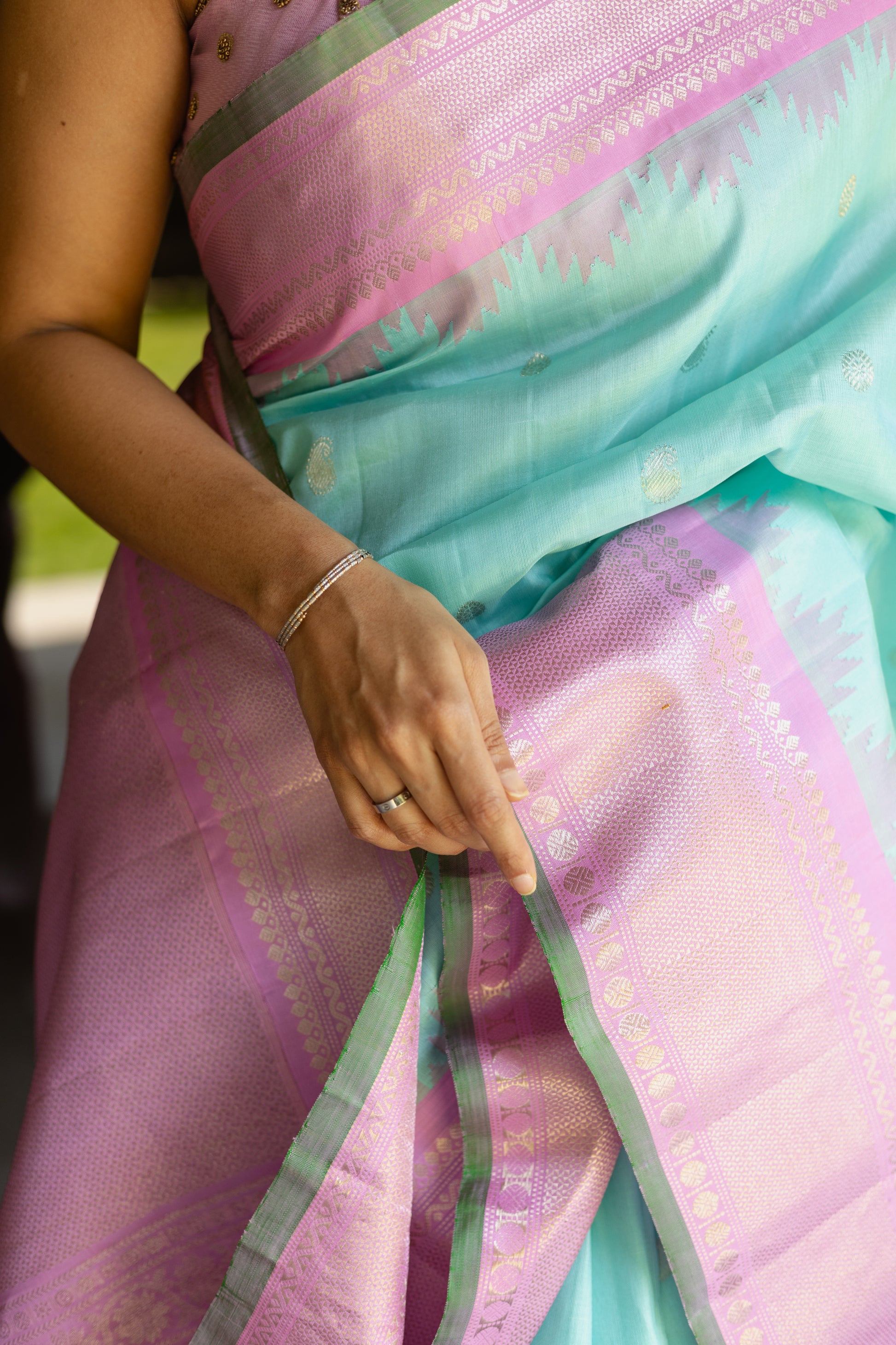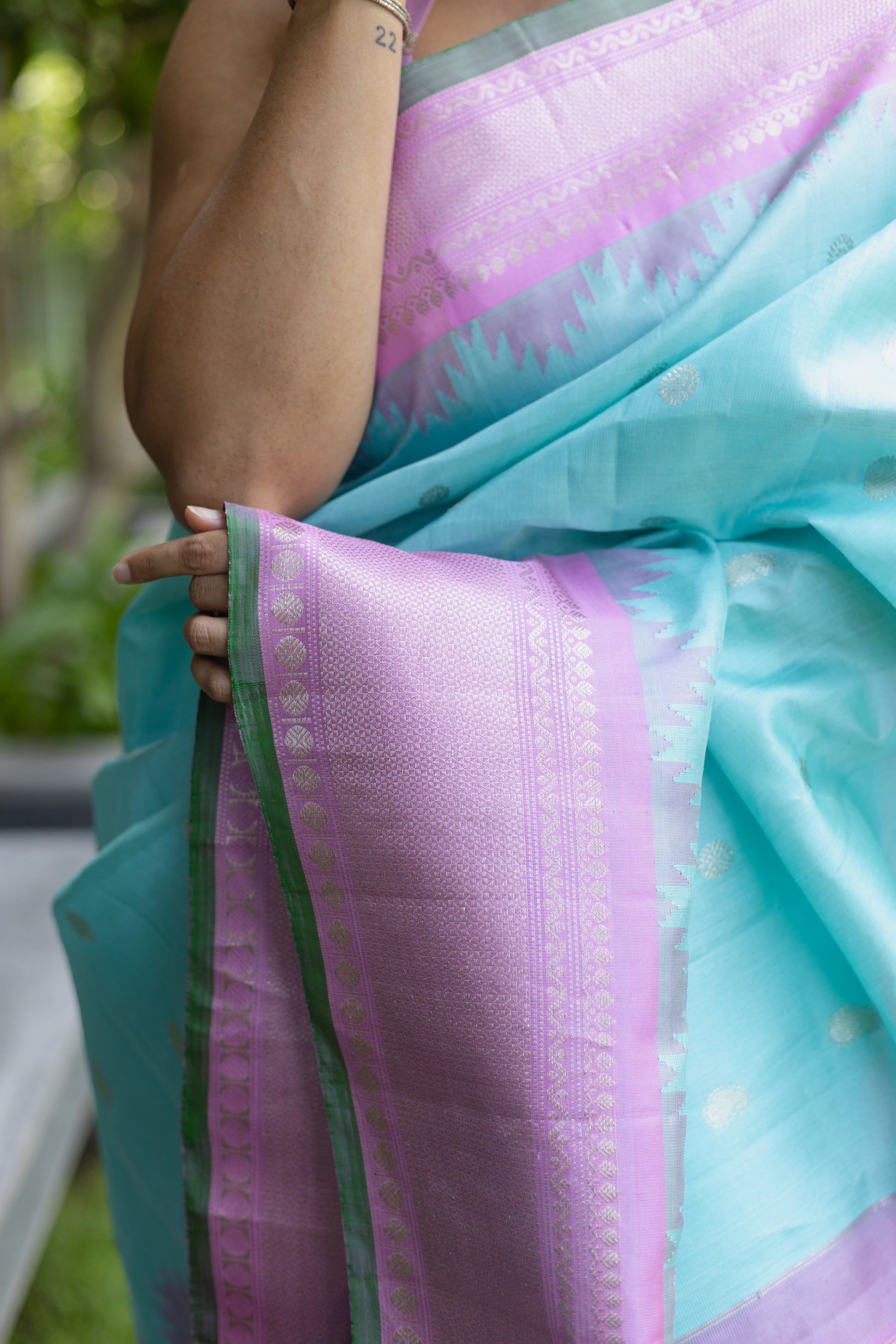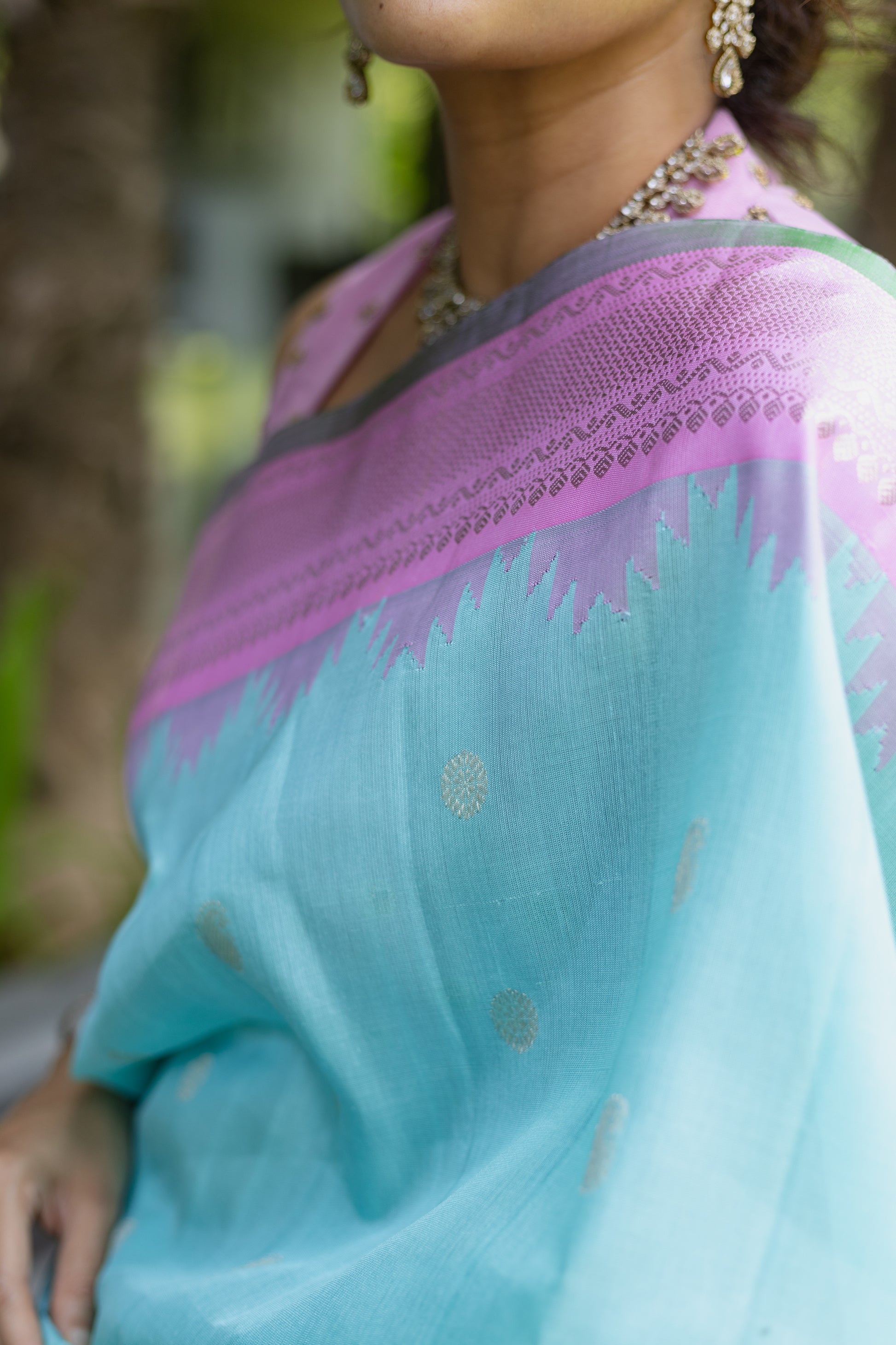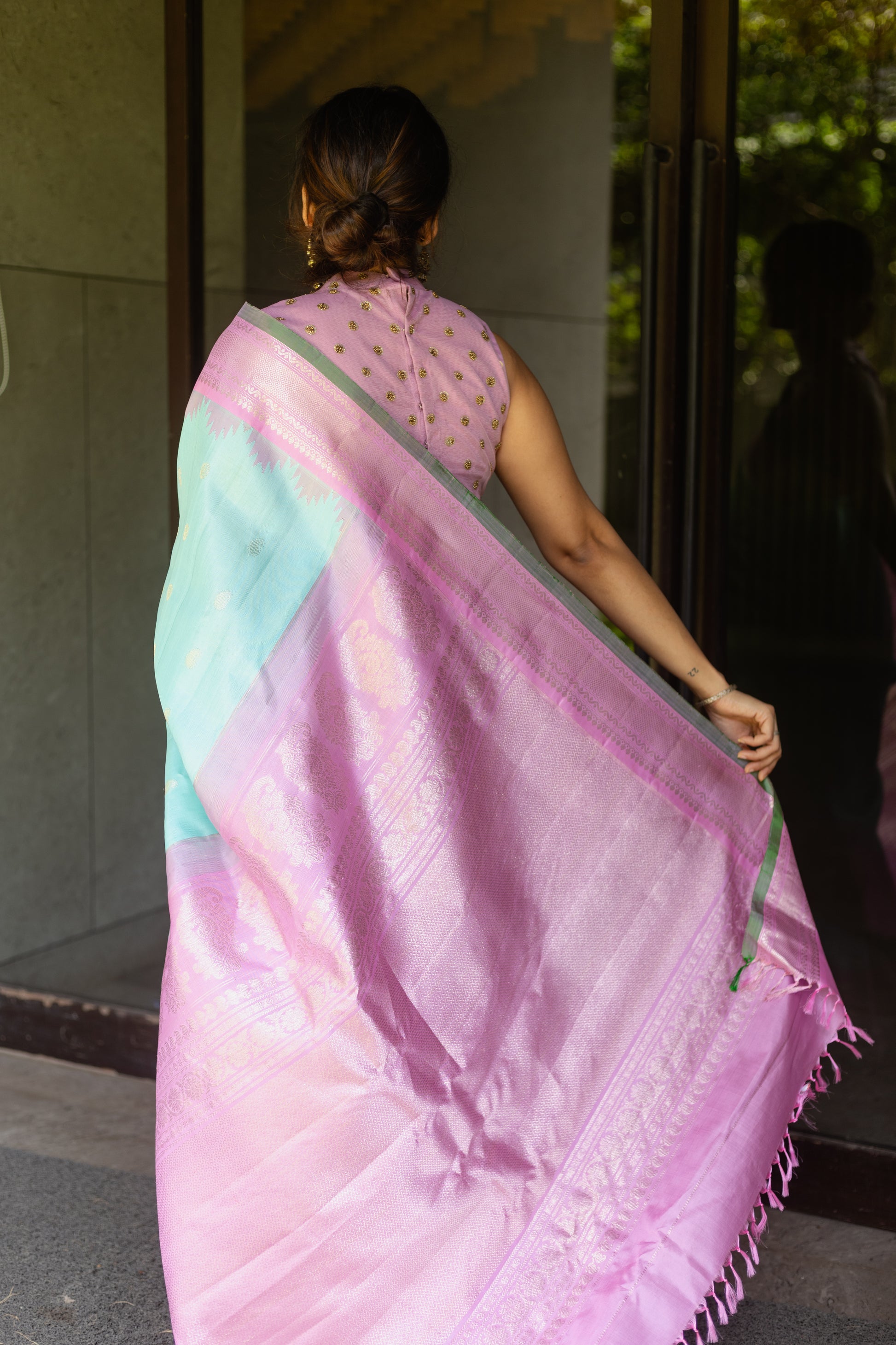 An ode to the women we first looked up to, and to the little girls we once were — dreaming of becoming them... Drape yourself in this whimsical handwoven Gadwal Silk saree in Powder blue.