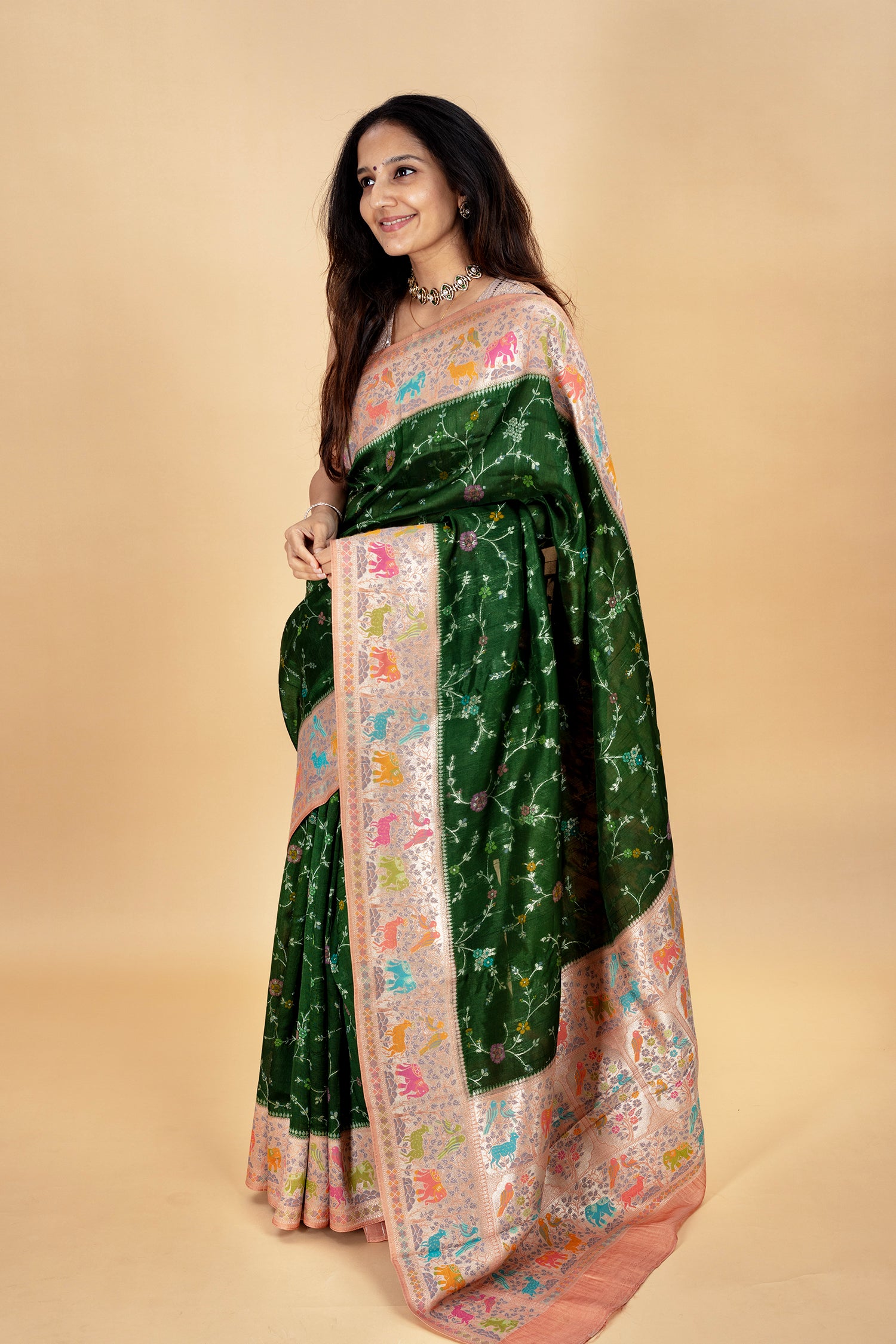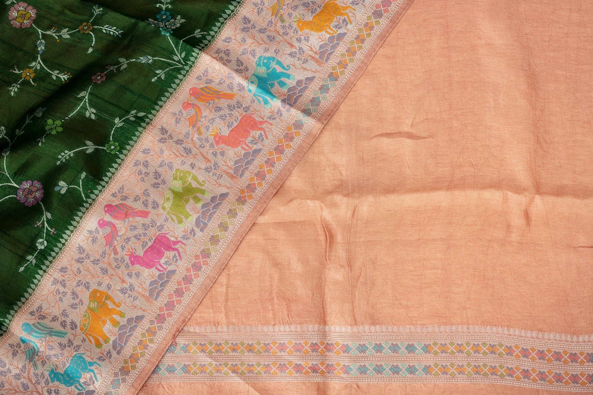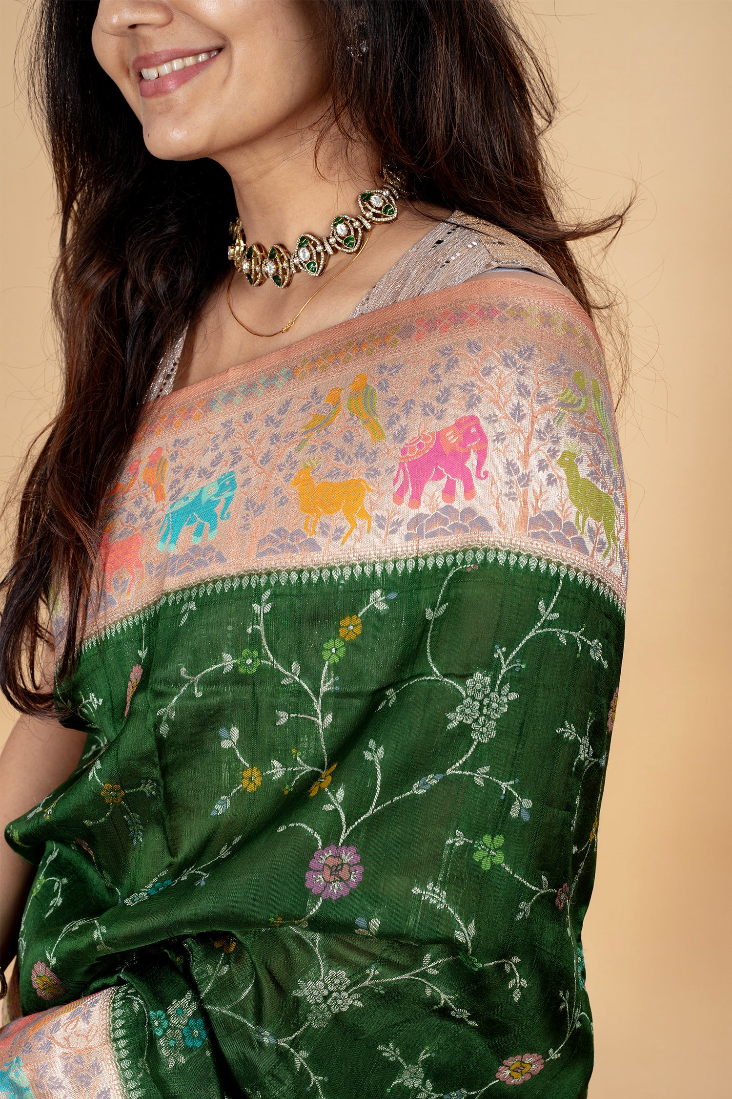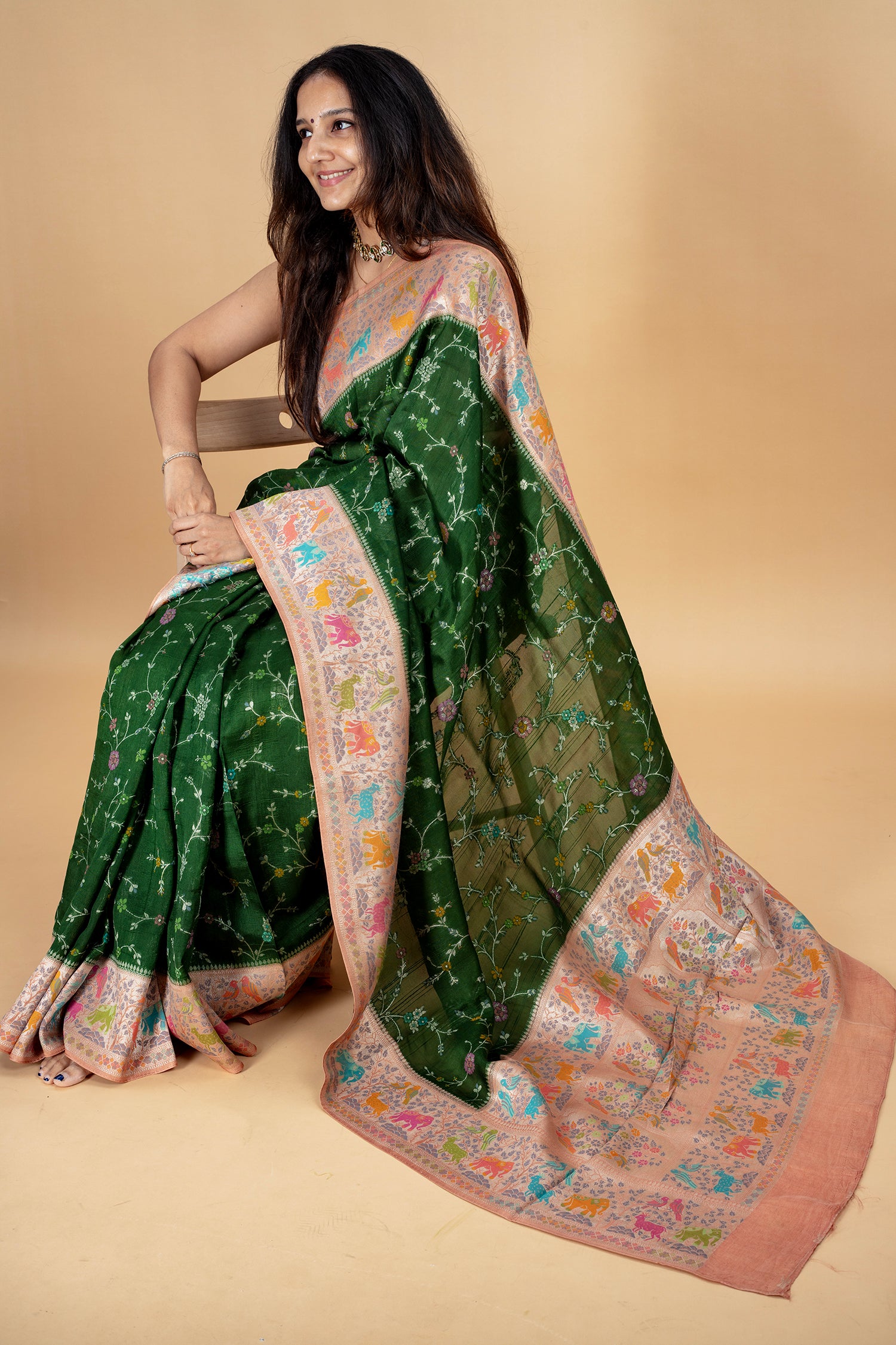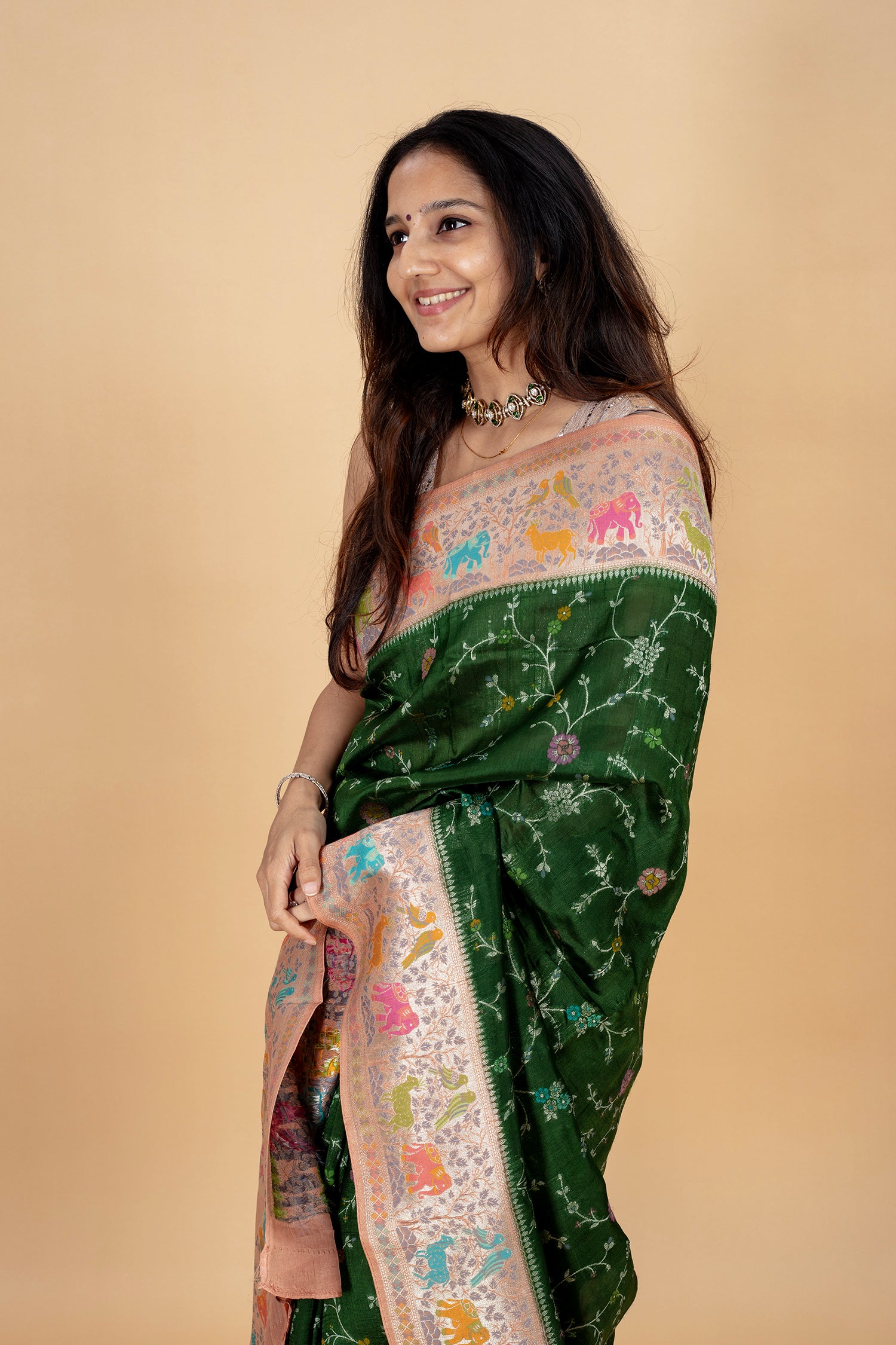- Banaras raw silk handwoven saree in bottle green with contrast pastel borders