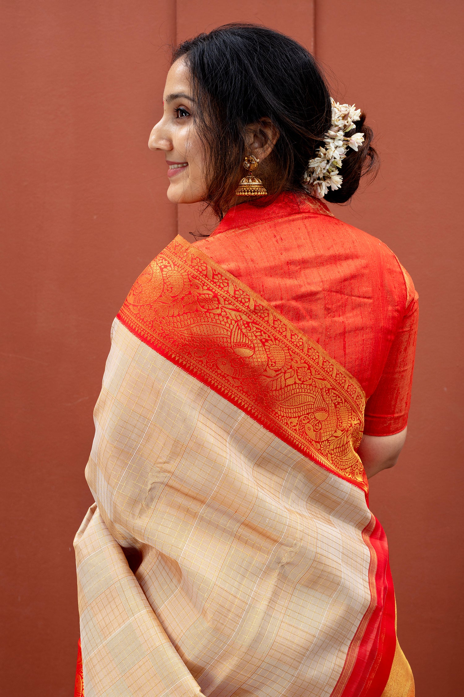 A timeless masterpiece, this handwoven Kanjivaram silk saree beautifully balances tradition with vibrance. The body glows in a rich pearl white, brought to life with an elegant saffron orange zari woven border and bavanchu pallu. The lustrous texture of pure silk drapes gracefully, making it perfect for festive occasions or special celebrations.
